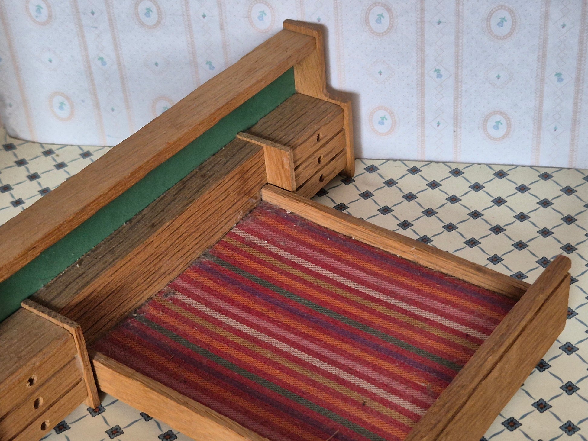 Pæn origial vintage dobbeltseng med stort hovedgærde, natborde og stribet sengelinned af Hanse af Skandinavien.