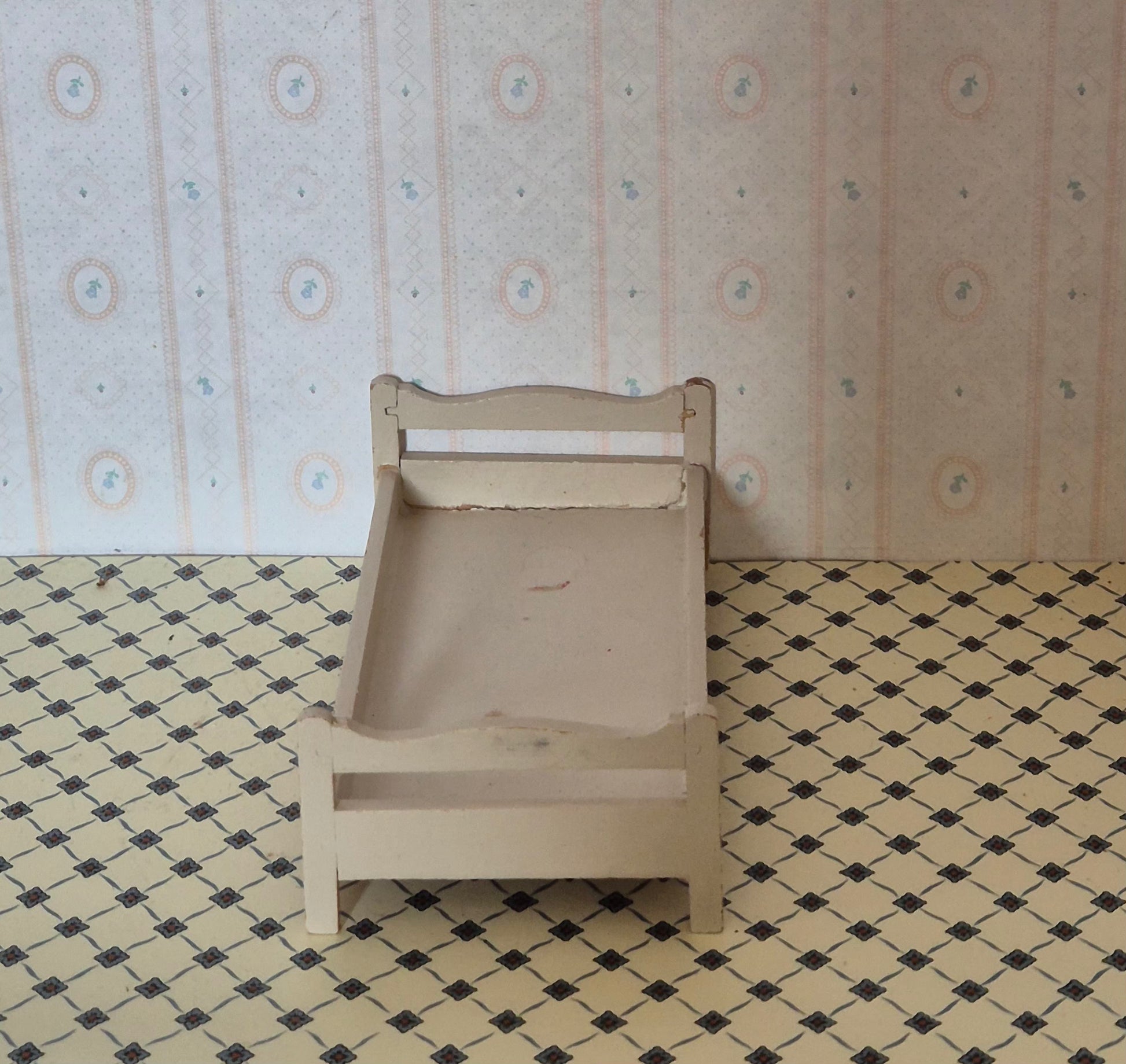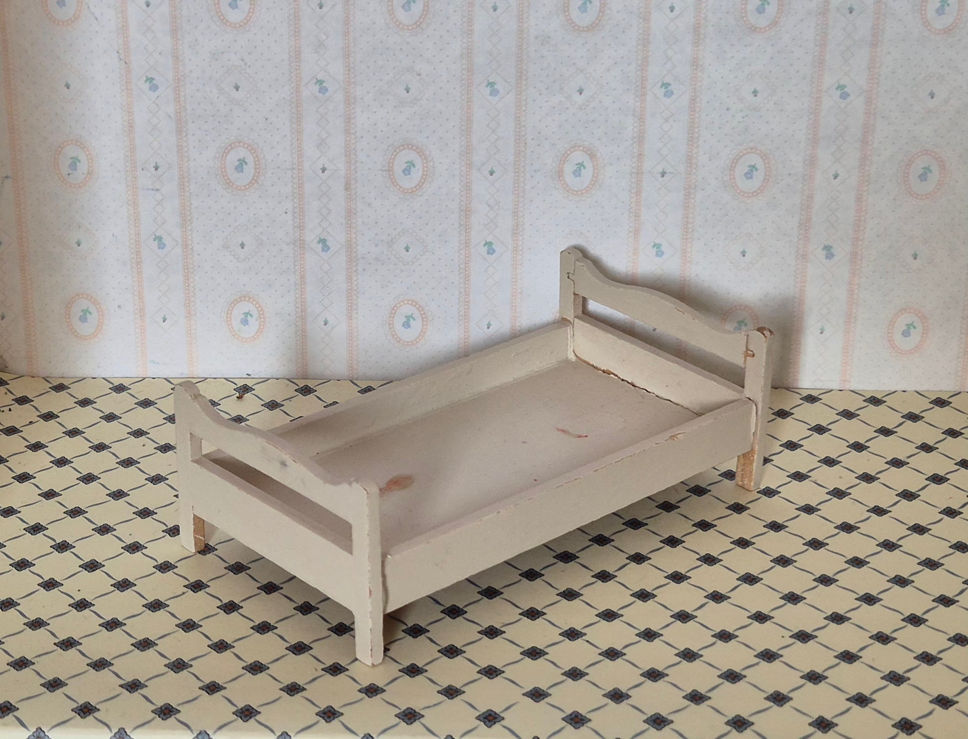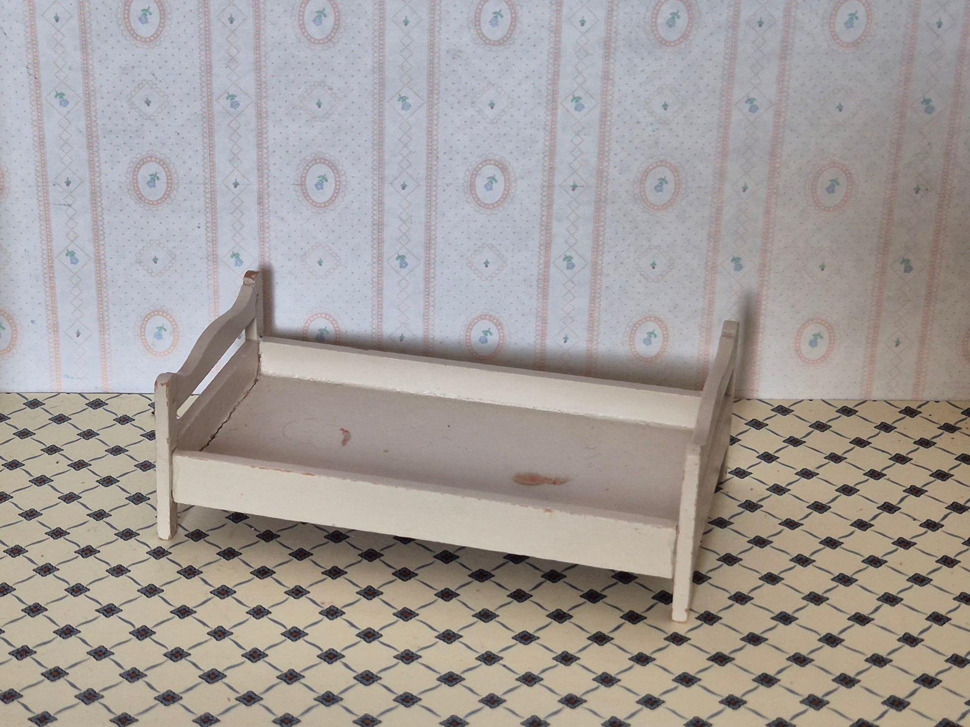 Vintage seng til dukkehuset af mærket Hanse af Skandinavien. Det er hvidt træ med patina og brugsspor, pletter og skrammer.