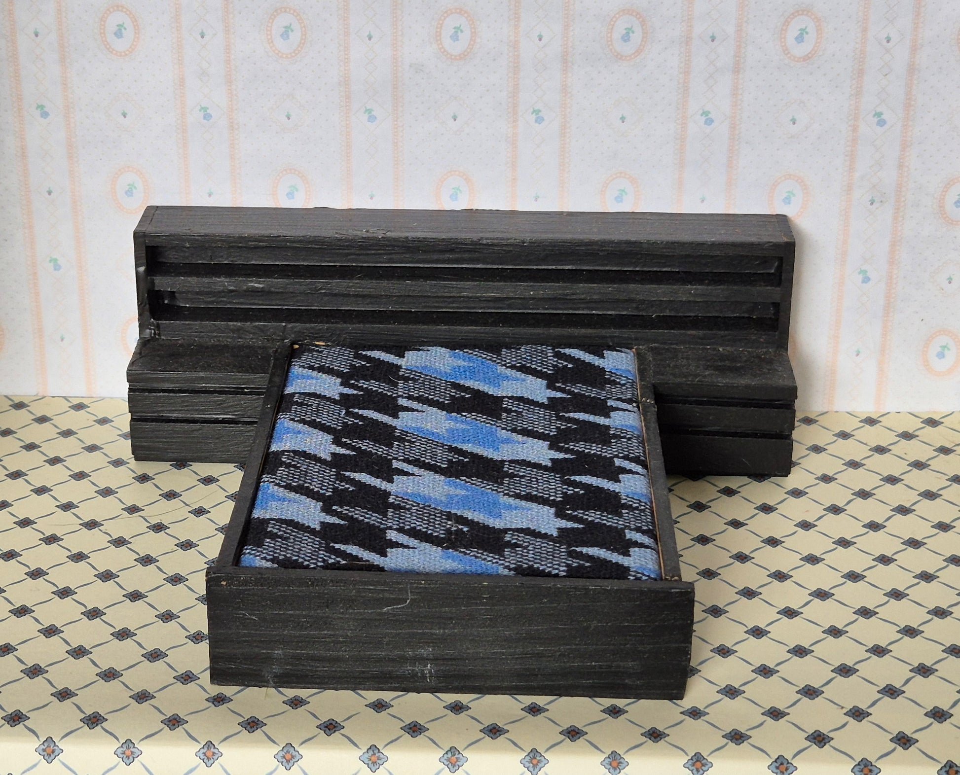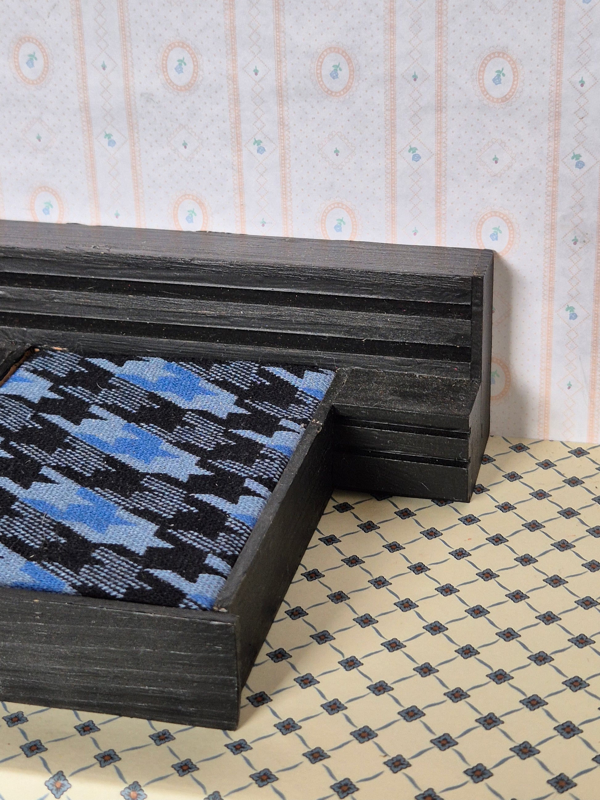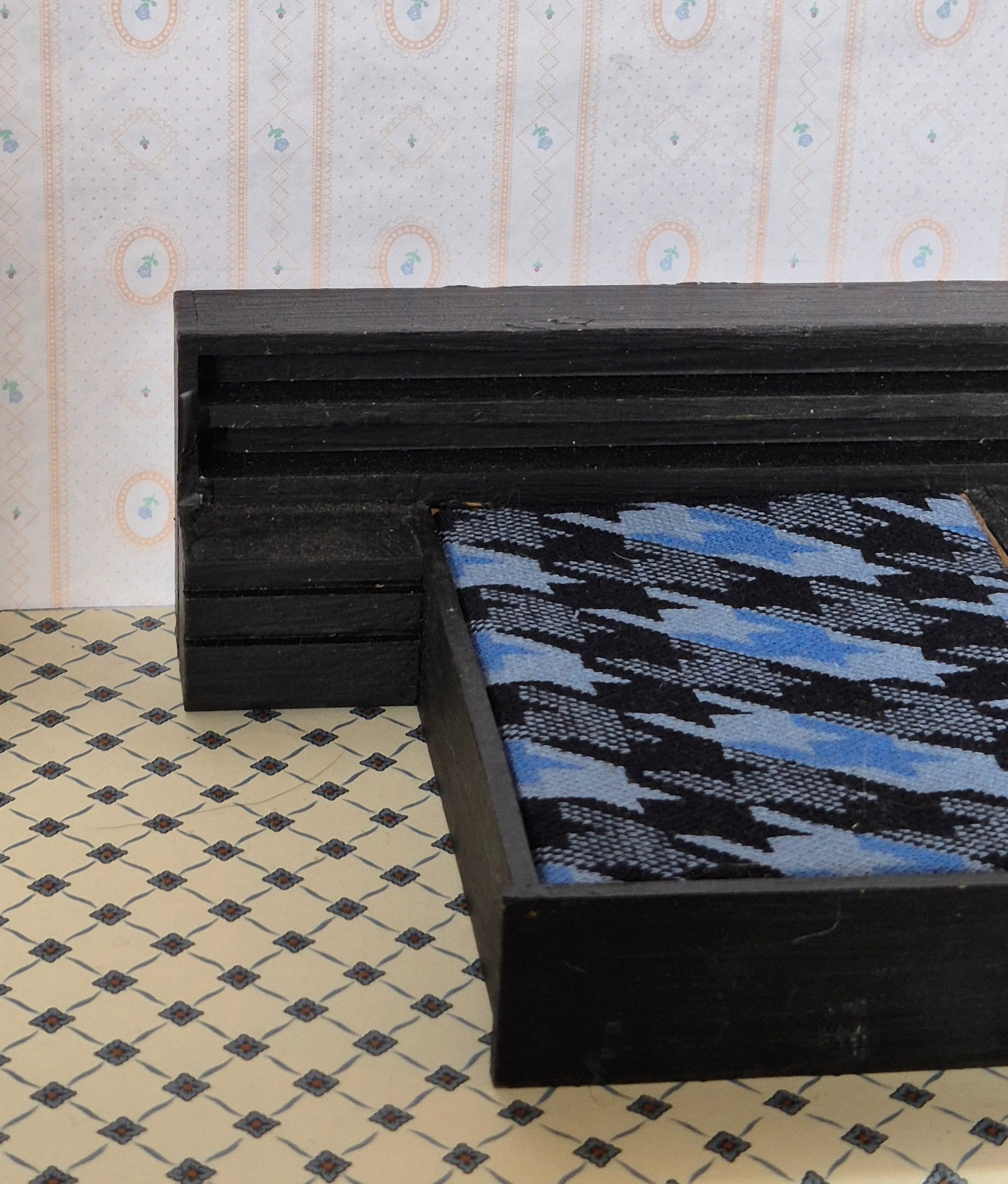 Sortmalet dobbeltseng til dukkehus soveværelse med stort hovedgærde af mærket Hanse af Skandinavien.
