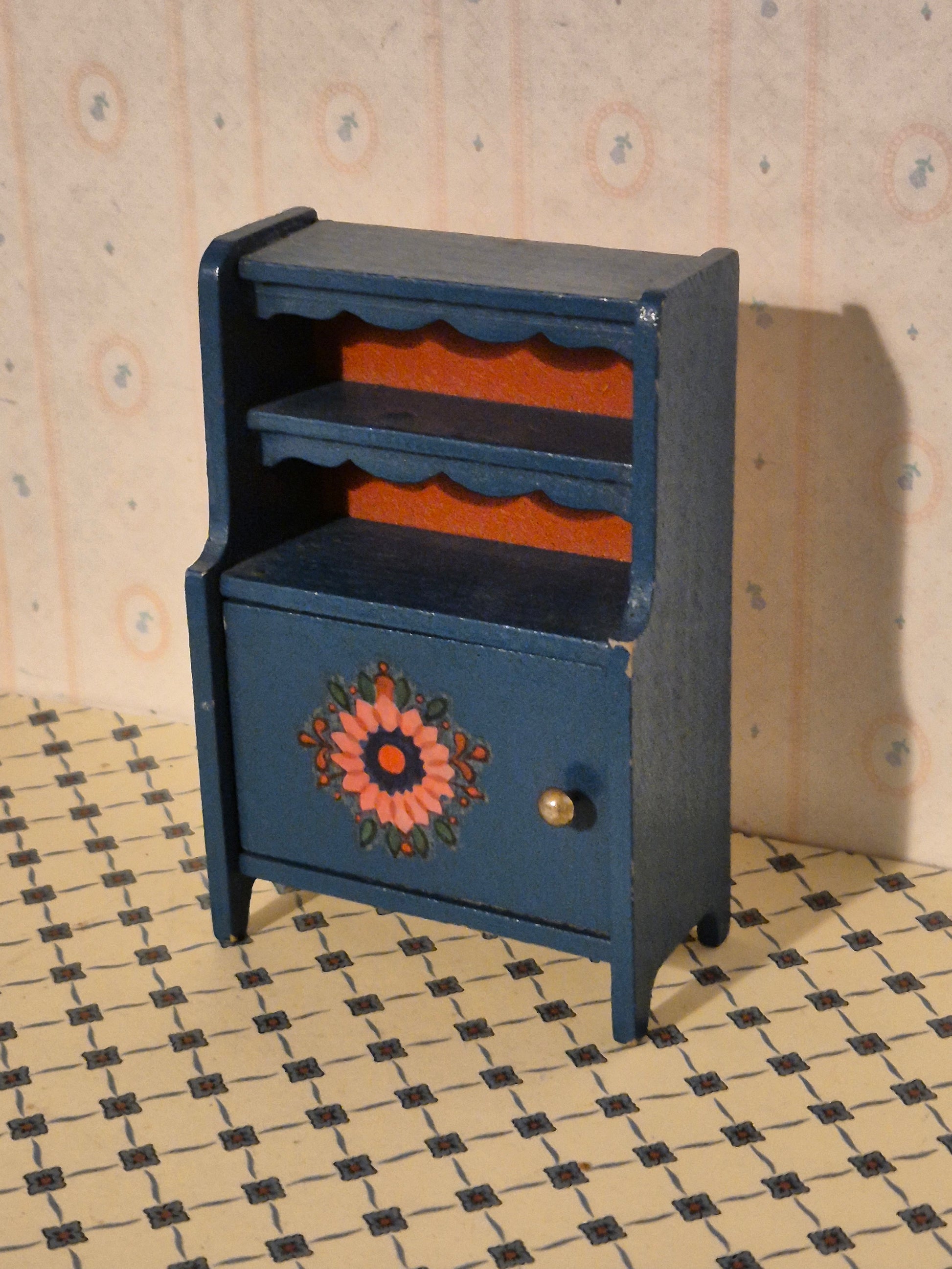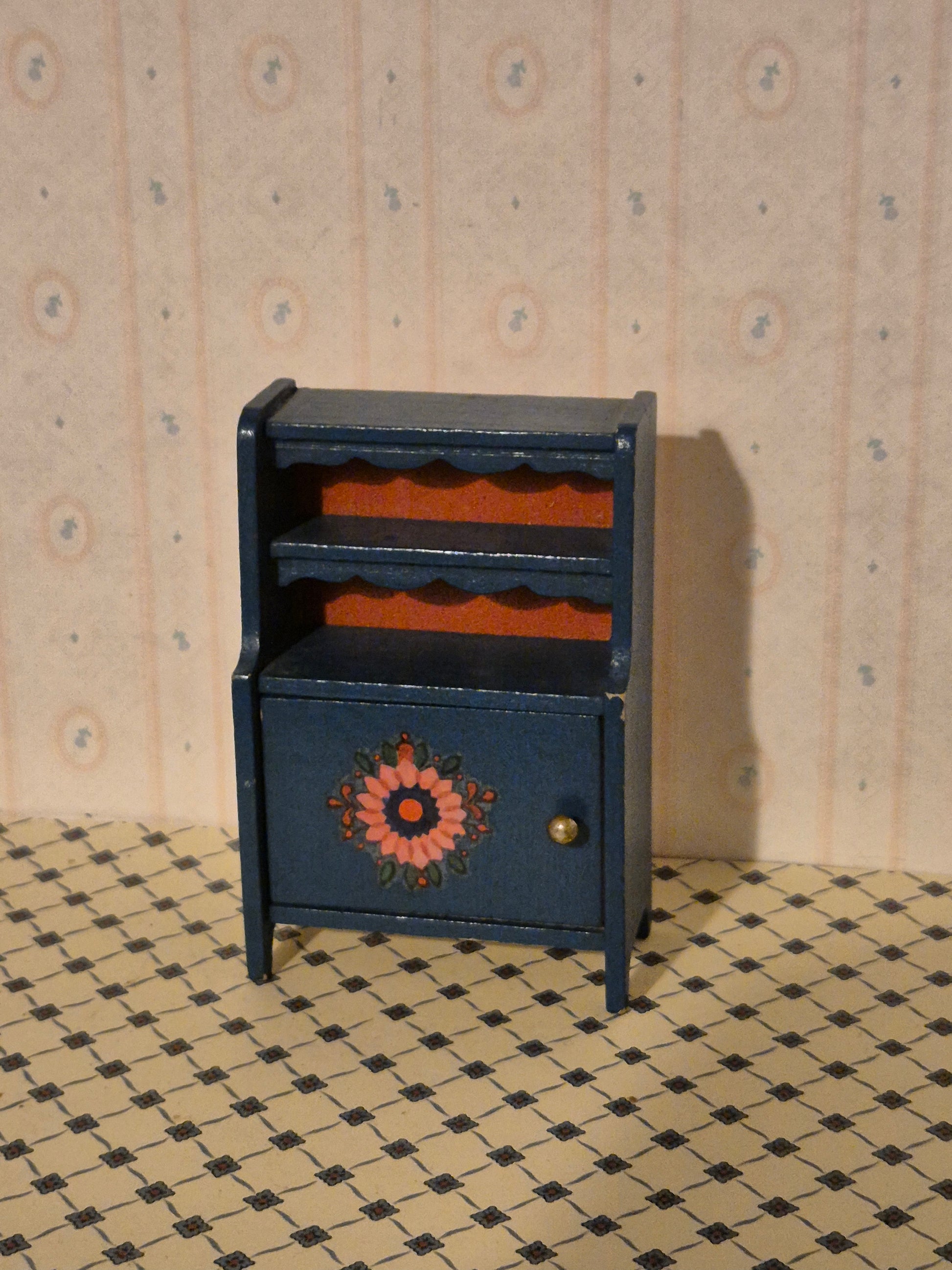 Pænt vintage skab/reol af mærket Hanse af Skandinavien. Det er aæmue stil i mørkeblåt og rødt. Der er patina og brugsspor