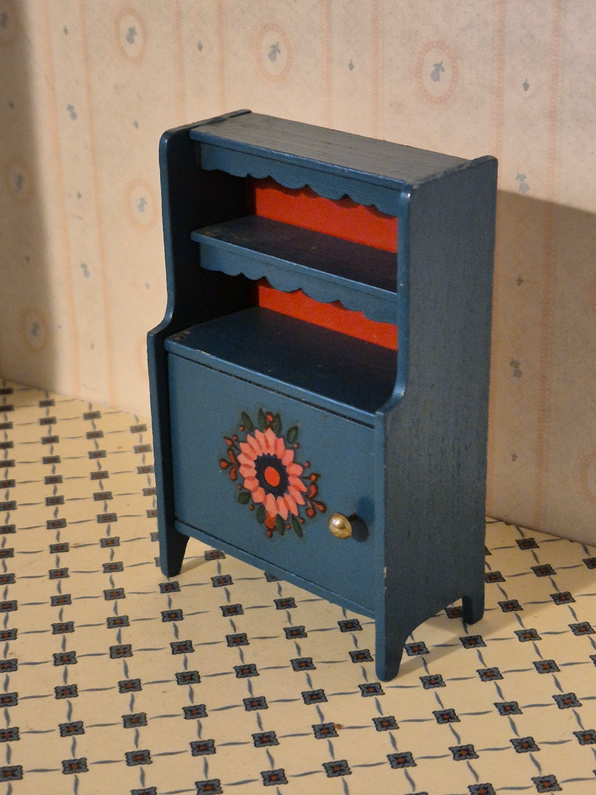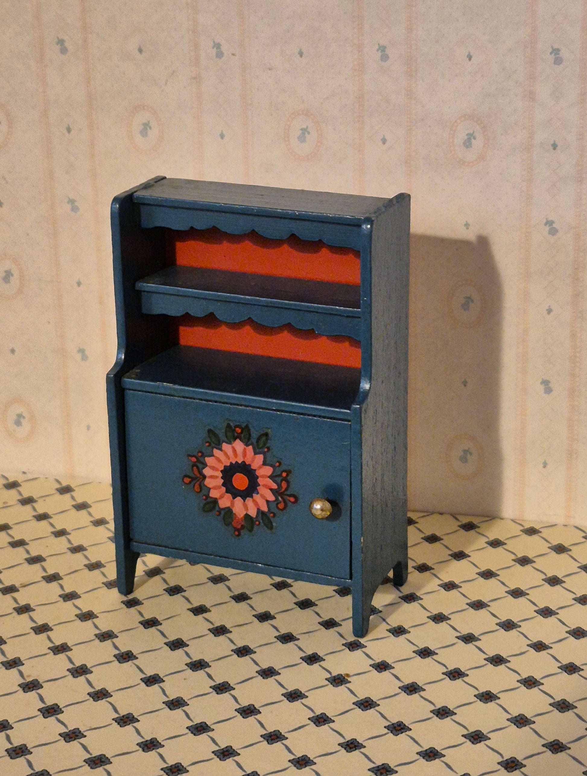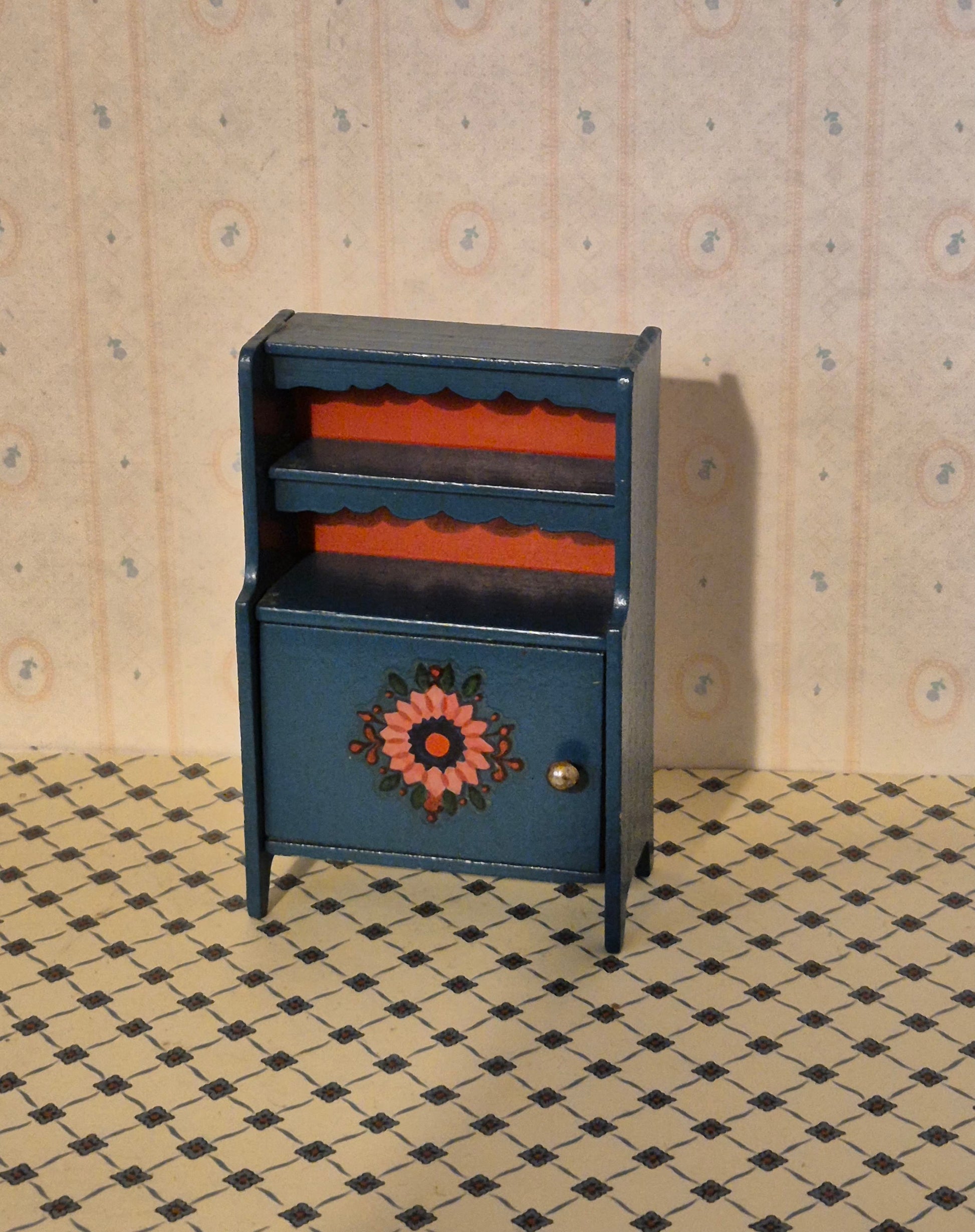 Pænt mørkeblåt og rødt skab i almue stil. Det har hylder og en låge.