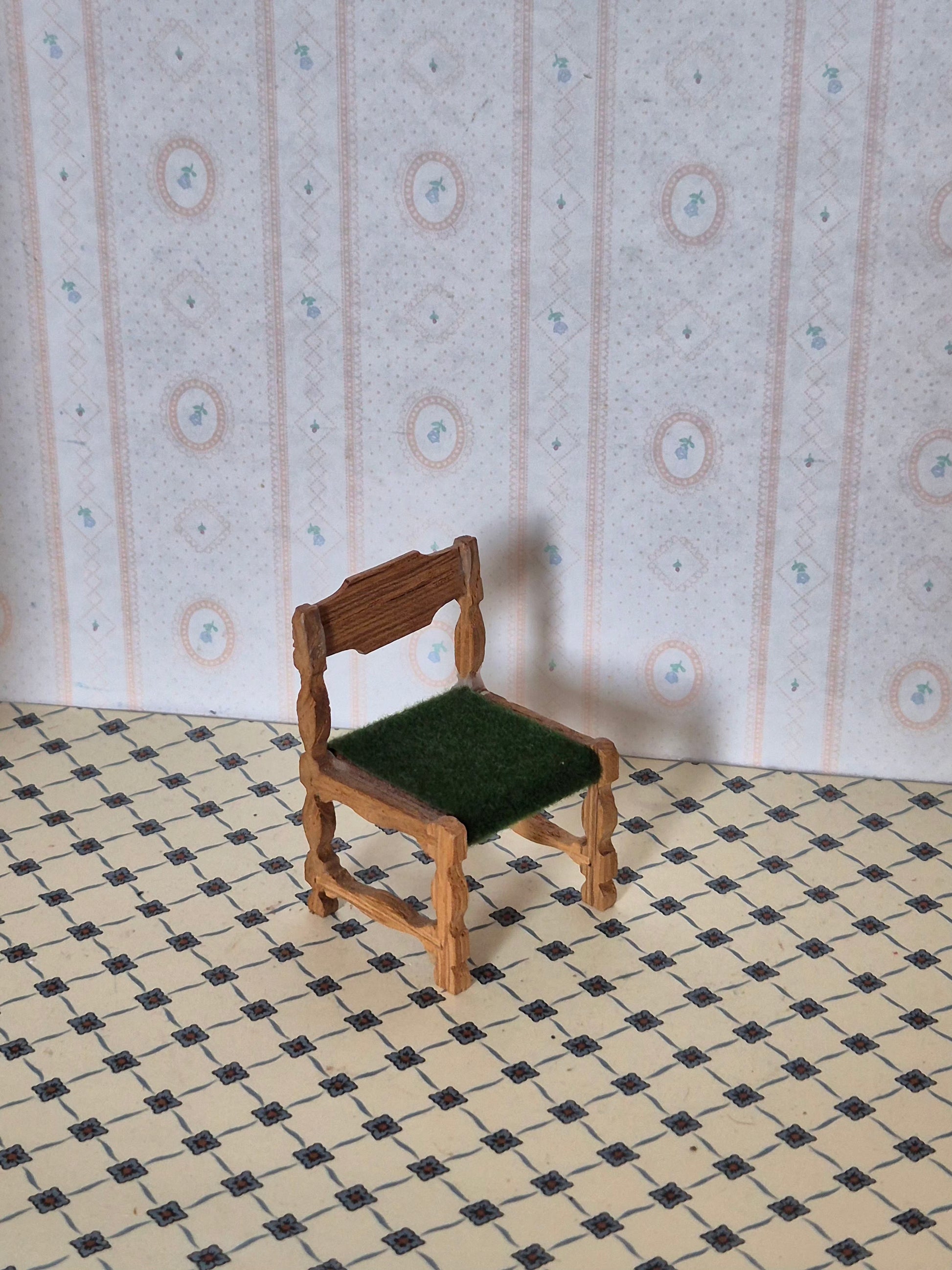 God og fin egetræ stol med grønt sæde. Den har pæne udskæringer og detaljer.