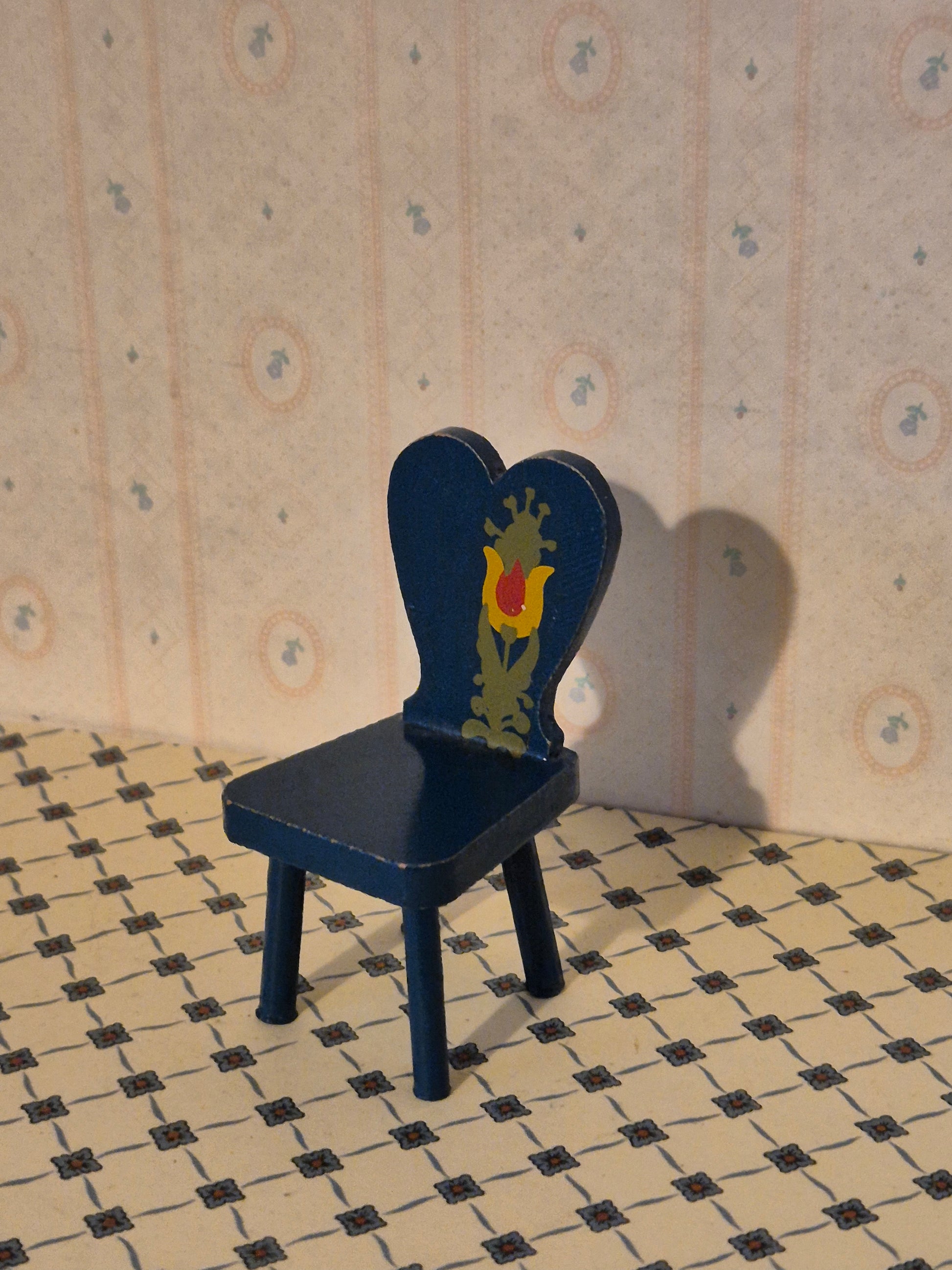 Pæn Hanse af Skandinavien stol til dukkehuset 1:16. Blomstermotivet hælder til den ene side.