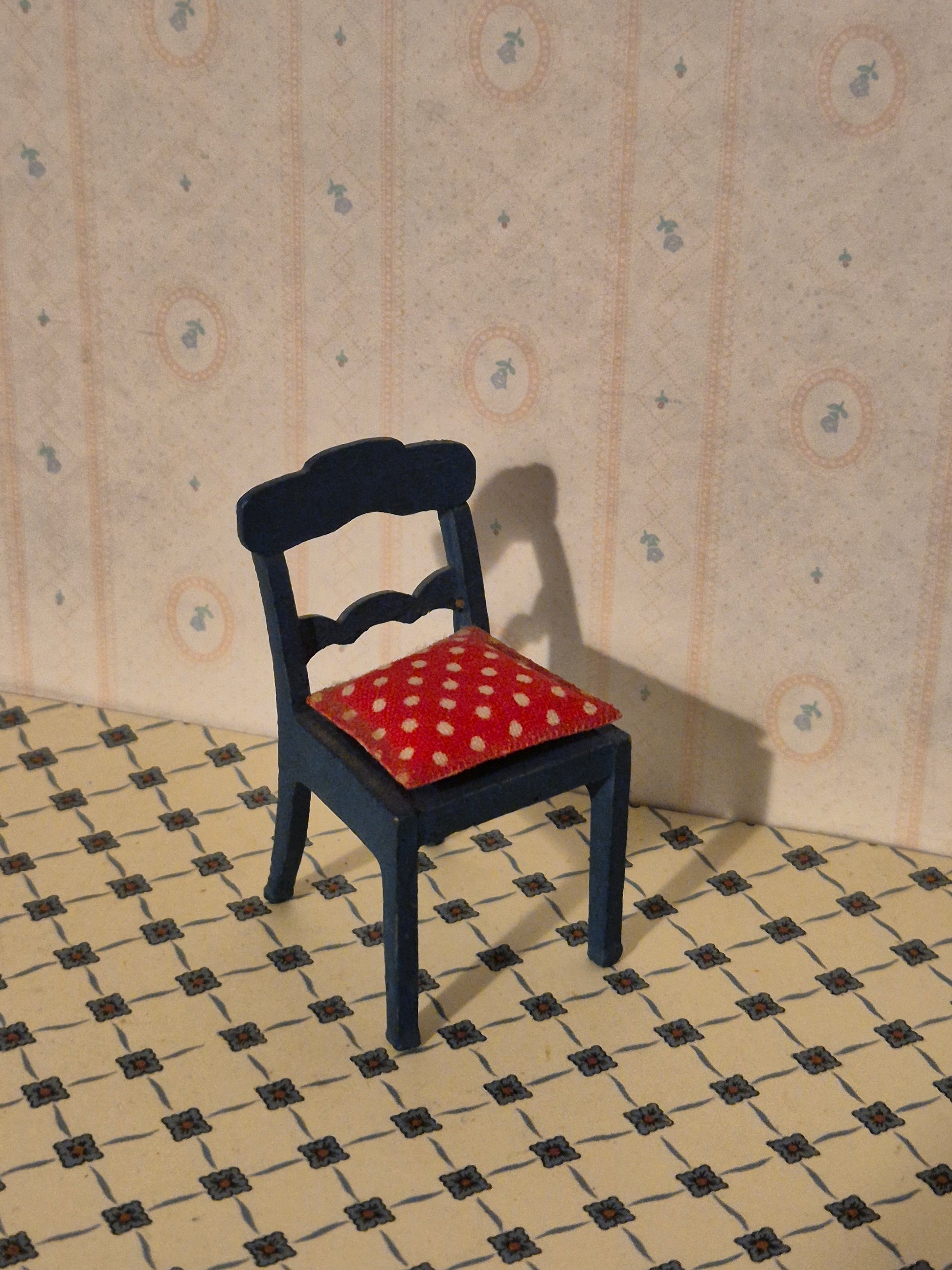 Pæn Hanse af Skandinavien mørkeblå almue stol med rødt og hvid prikket sæde.
