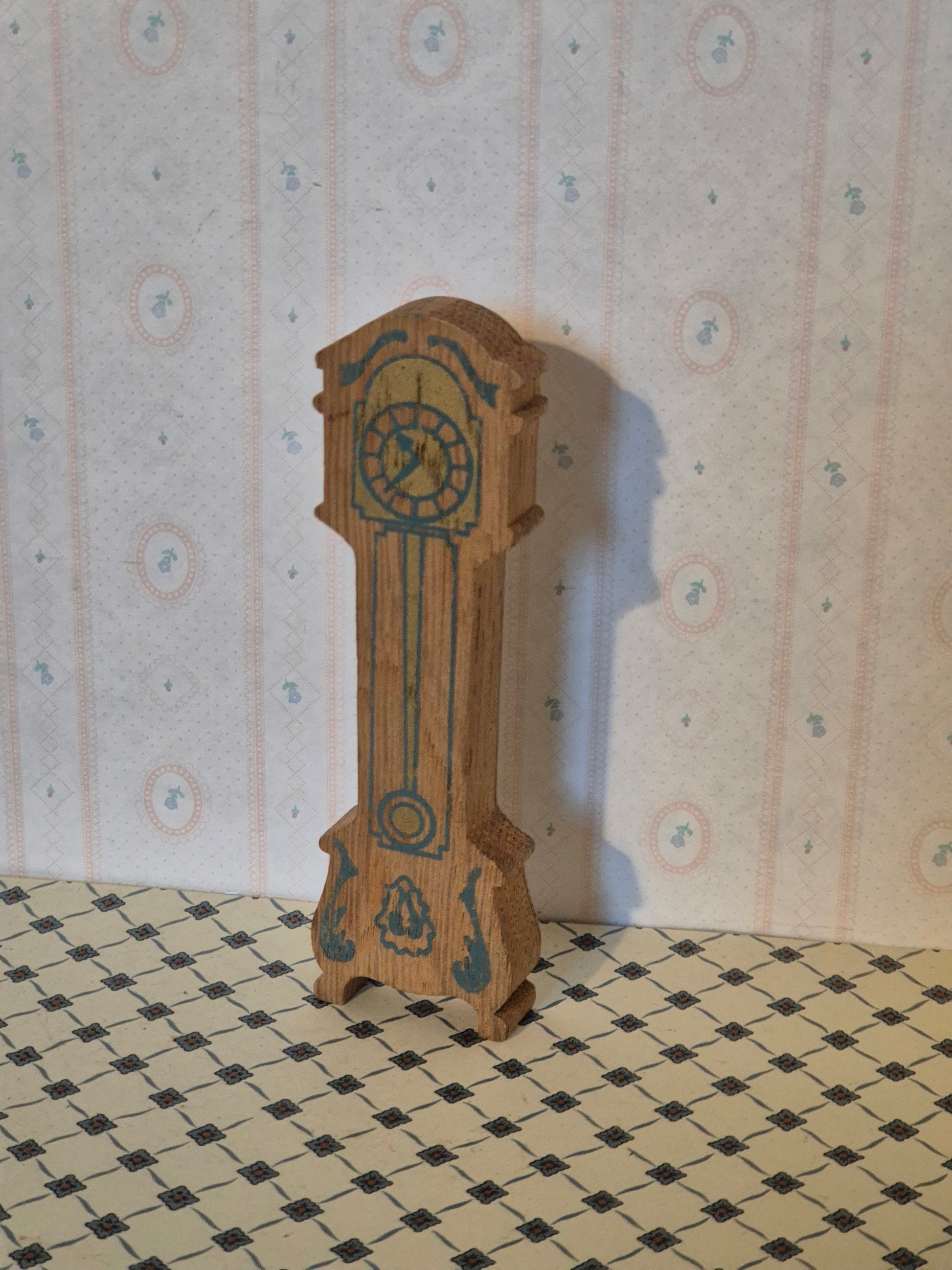 Pænt ældre dukkehus 1:16 ur i egetræ med pæne blå detaljer og udskæringer. Der er patina og brugsspor.