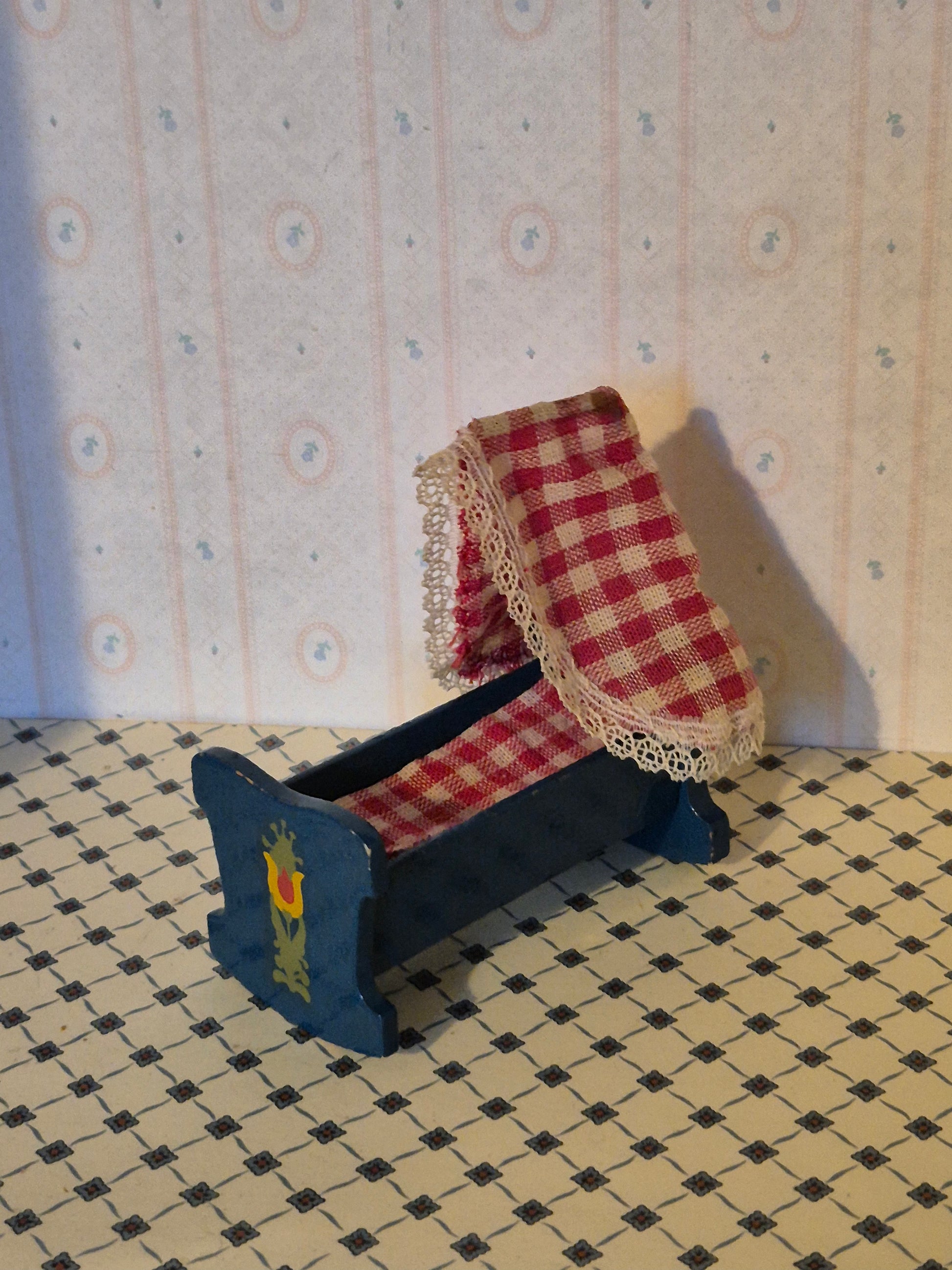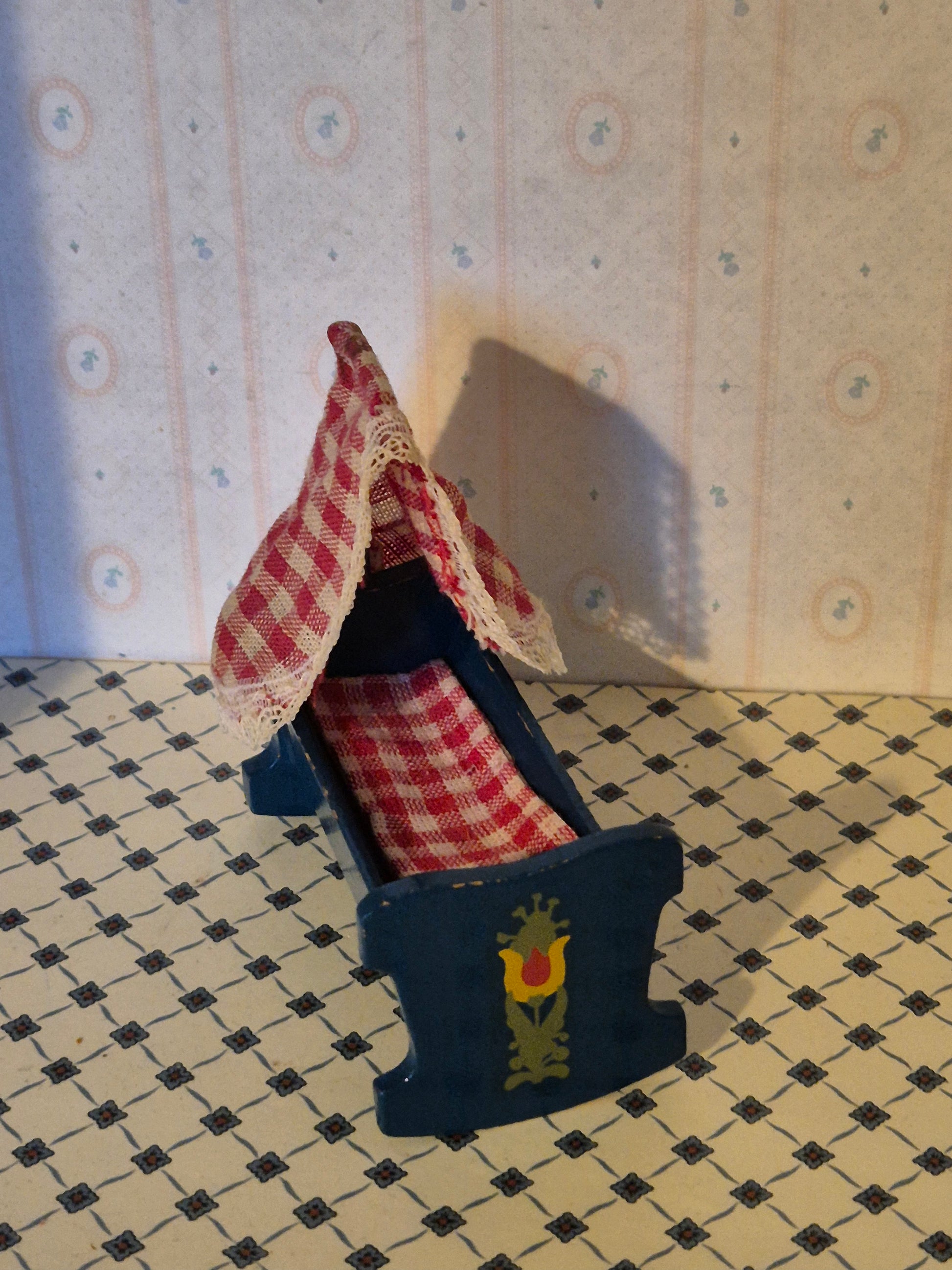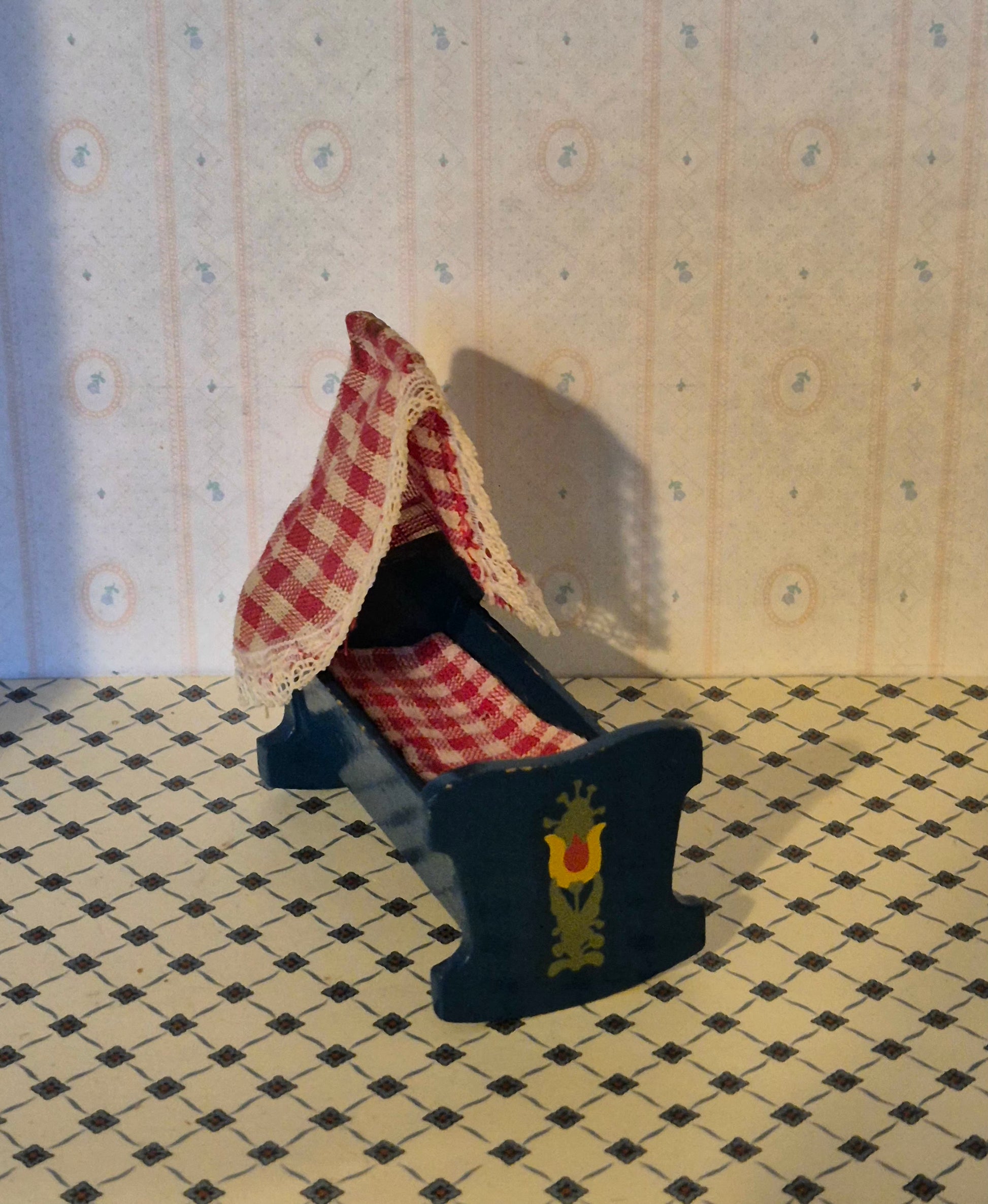 Rigtig pæn og fin mørkeblå almue vugge 1:16 af mærket Hanse af Skandinavien, dansk design. Den er intakt og original.