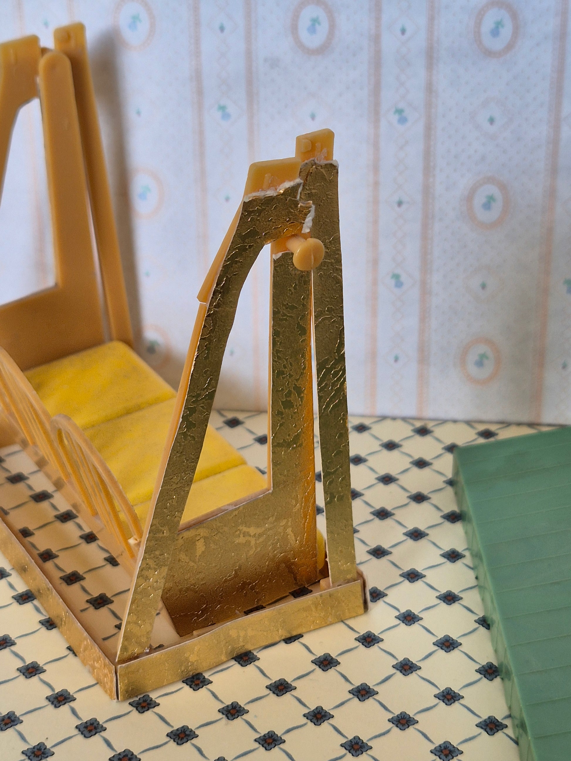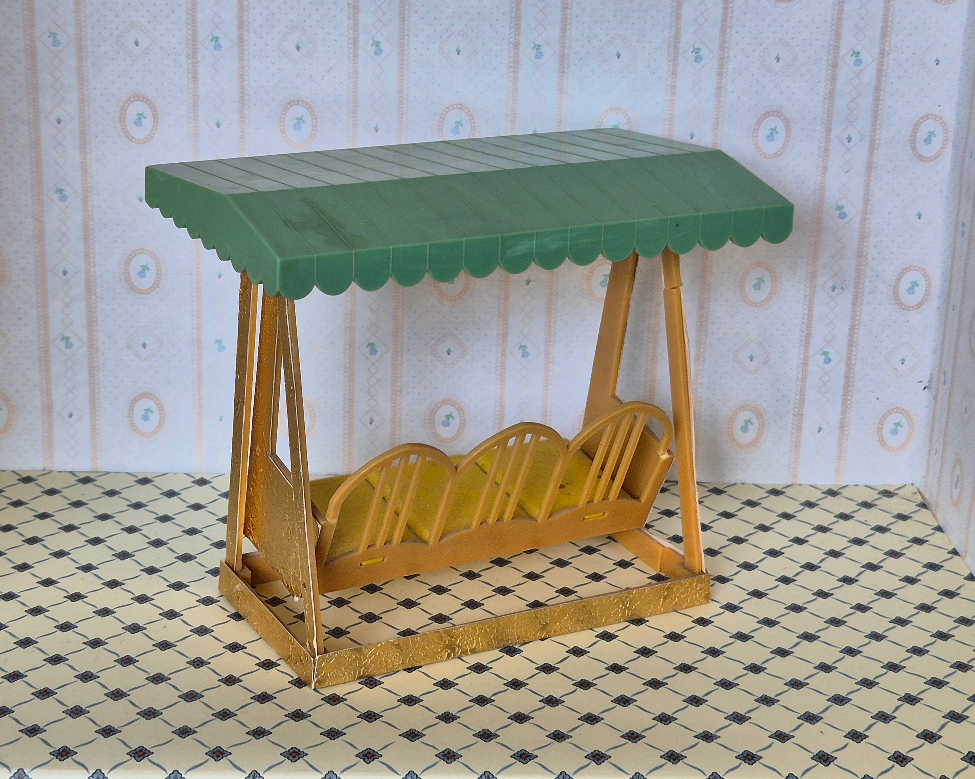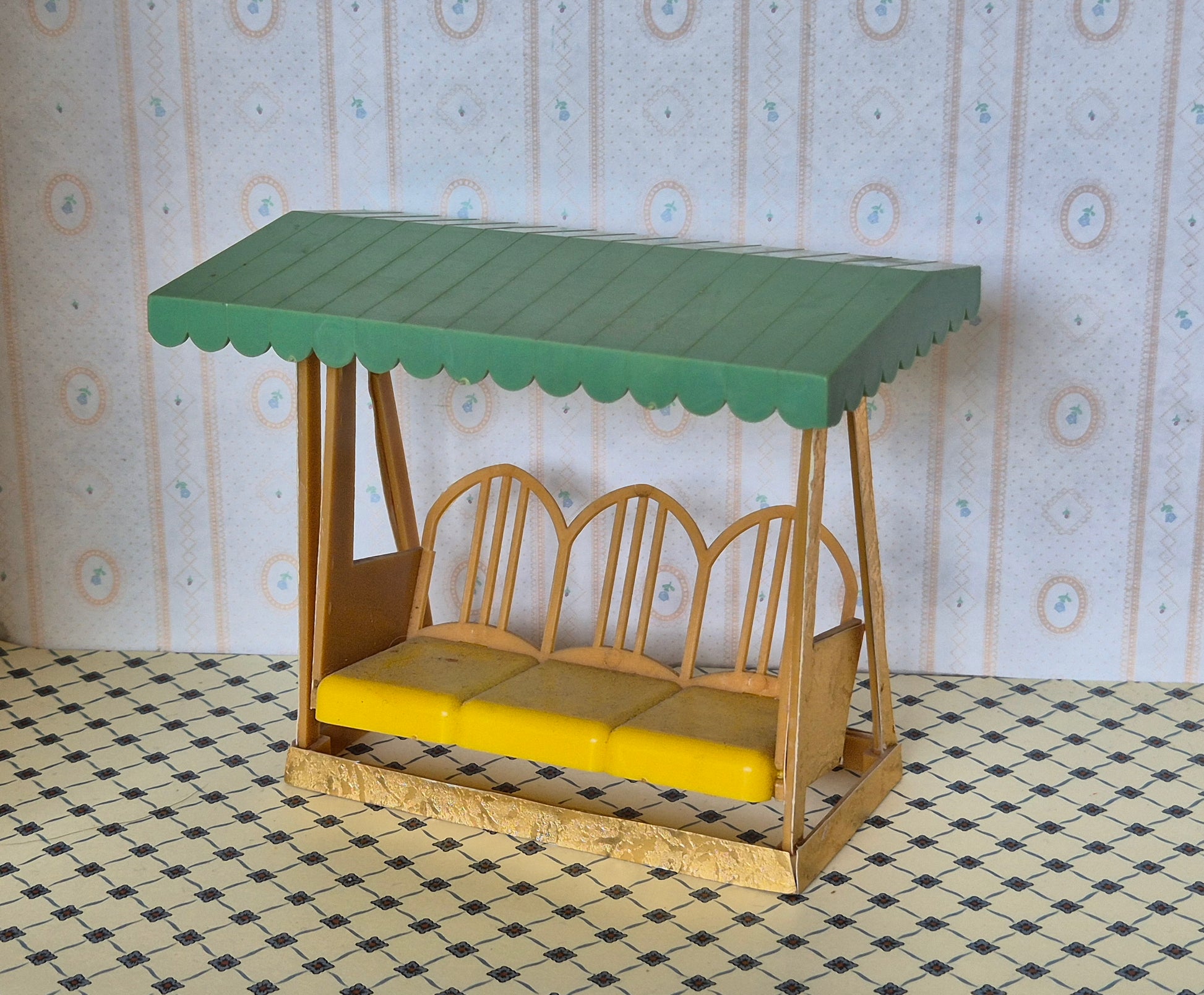 Vintage Jean West Germany havegynge af plastik. Den har fået gyldent papir på stellet, den er knækket i øverste led og der er den i stykker.