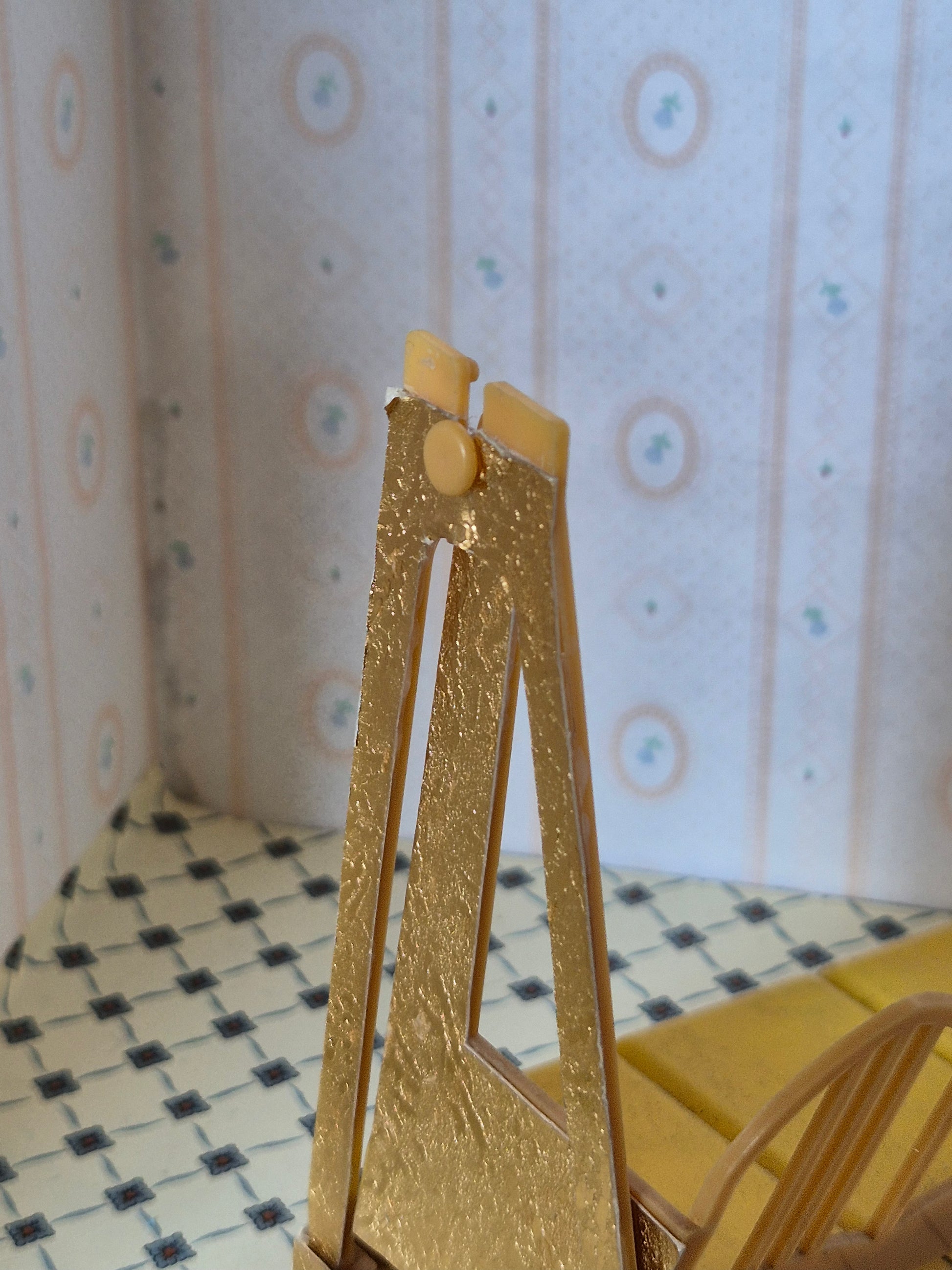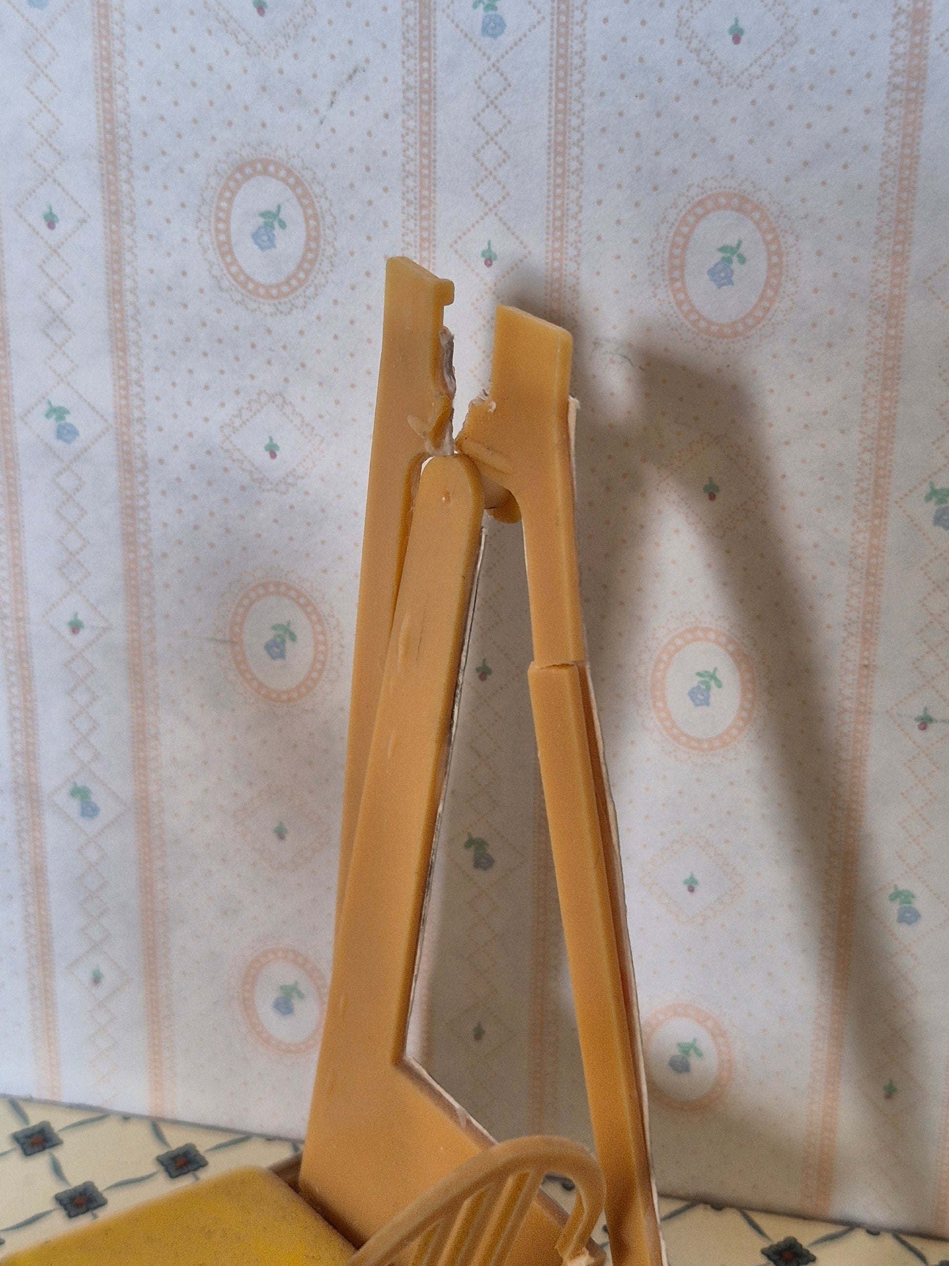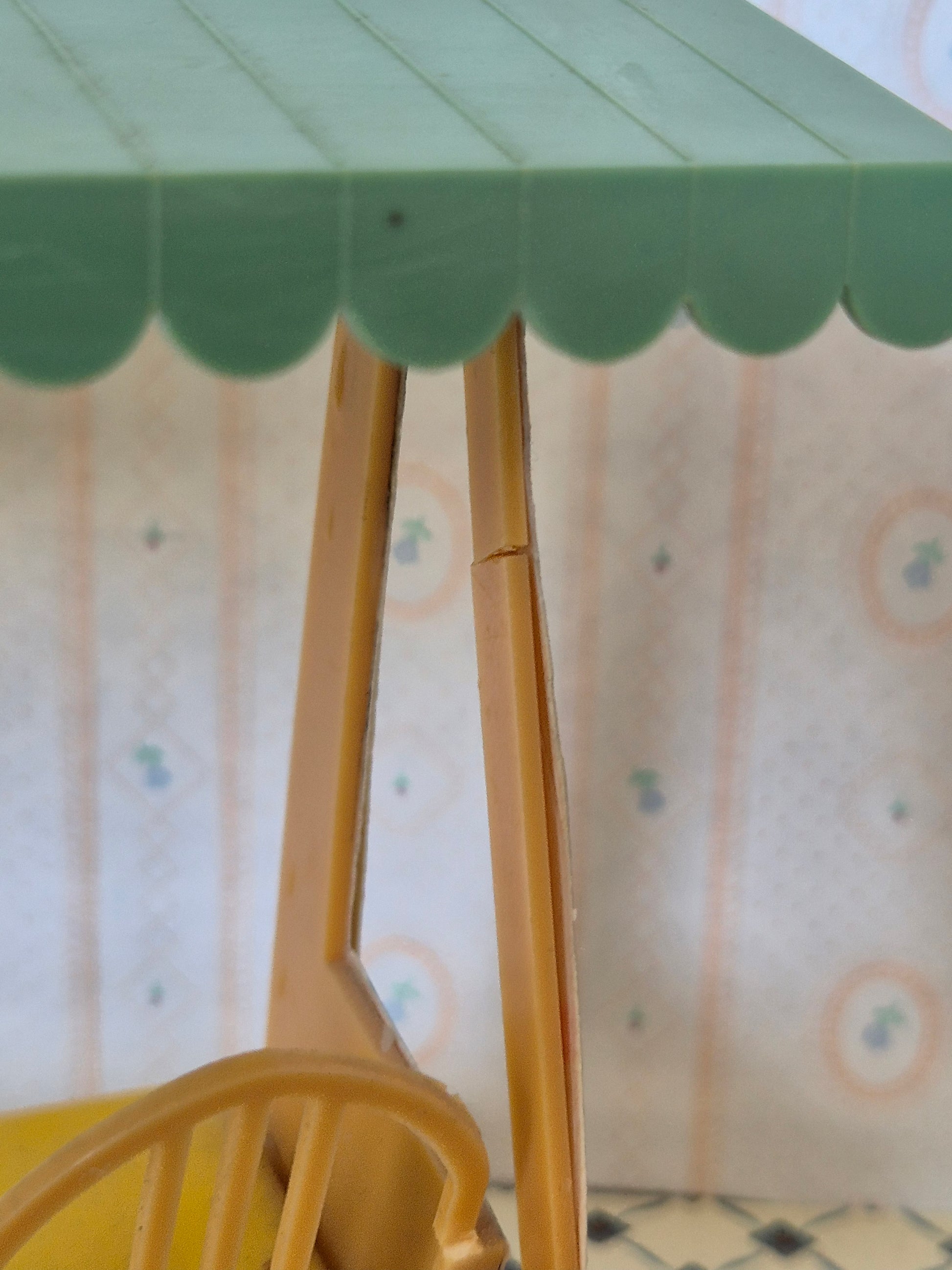 Vintage Jean West Germany havegynge af plastik. Den har fået gyldent papir på stellet, den er knækket i øverste led og der er den i stykker.