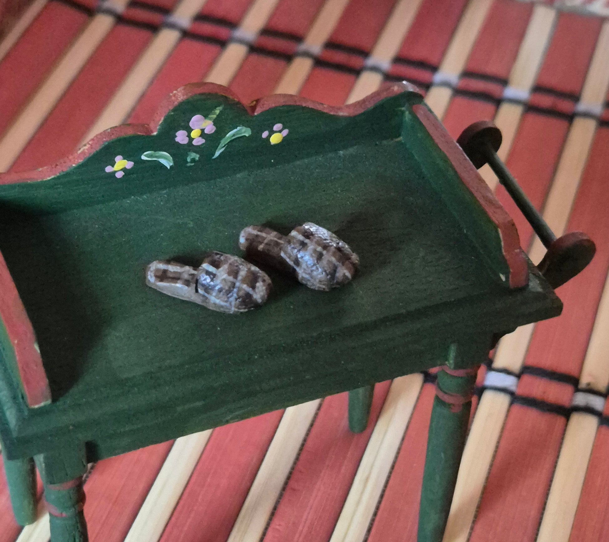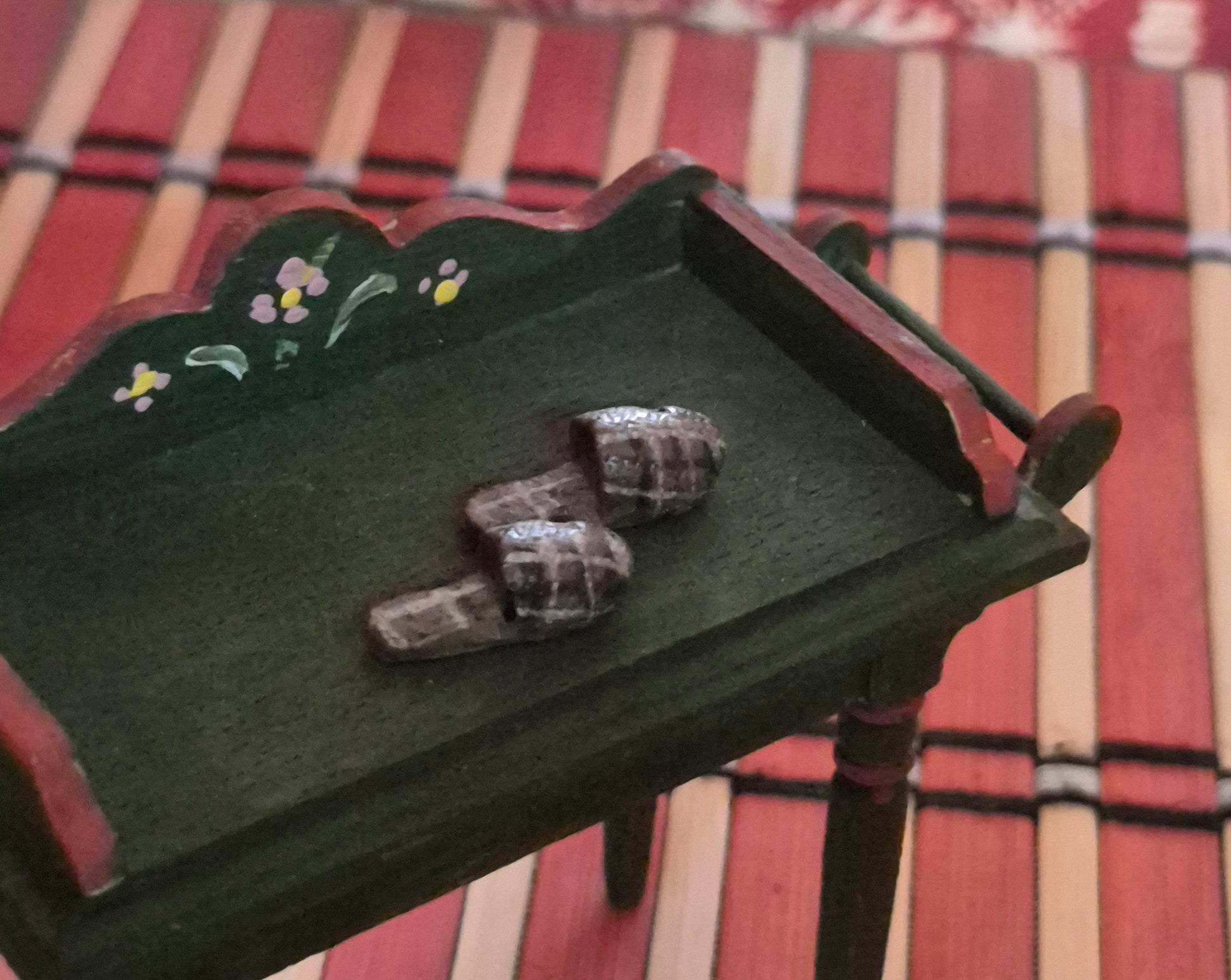Fint par hjemmesko til dukken i dukkehuset. De er brune med lyse tern. De er lavet af polyresin.