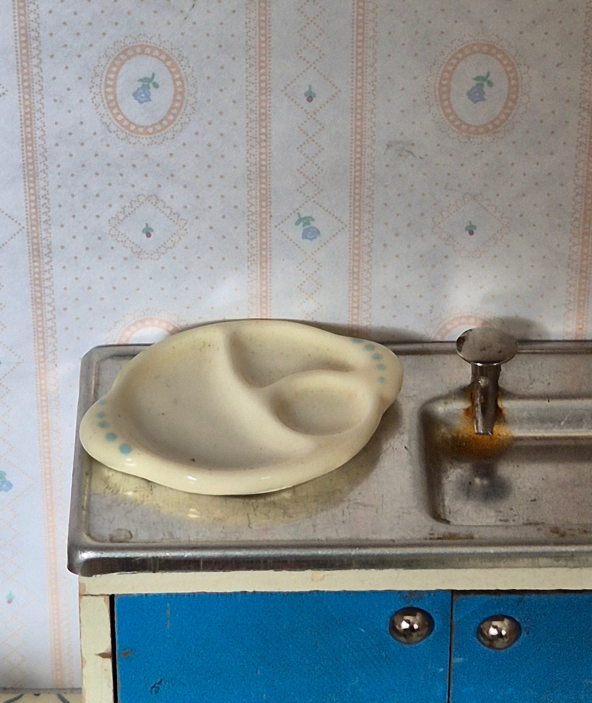 Inddelt fad eller større tallerken af plast. Udmærket stand. Blå prikker på håndtag.