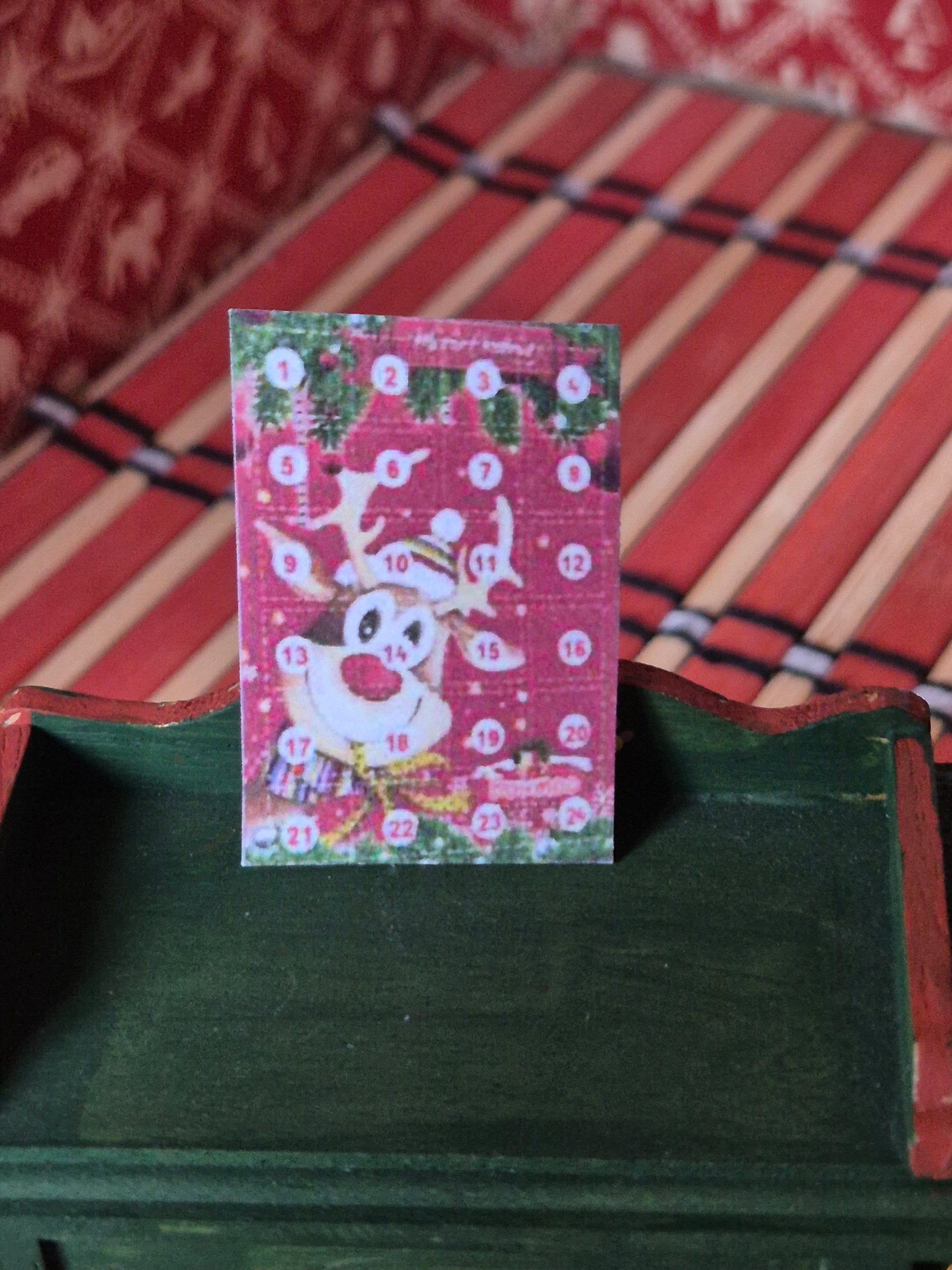 Julekalender til dukkehuset eller nissehus. Den er rød med dådyr Rudolf motiv. Lågerne kan ikke åbnes.