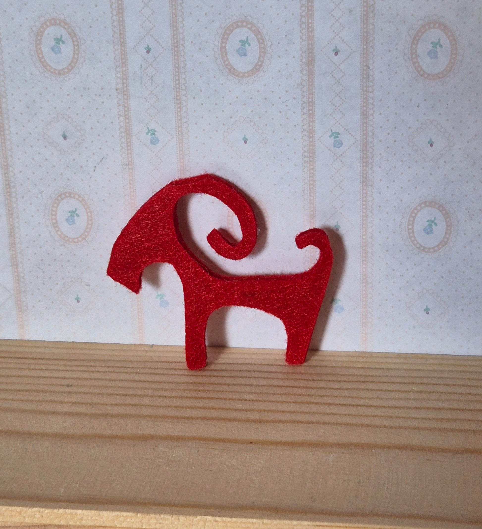 Julebuk af rød filt-stof. Den er 5,5 cm høj. Pænt julepynt.