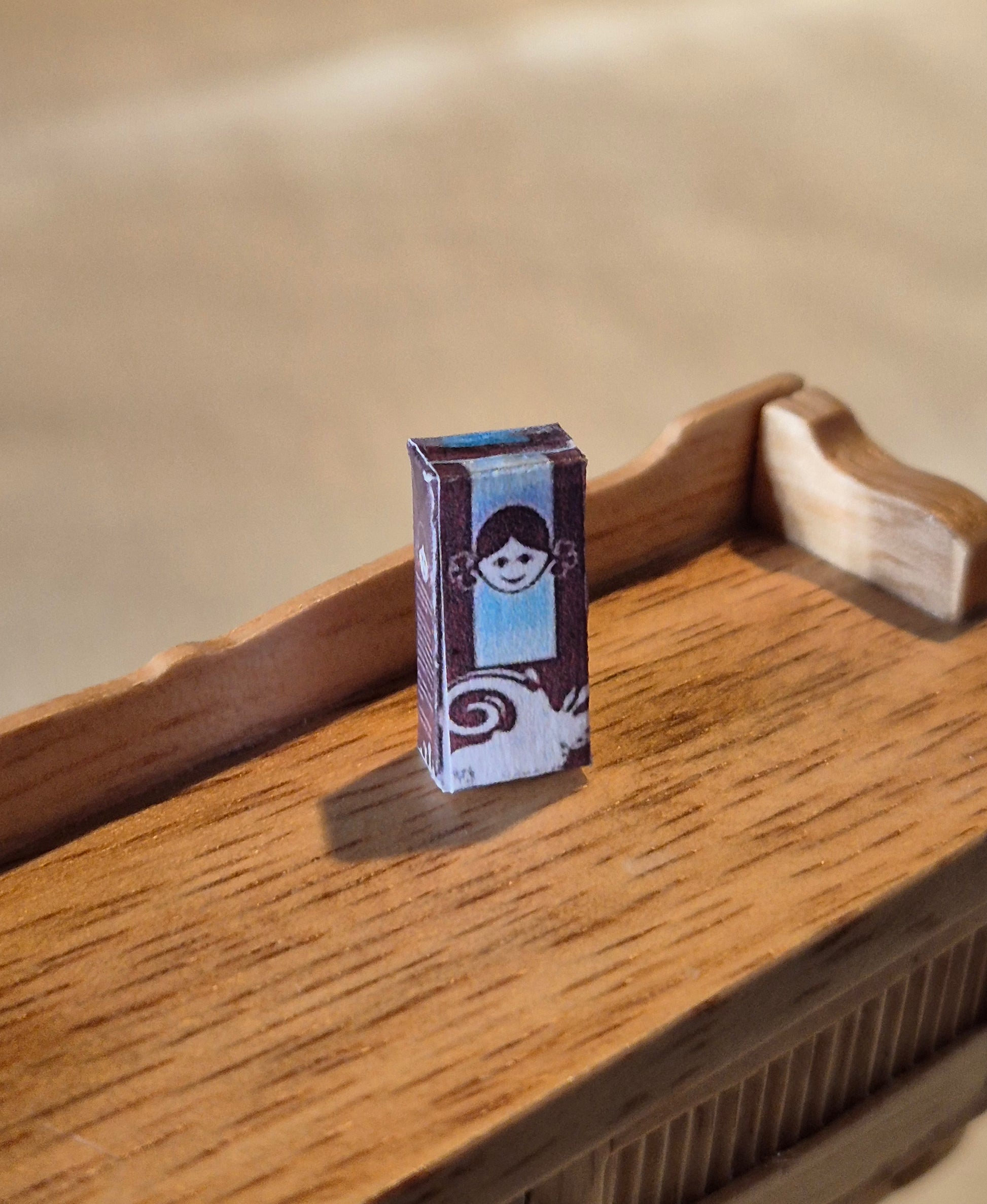 Pæn karton Mathilde kakaomælk til dukkehuset. Hjemmelavet af privat miniature person.