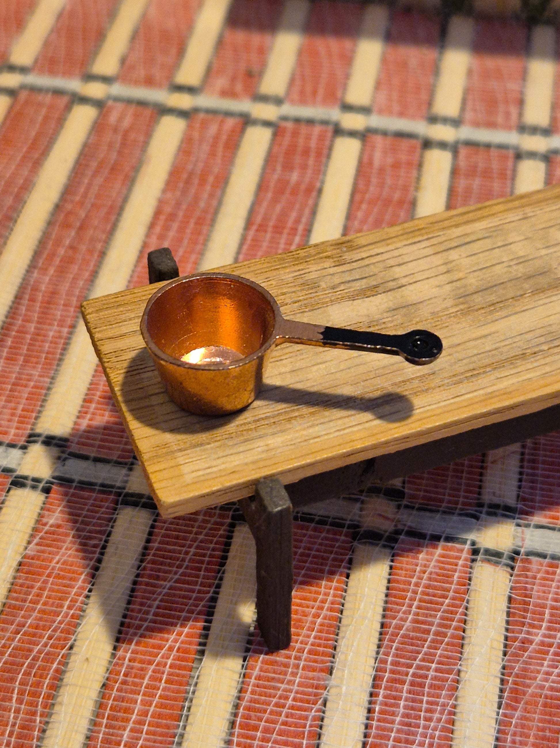 1:12 God pæn gryde , kobber kasserolle af metal til dukkehus køkken eller nissehus til jul, lille størrelse. Rigtig pæn.