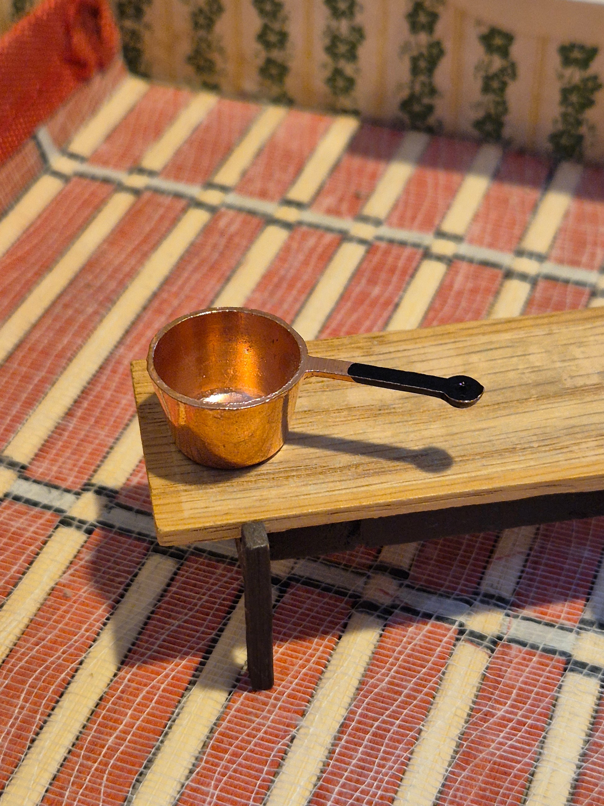 1:12 God pæn gryde, mellem størrelse, kobber kasserolle af metal til dukkehus køkken eller nissehus til jul. Rigtig pæn.