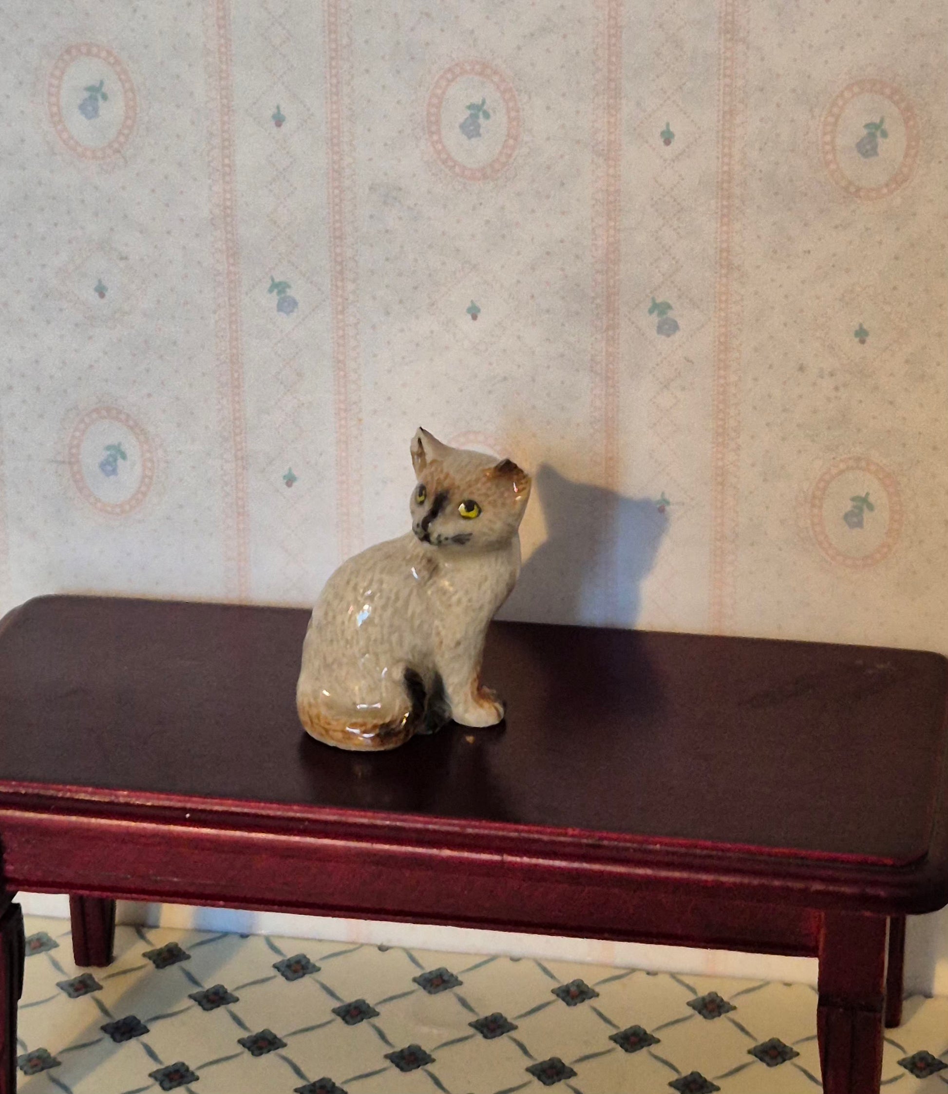 Pæn kat med brugsspor og patina, lidt knæk på øret. Den er af porcelæn. Kan bruges som kæledyr i dukkehuset eller som pynt. Ca 2 cm høj.