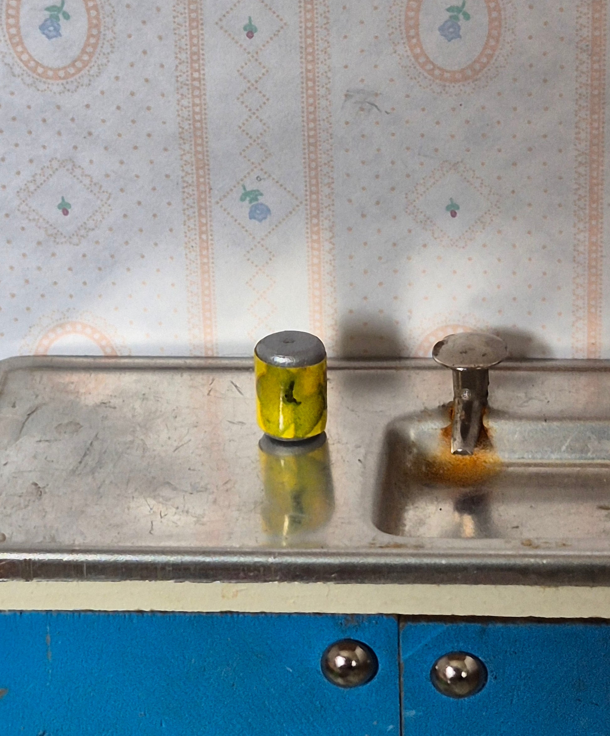 Lille konservesdåse med pletter på mærkaten. Muligvis Lundby. Str 1:16.
