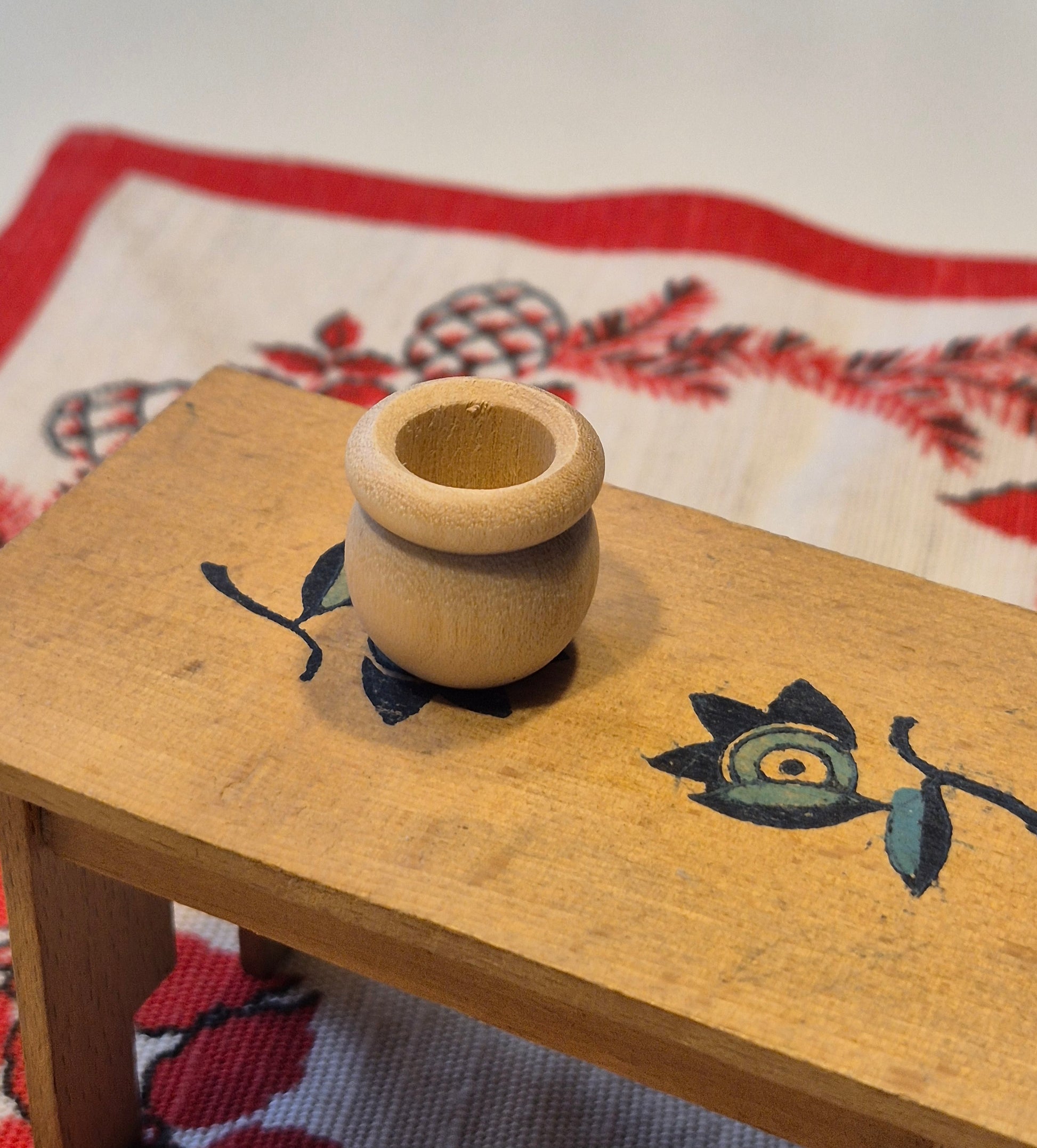 Krukke af træ. Den er buttet med glat overflade. Rigtig fin. Godt tilbehør til dukkehuset eller nissehus ved juletid.