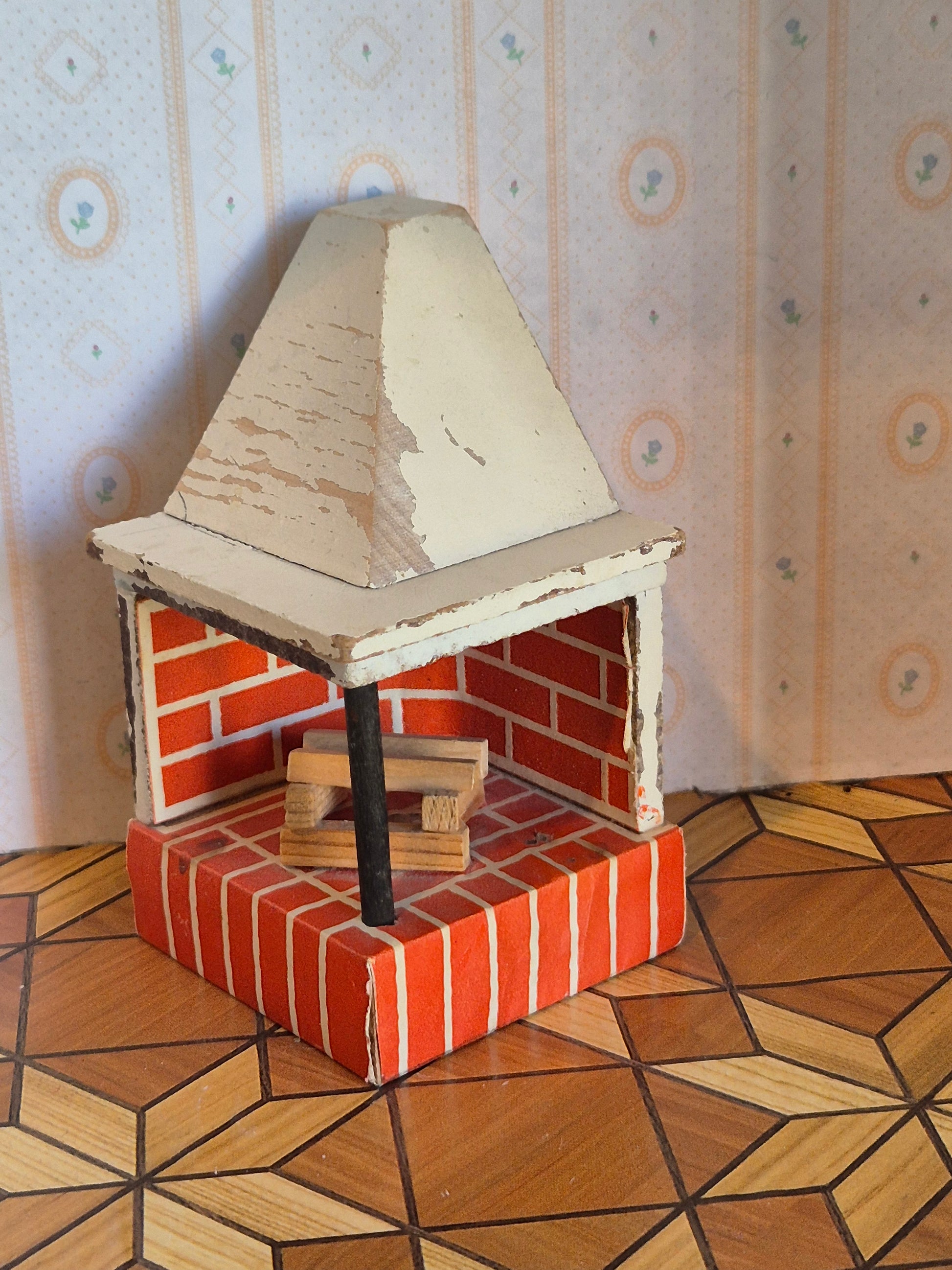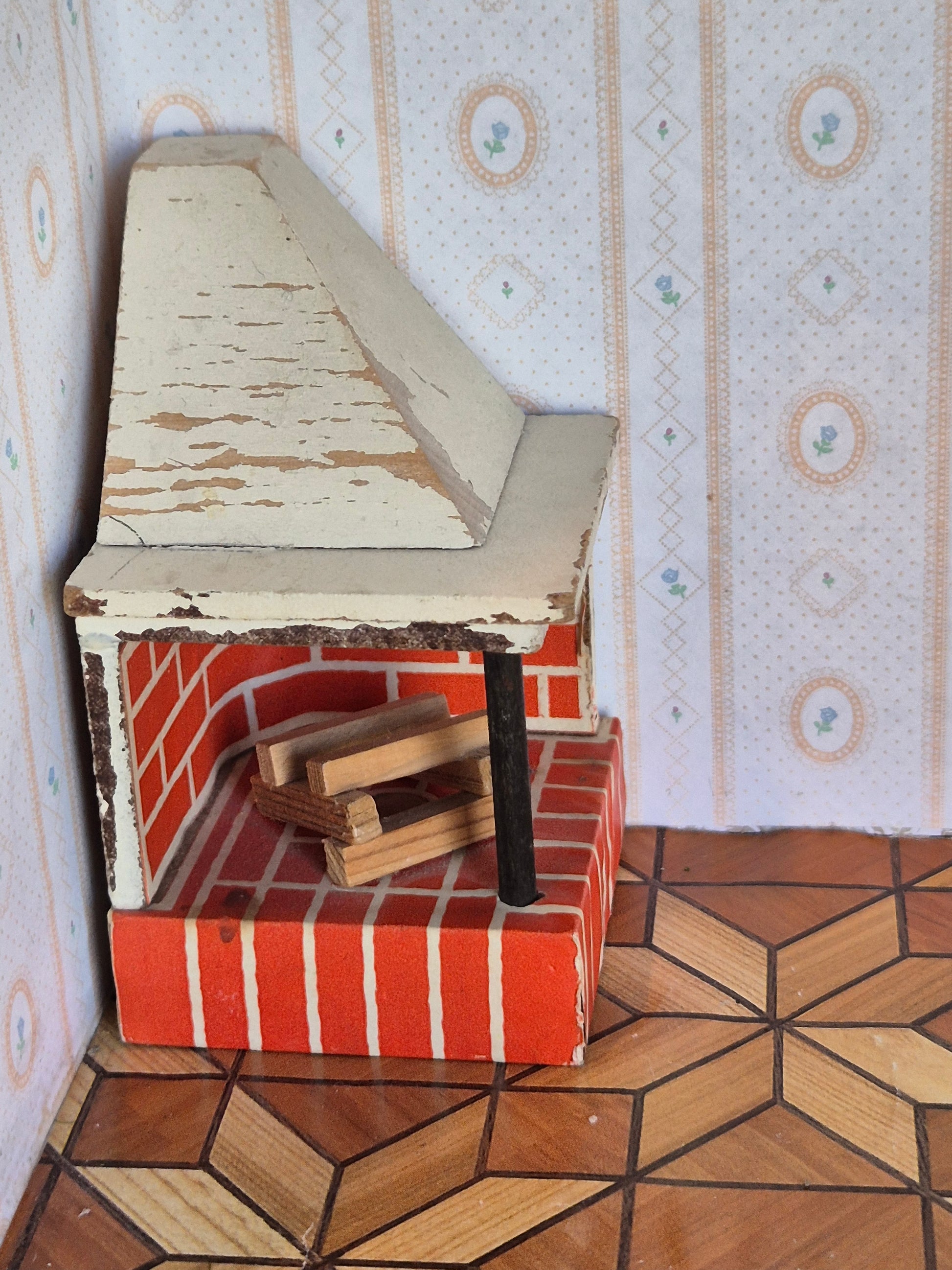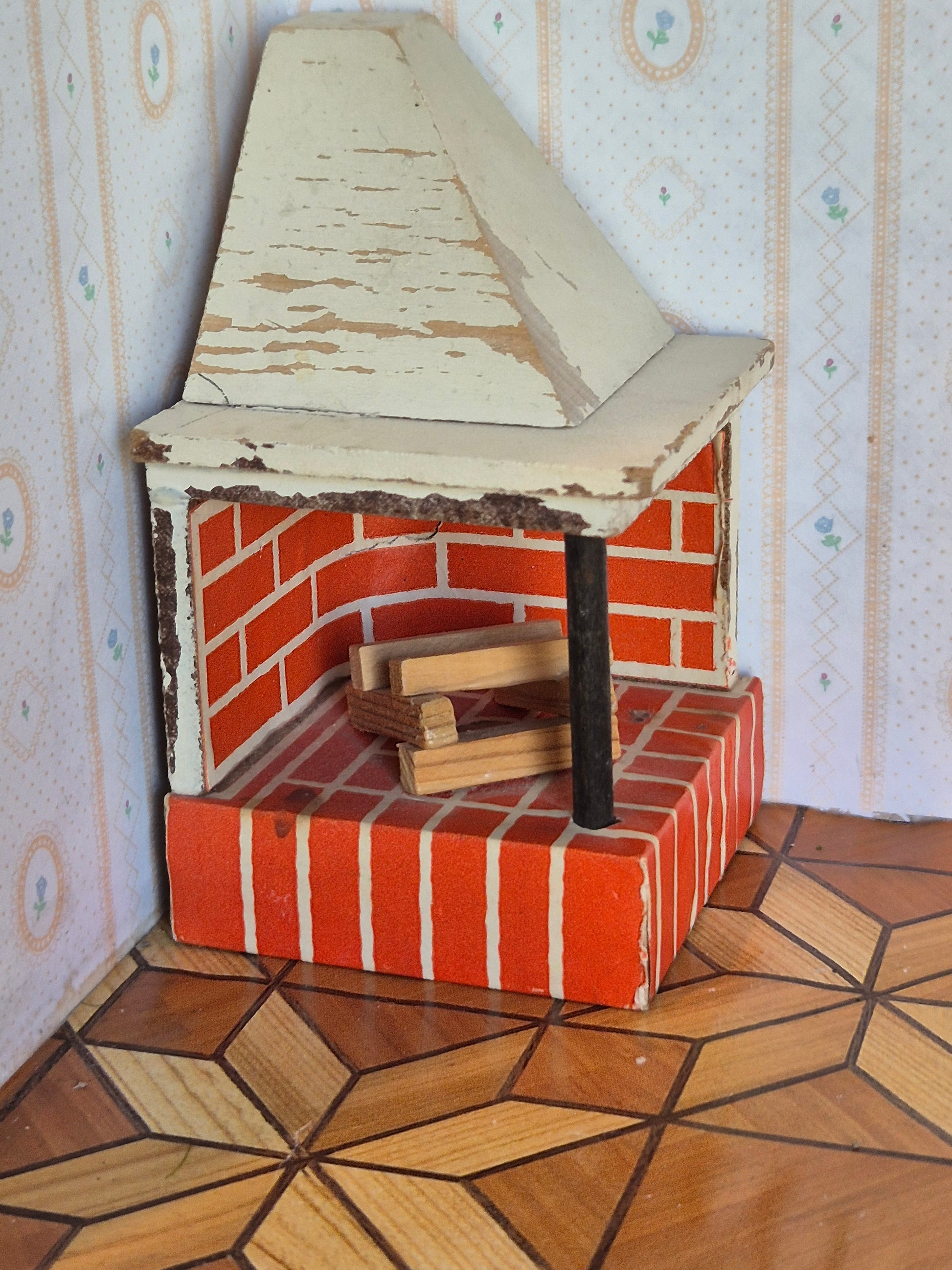 Fin hjørnepejs af Lerro fra 1960erne. Udmærket stand, dog patina og brugsspor. Den er af træ. Solidt dukkehusmøbel. Kamin til dukkehuset
