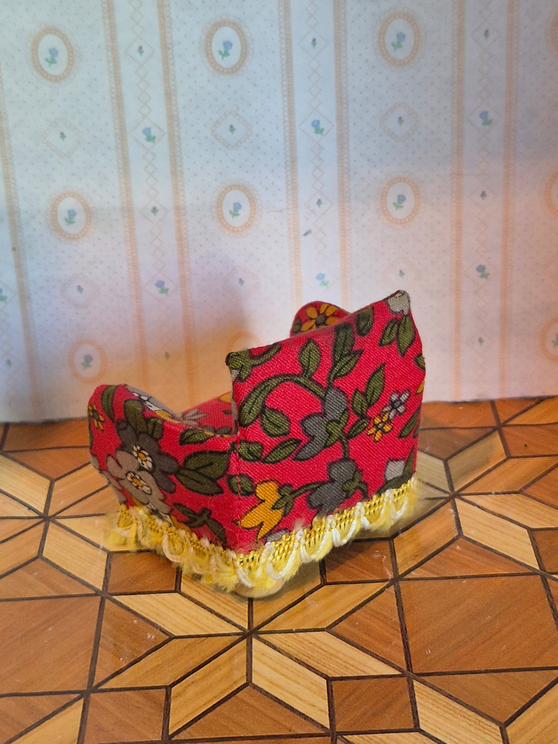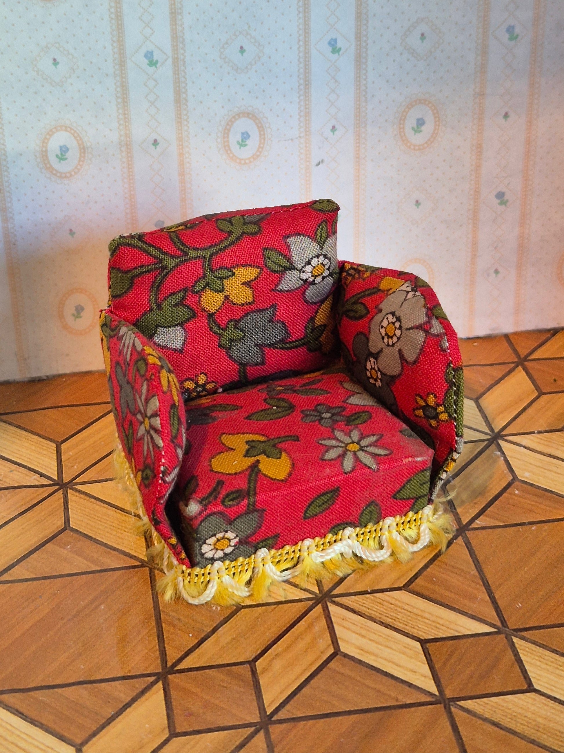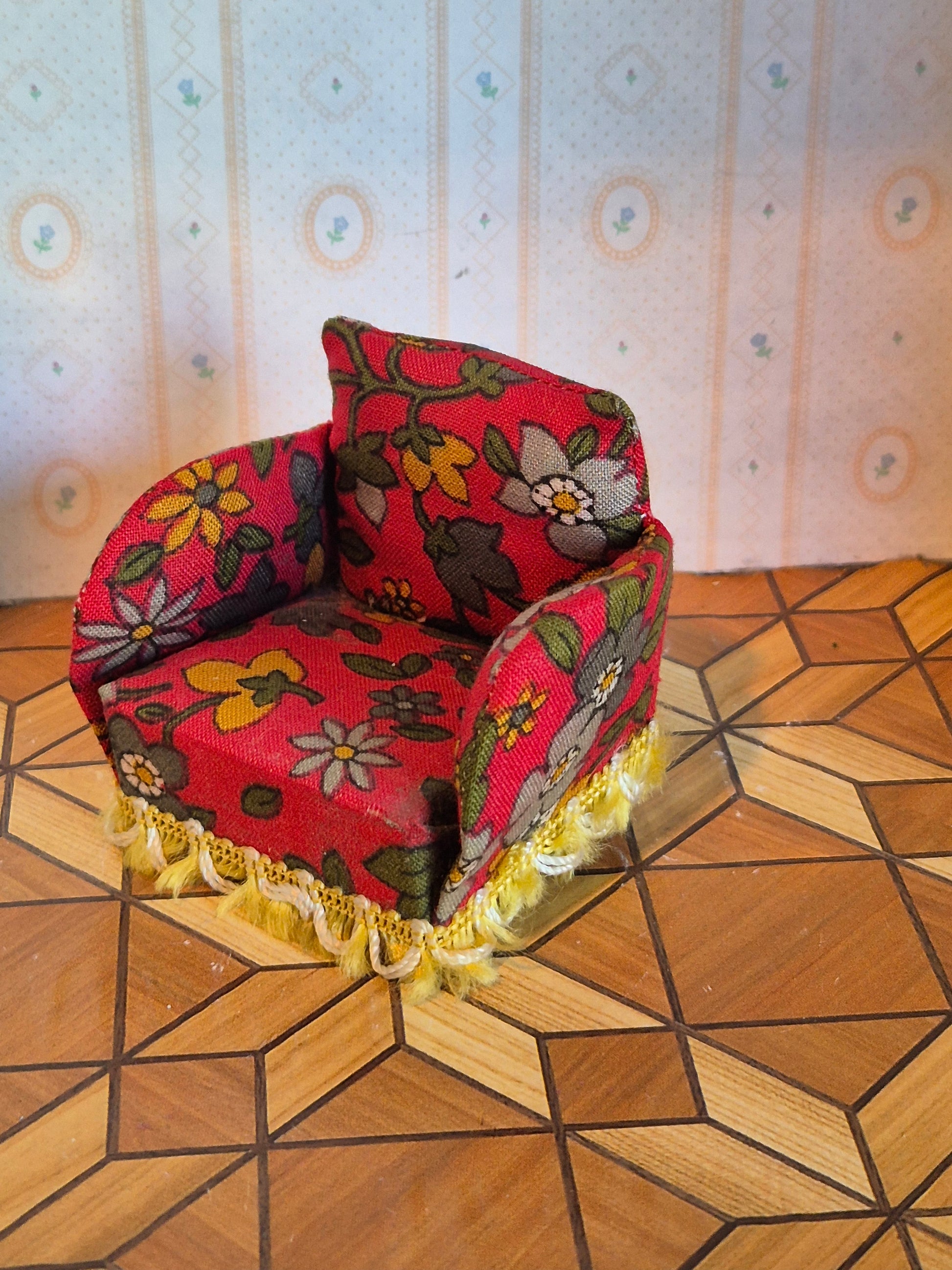 Ældre vintage lænestol af Lerro i pink blomstermotiv.