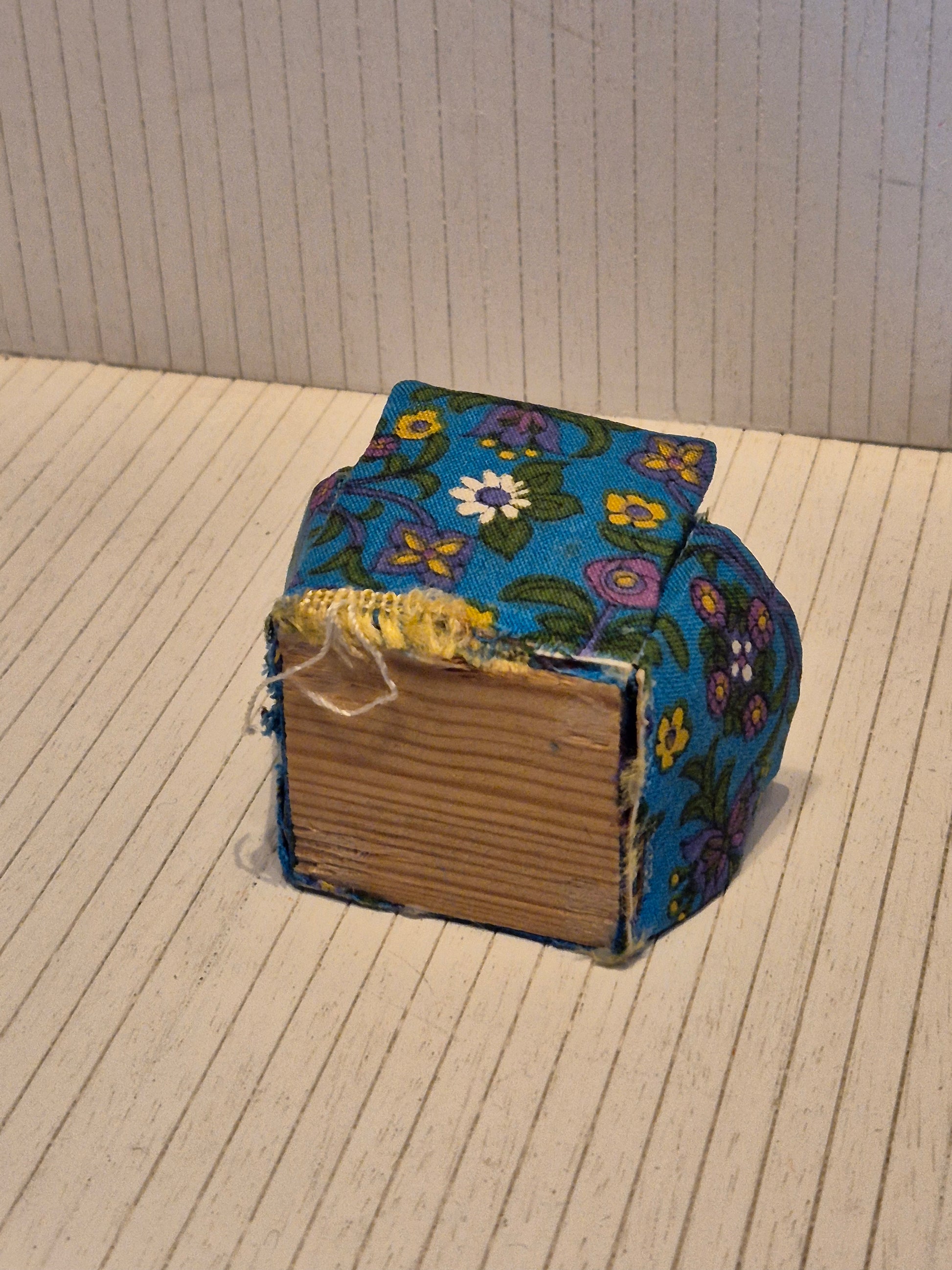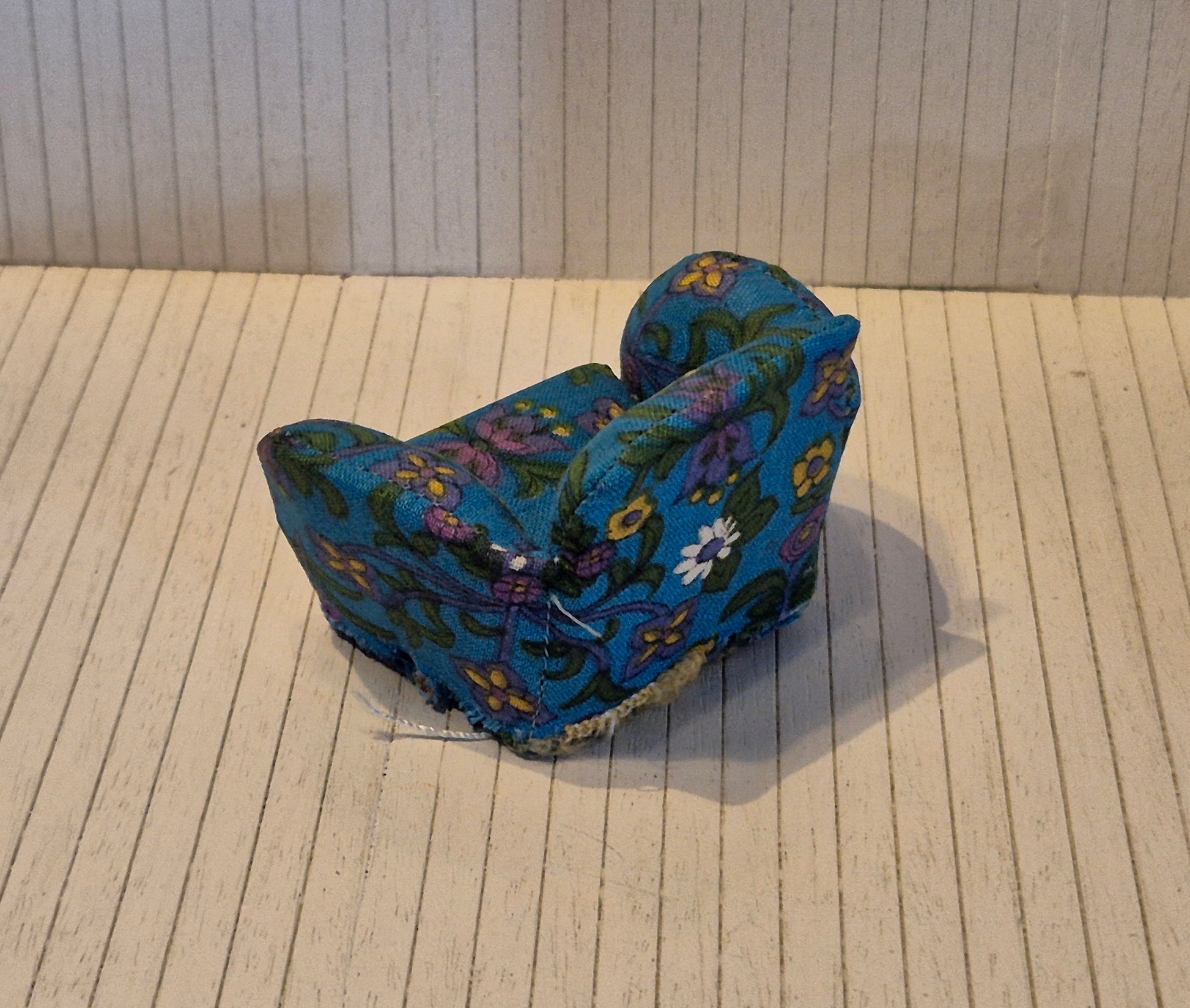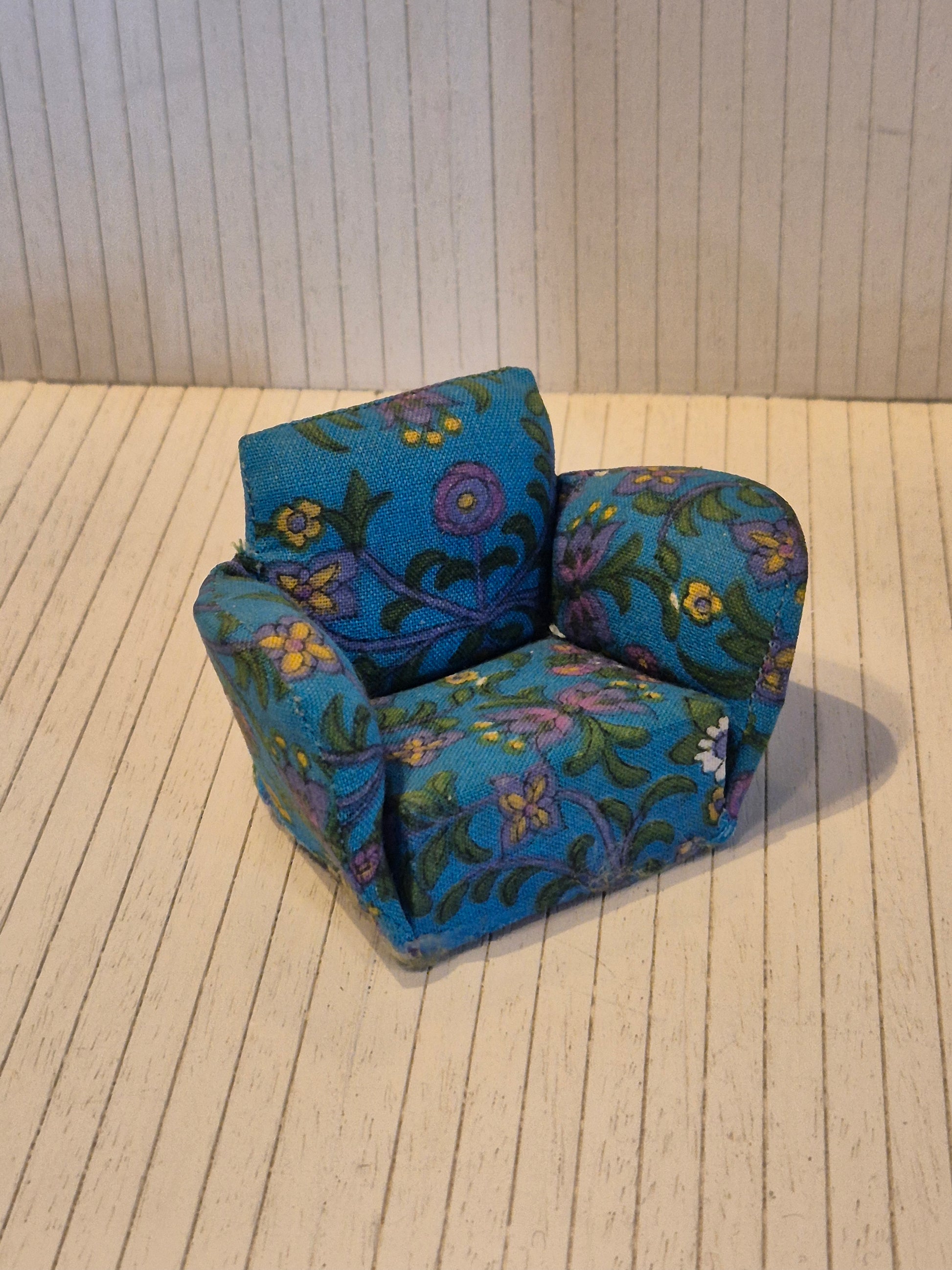 Ældre lænestol af mærket Lerro. Den er brugt og mangler blondekanten med flæser.