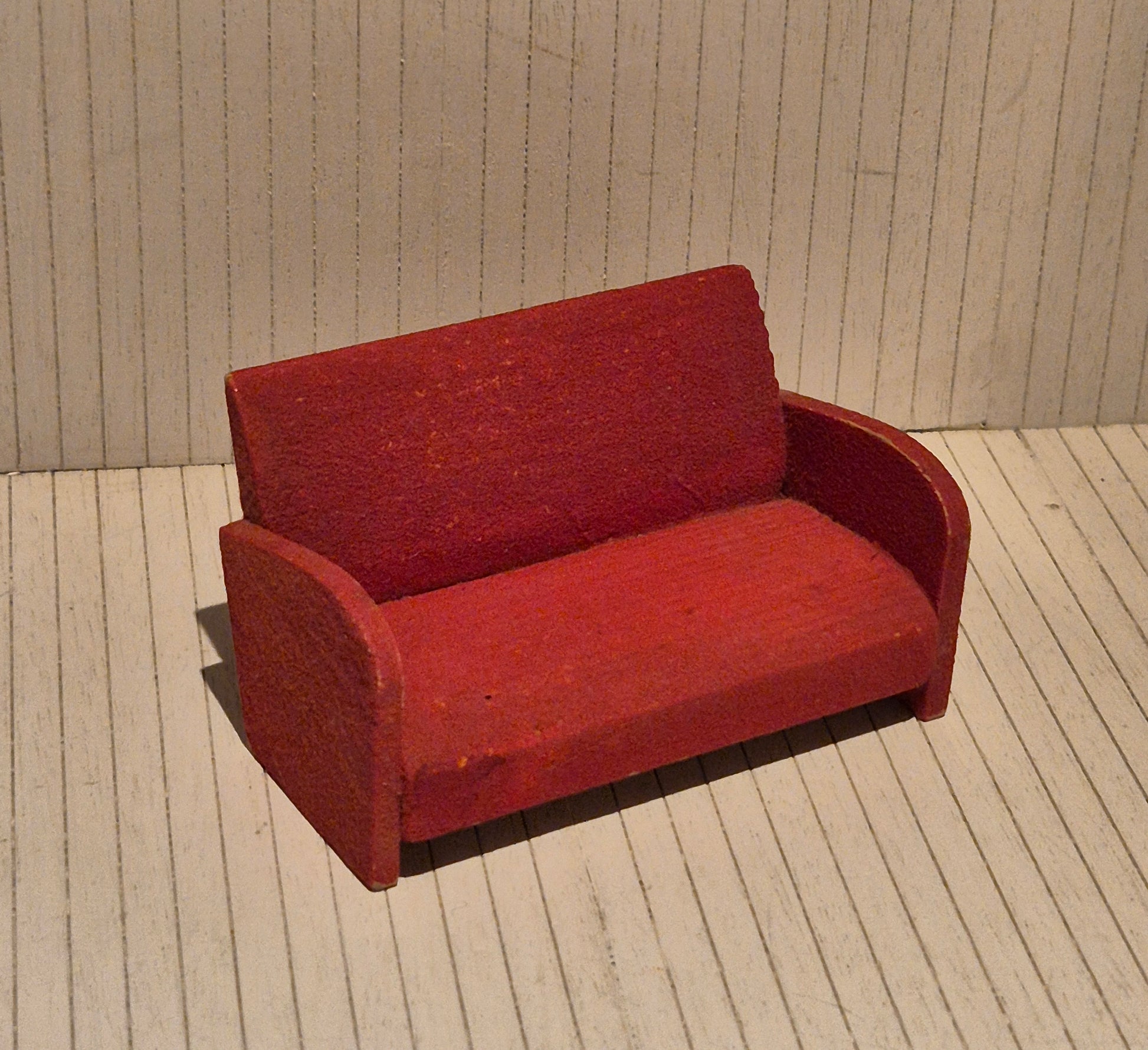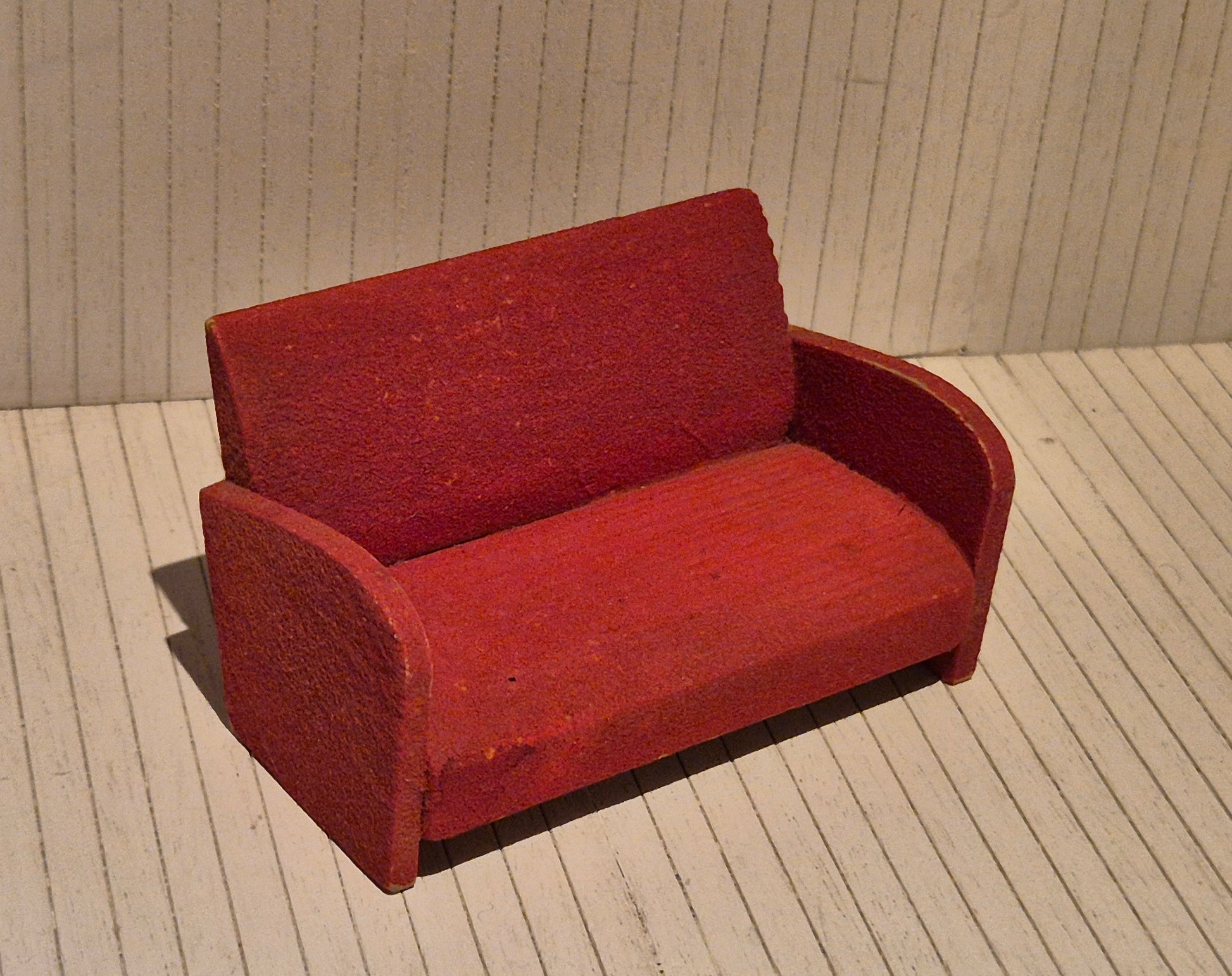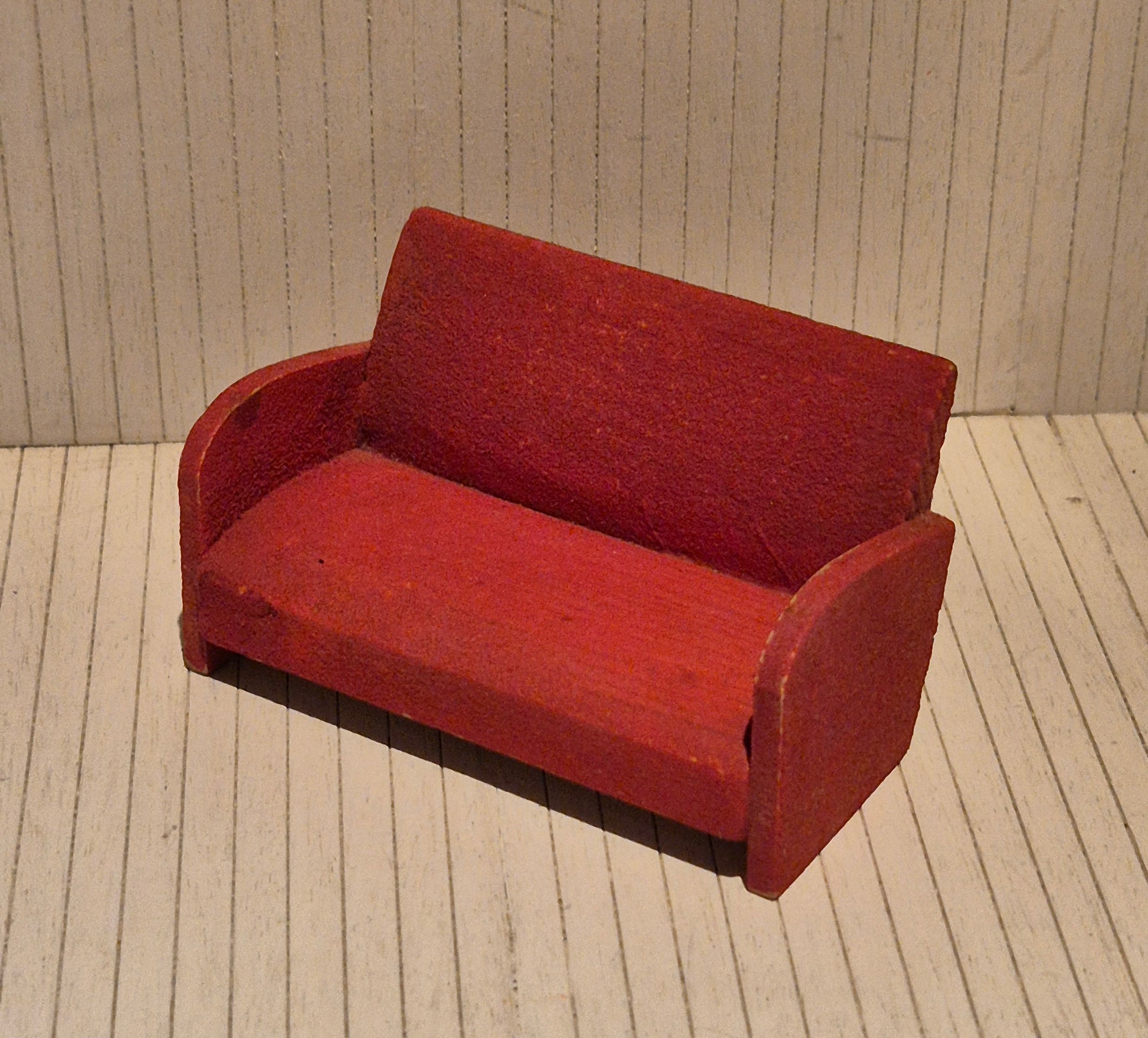 Ses ikke så ofte igen. Den er robust. Bygget af træ med tyndt rødt stofbetræk.