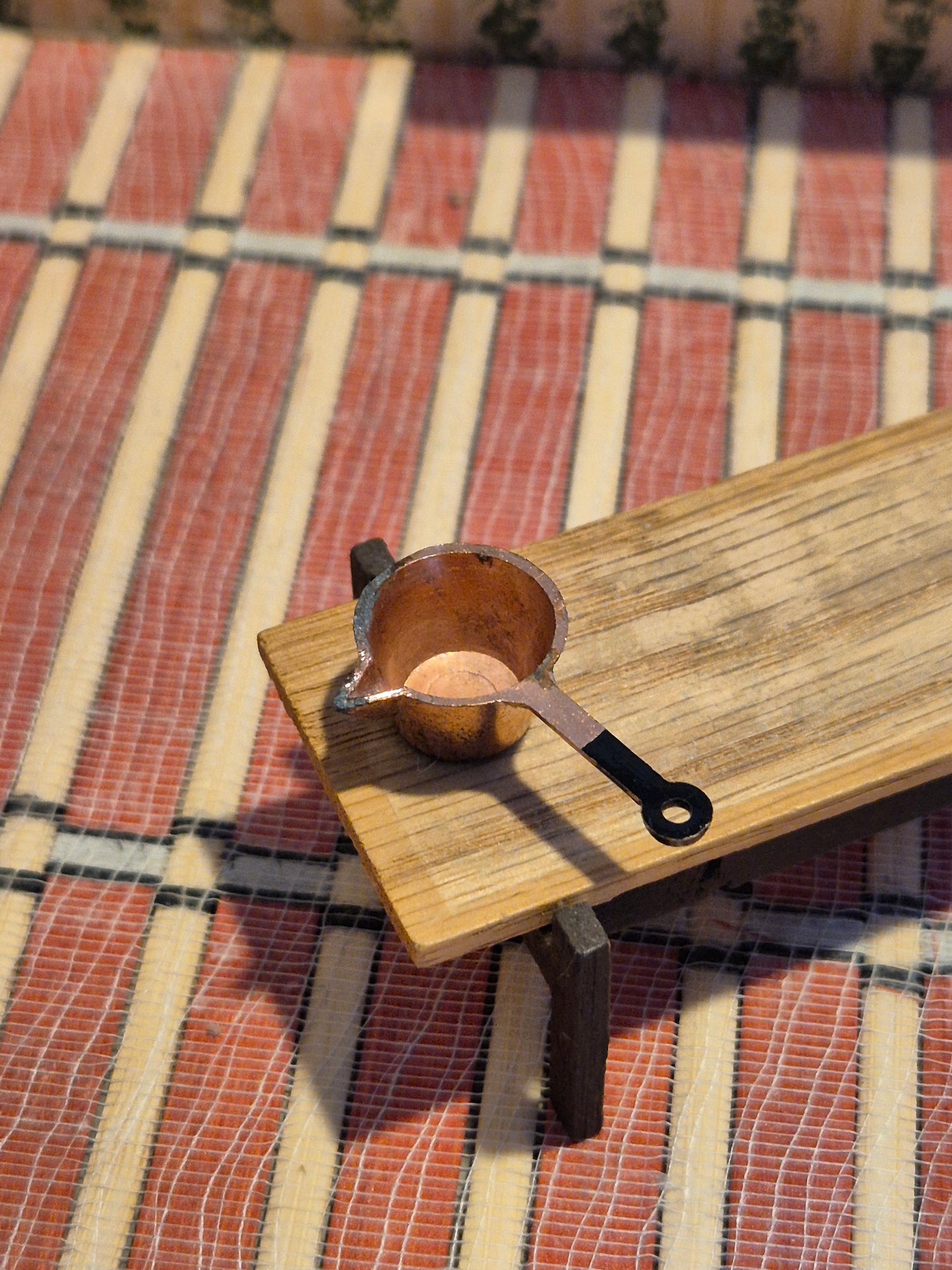 1:12 God pæn gryde, lille størrelse, kobber kasserolle med tud af metal til dukkehus køkken eller nissehus til jul. Rigtig pæn.