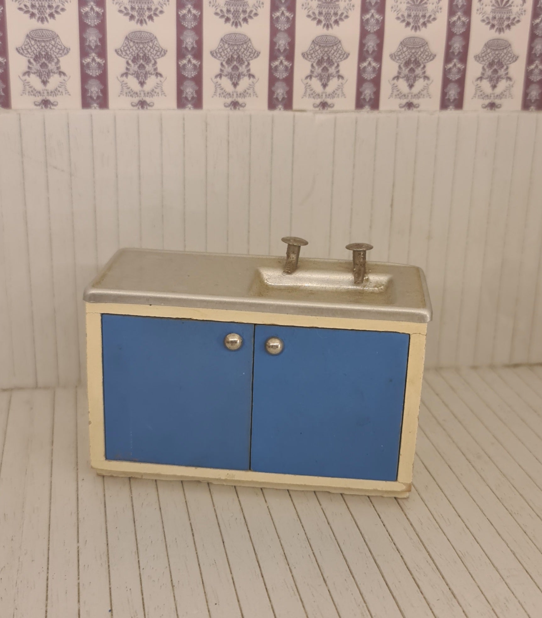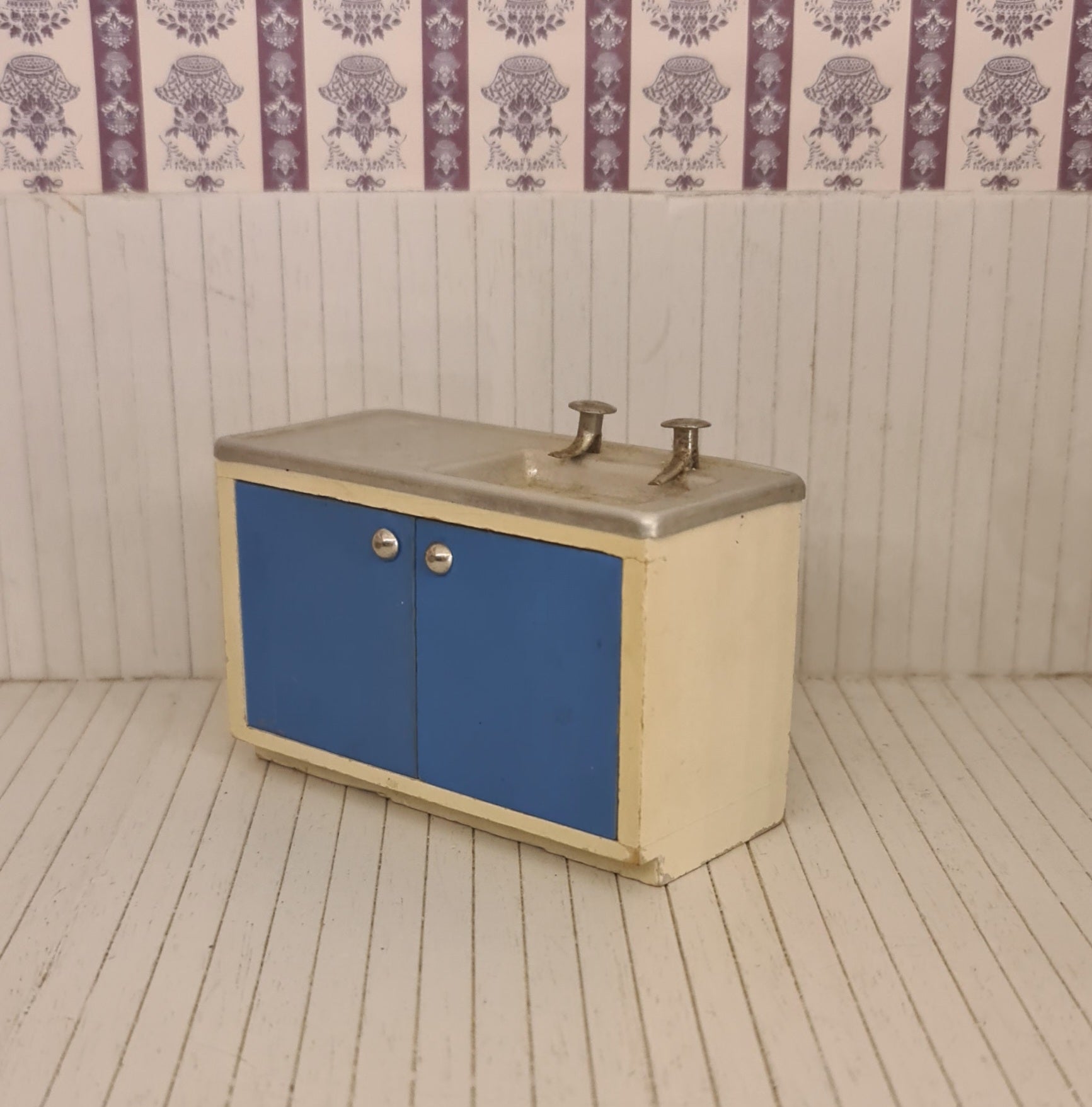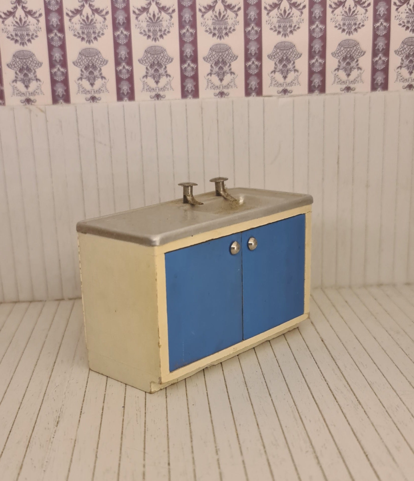 Køkkenvask i skab med blå låger og metal bordplade.
