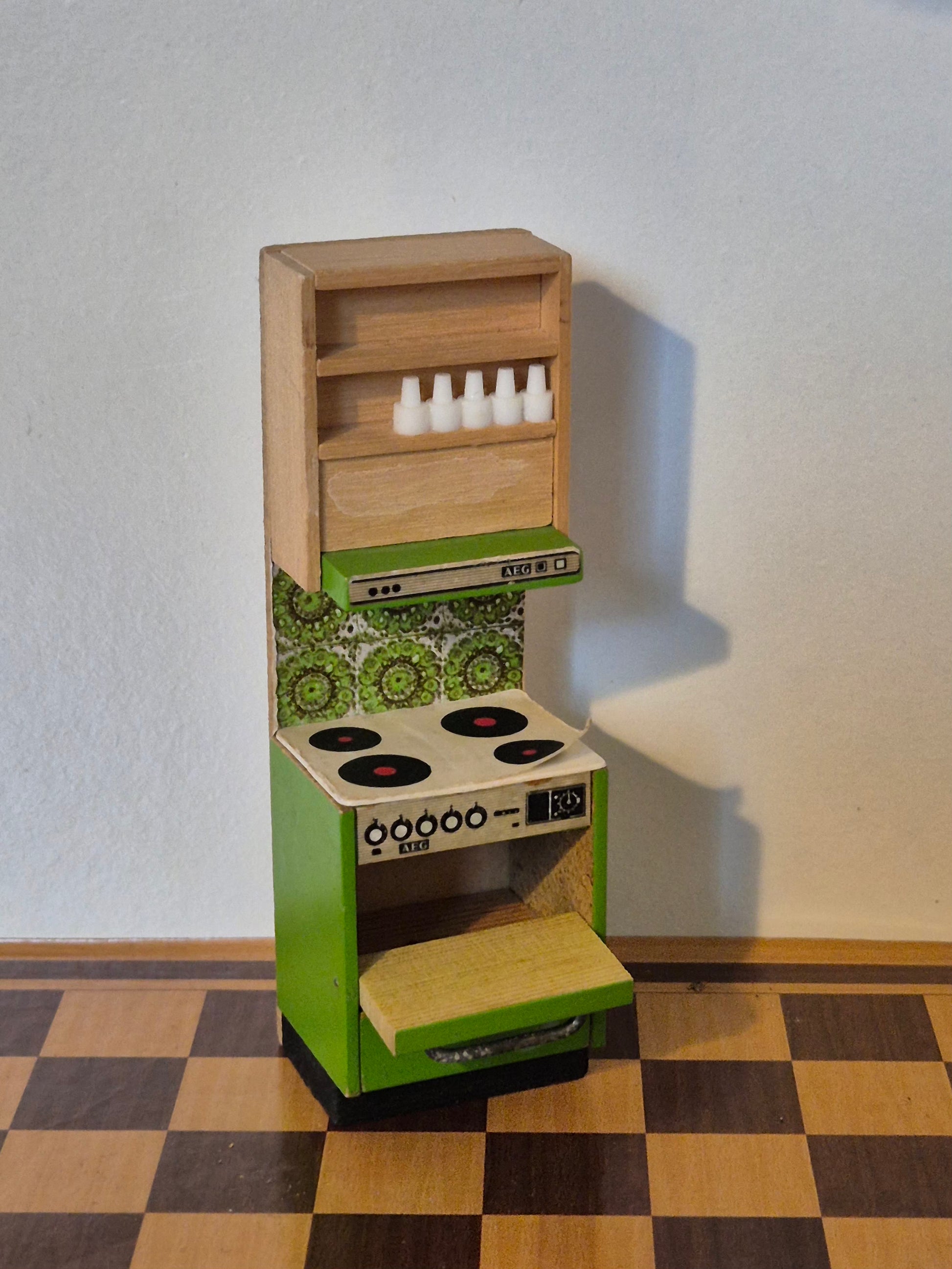 Intakt vintage Lisa af Danmark komfur fra starten af 1970erne i den grønne køkken-serie. Der er patina og tegn på brug.