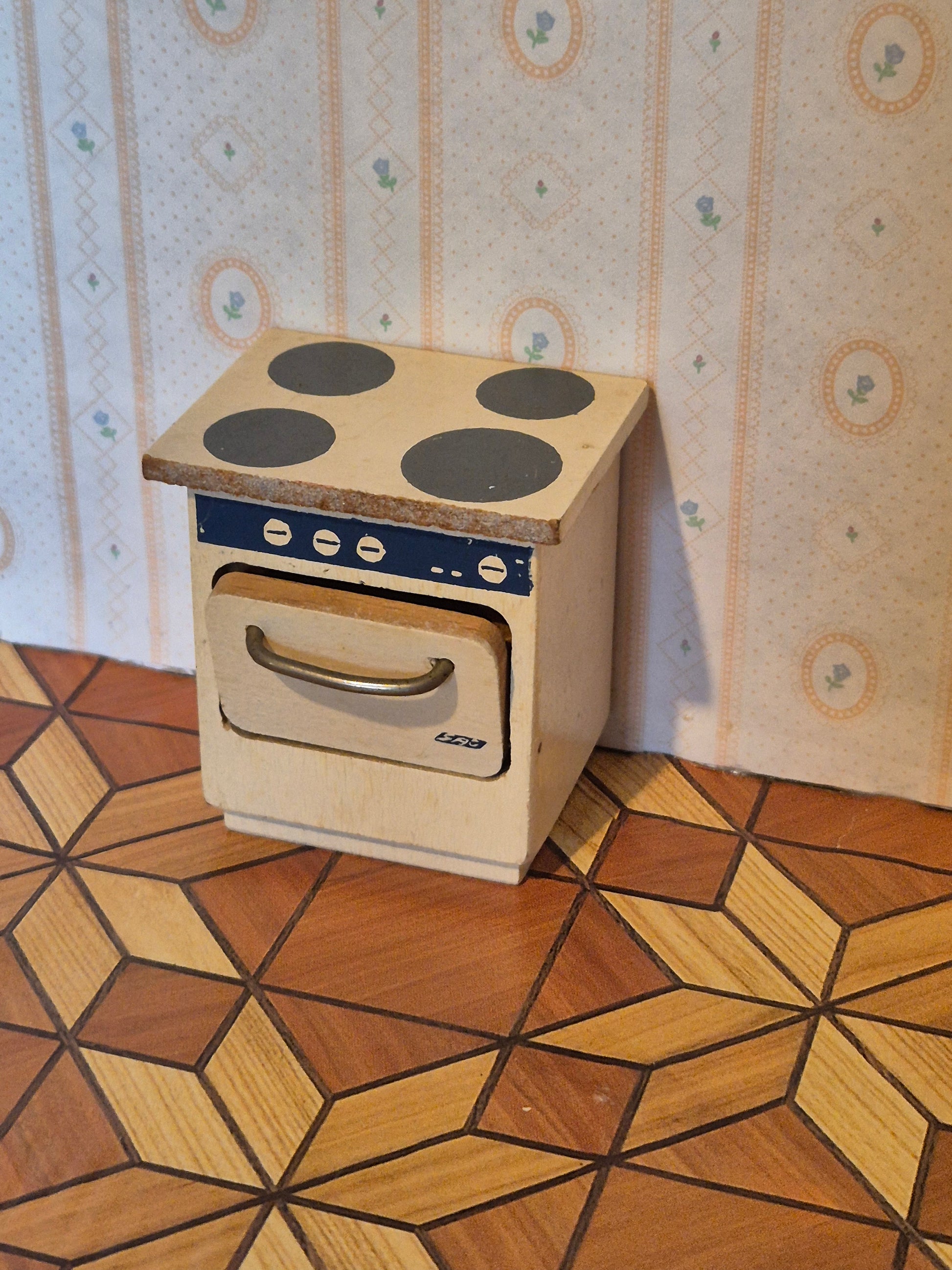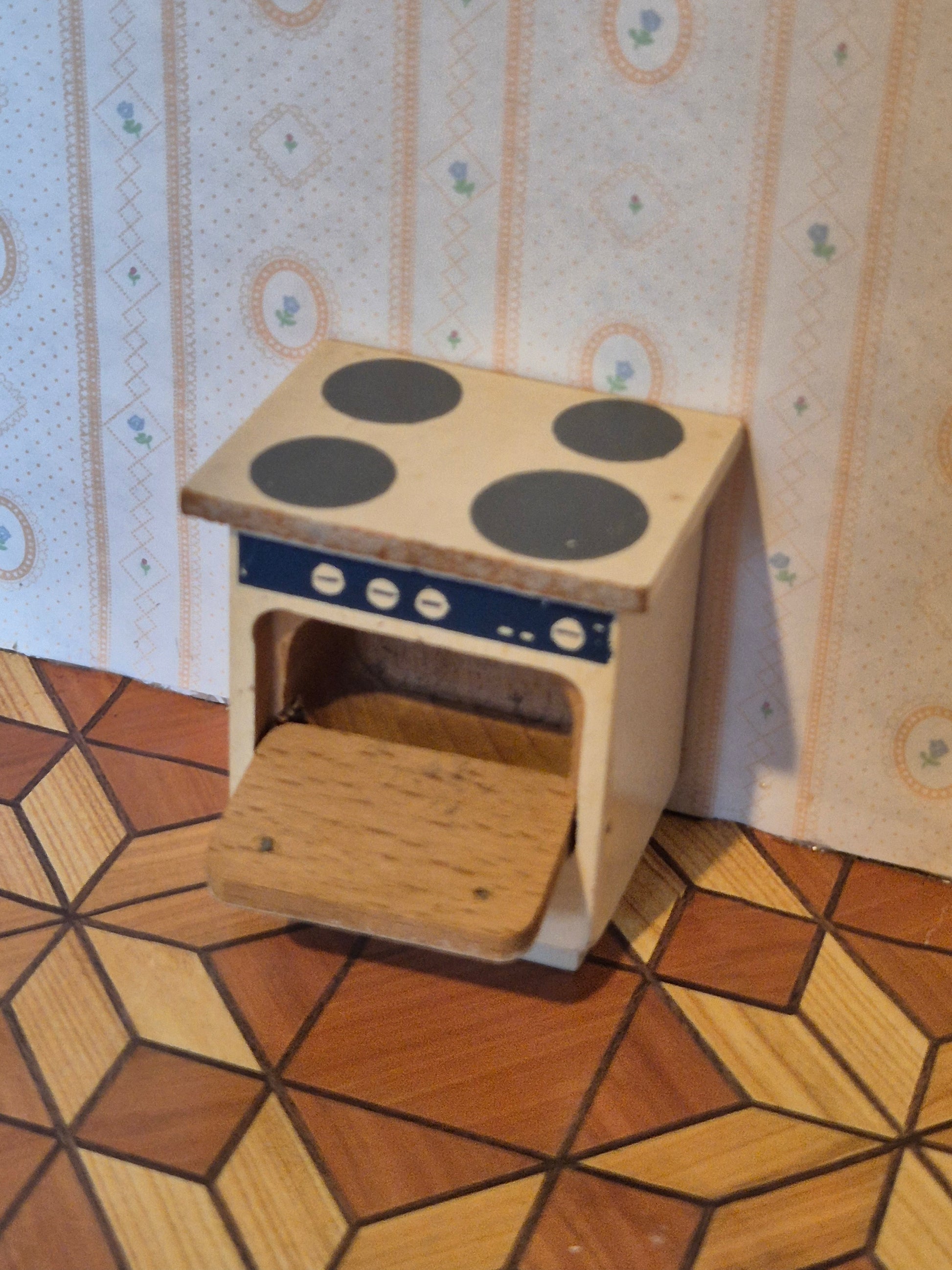 Ældre komfur af hvid træ til dukkehus af mærket Lisa af Danmark. Ovnlågen er lidt åben, lukker ikke helt tæt. Ellers pæn.