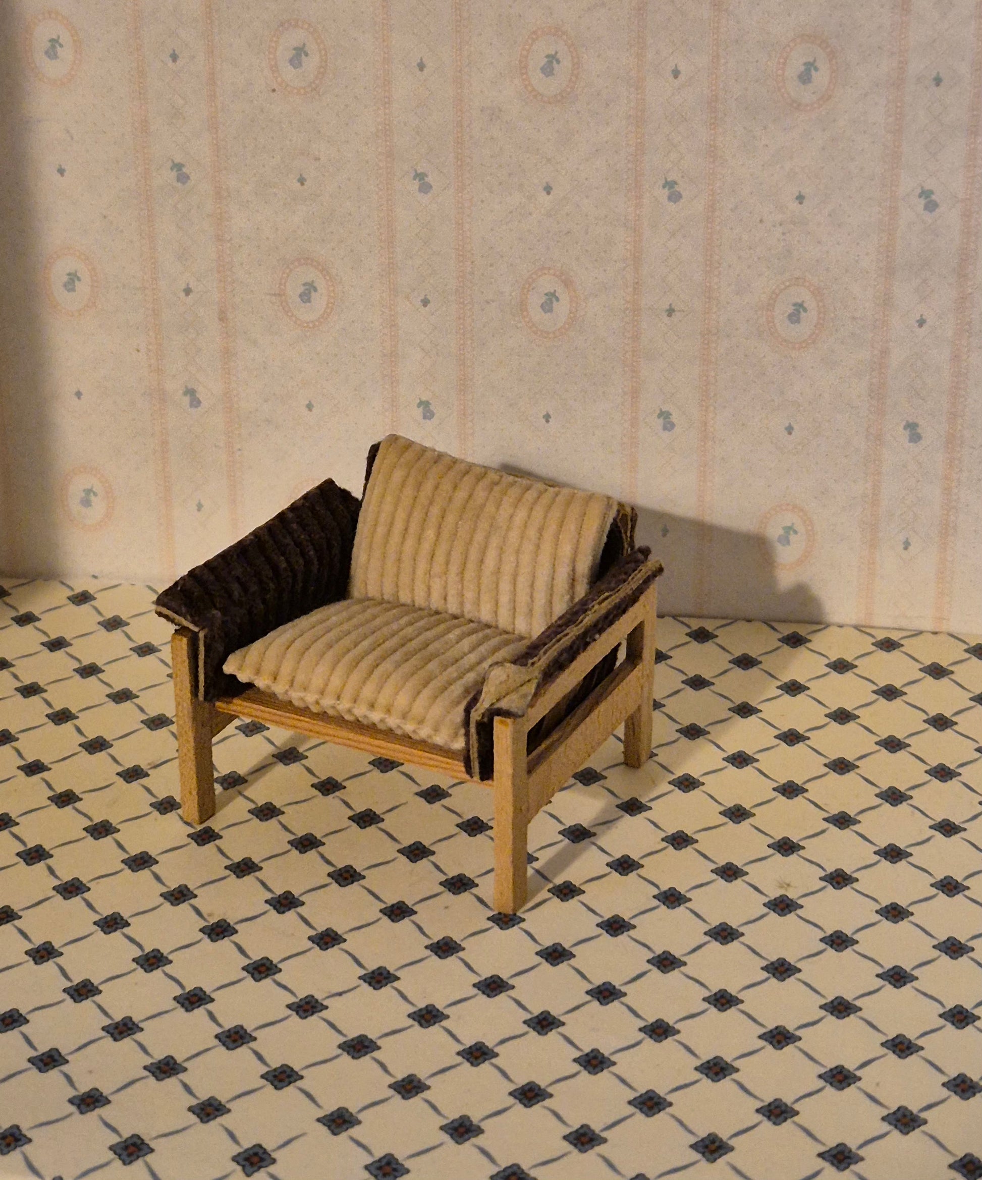 Pæn og fin vintage Lisa af Danmark lænestol i træ med sart lysebrunt fløjlsstof.