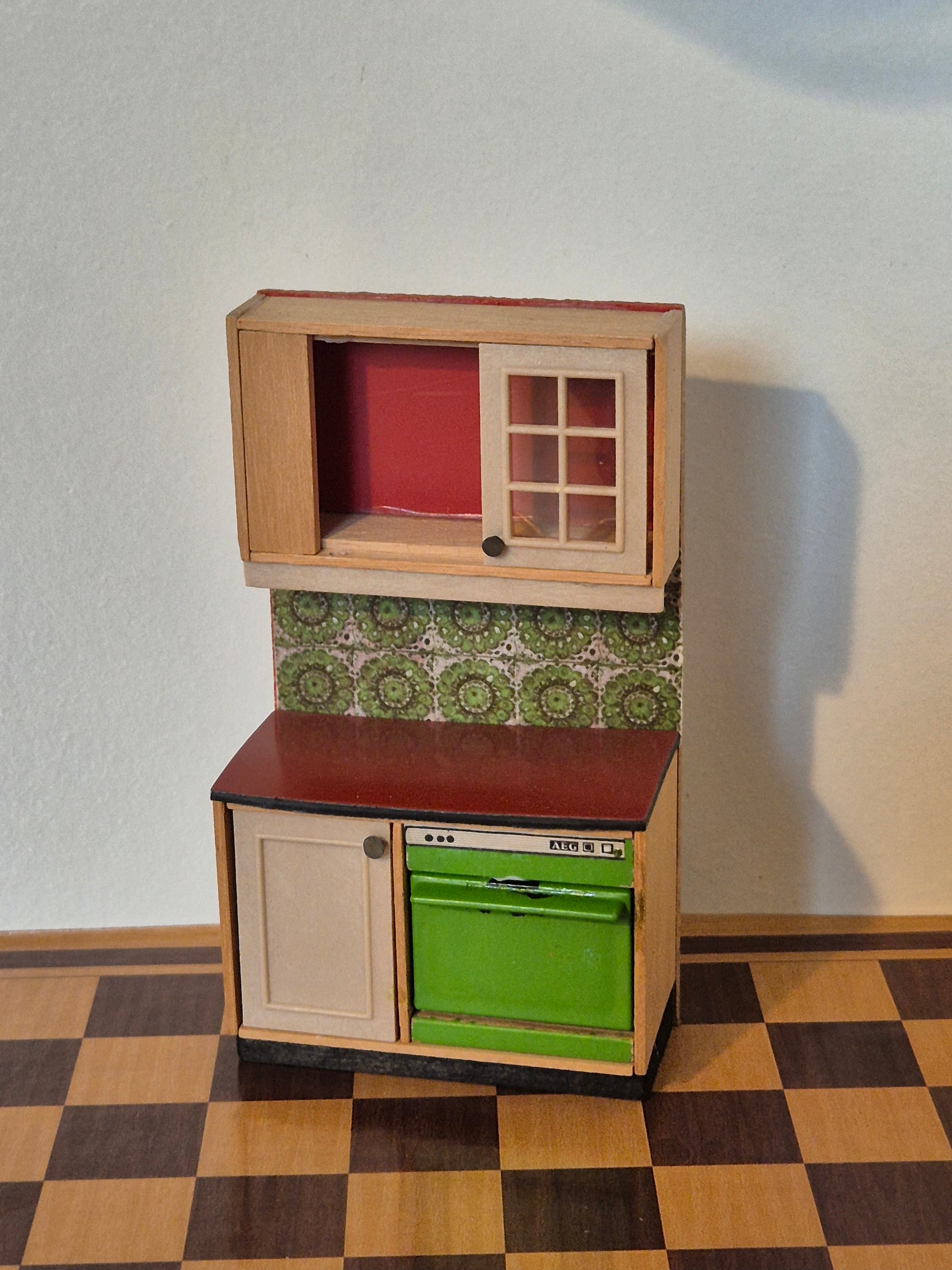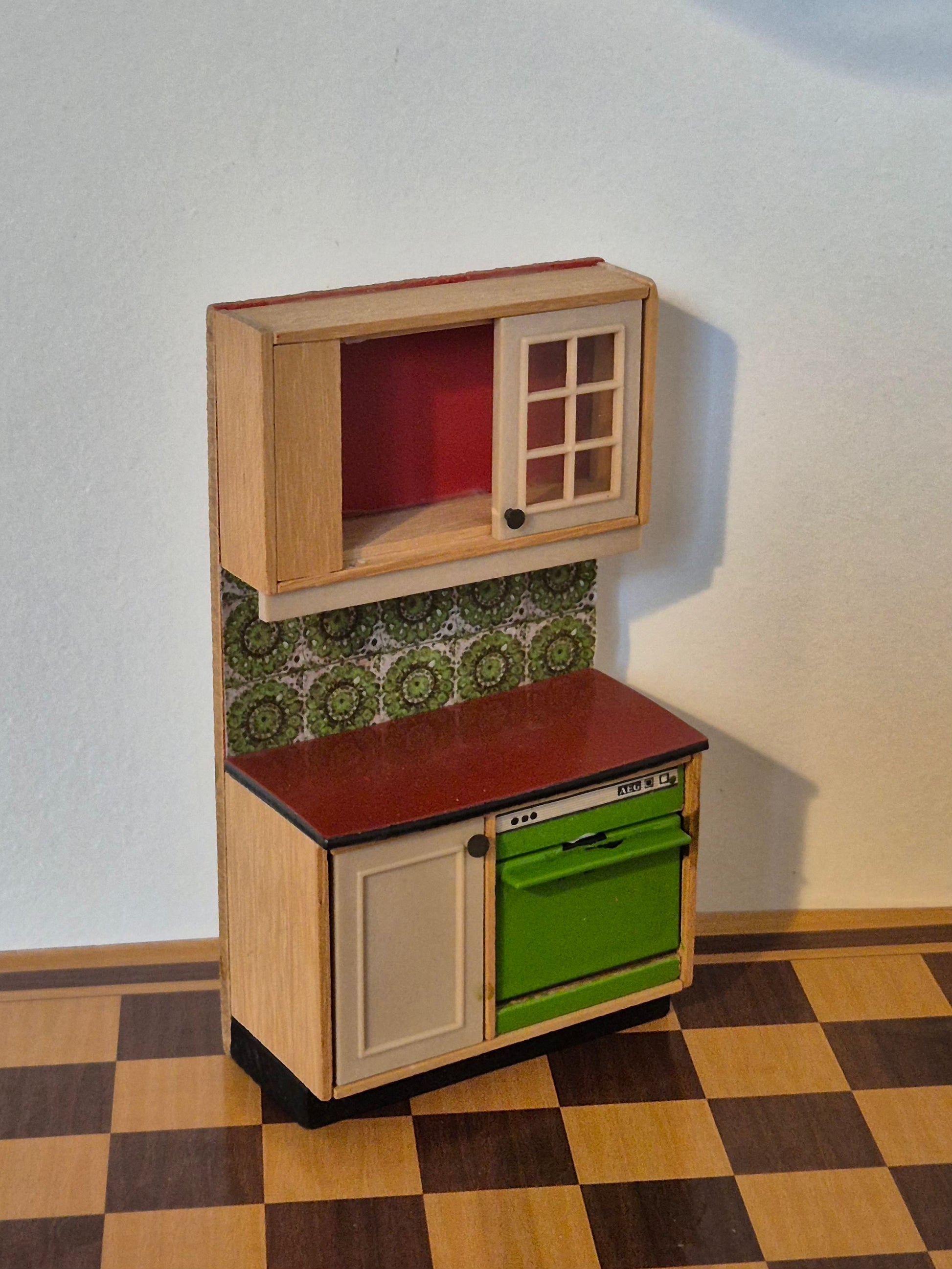 Pæn Lisa af Danmark opvaskemaskine element til dukkehus 1:16, hvor der mangler en låge i overskabet, men ellers udmærket stand med lidt patina.