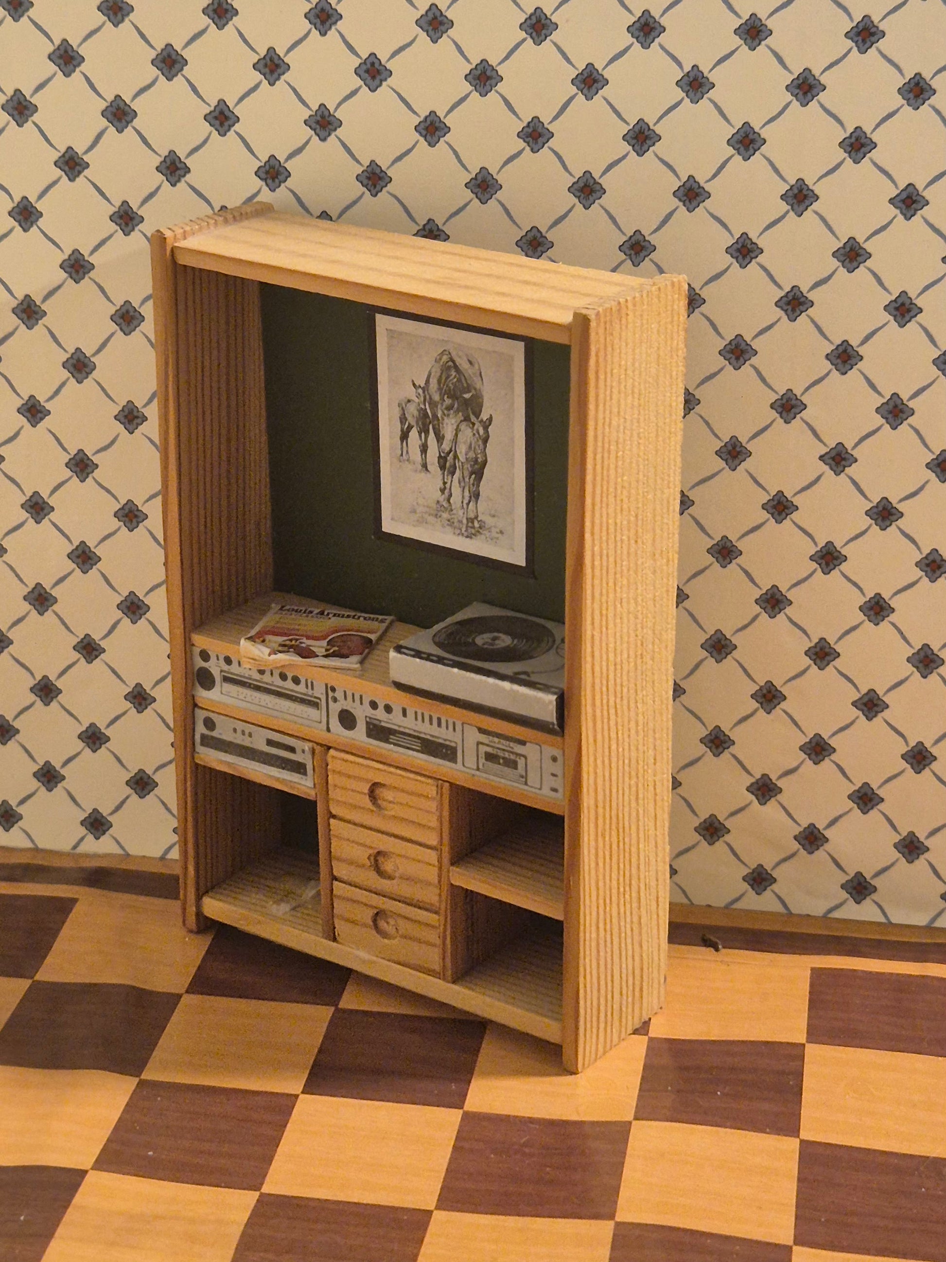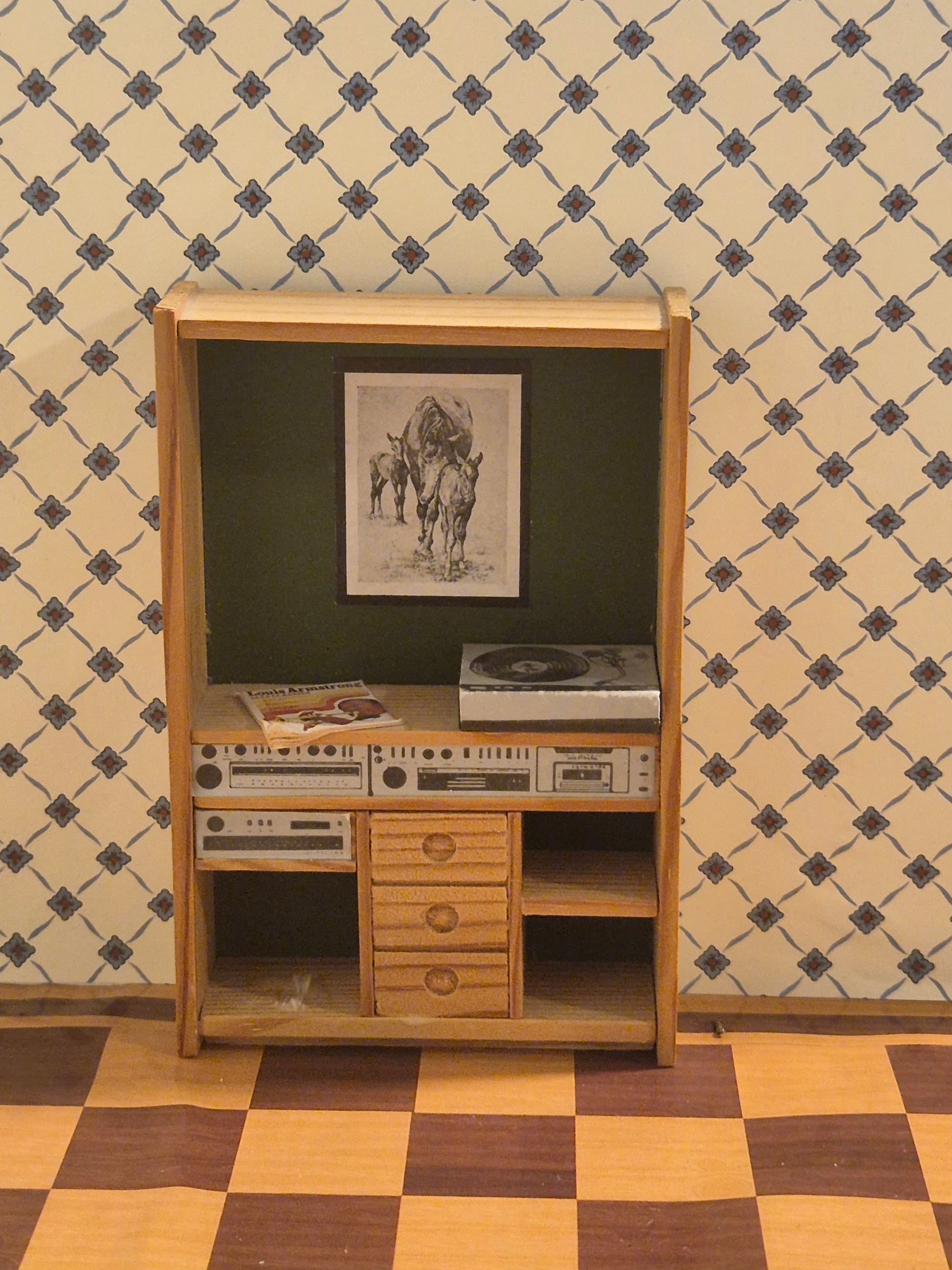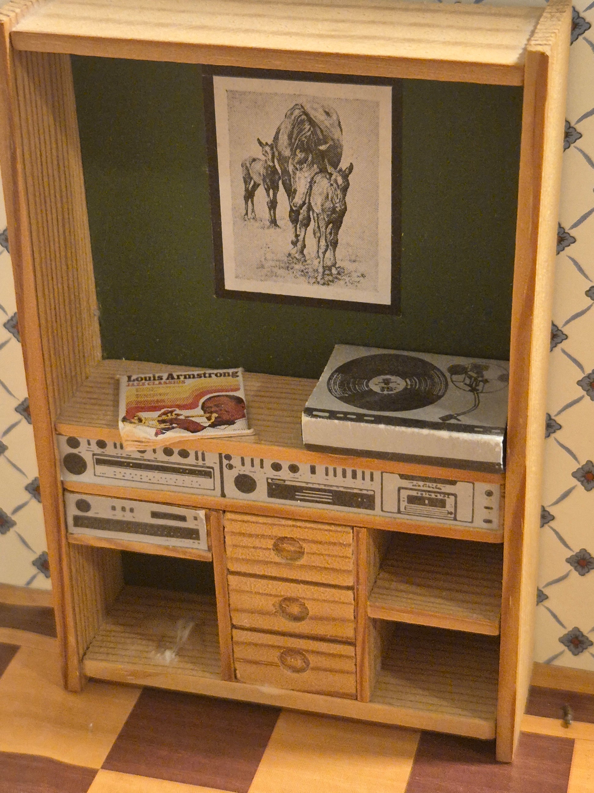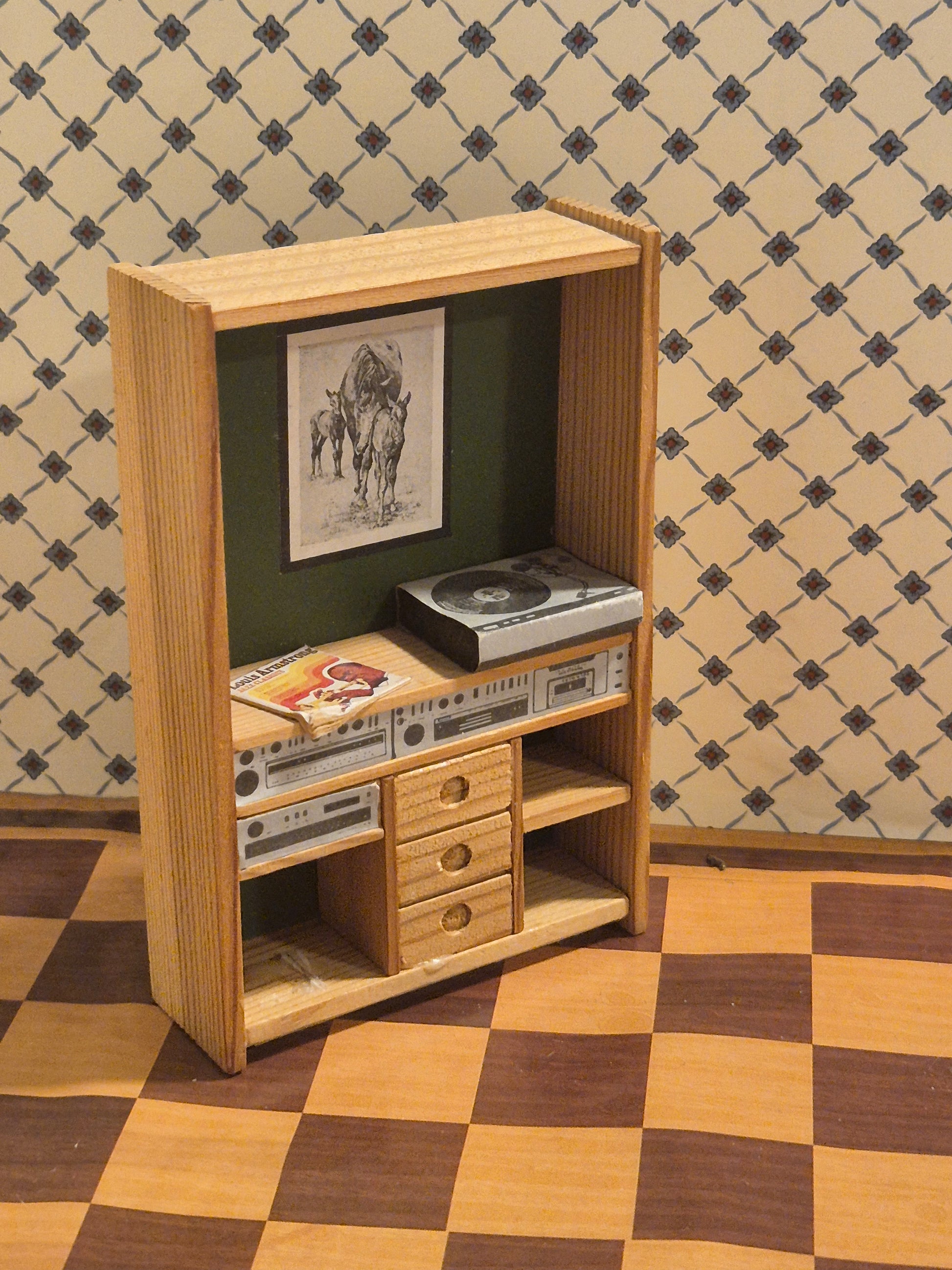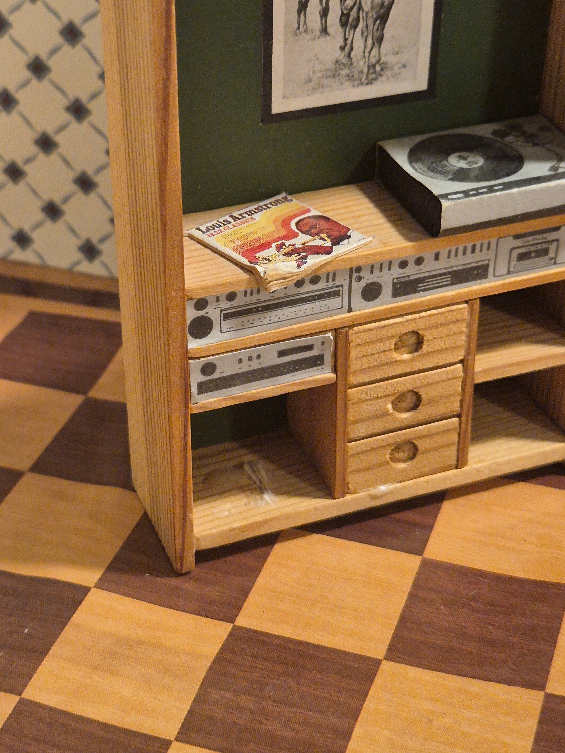 Pæn reol af træ med grøn bagvæg og musikanlæg, radio og LP af mærket Lisa af Danmark.