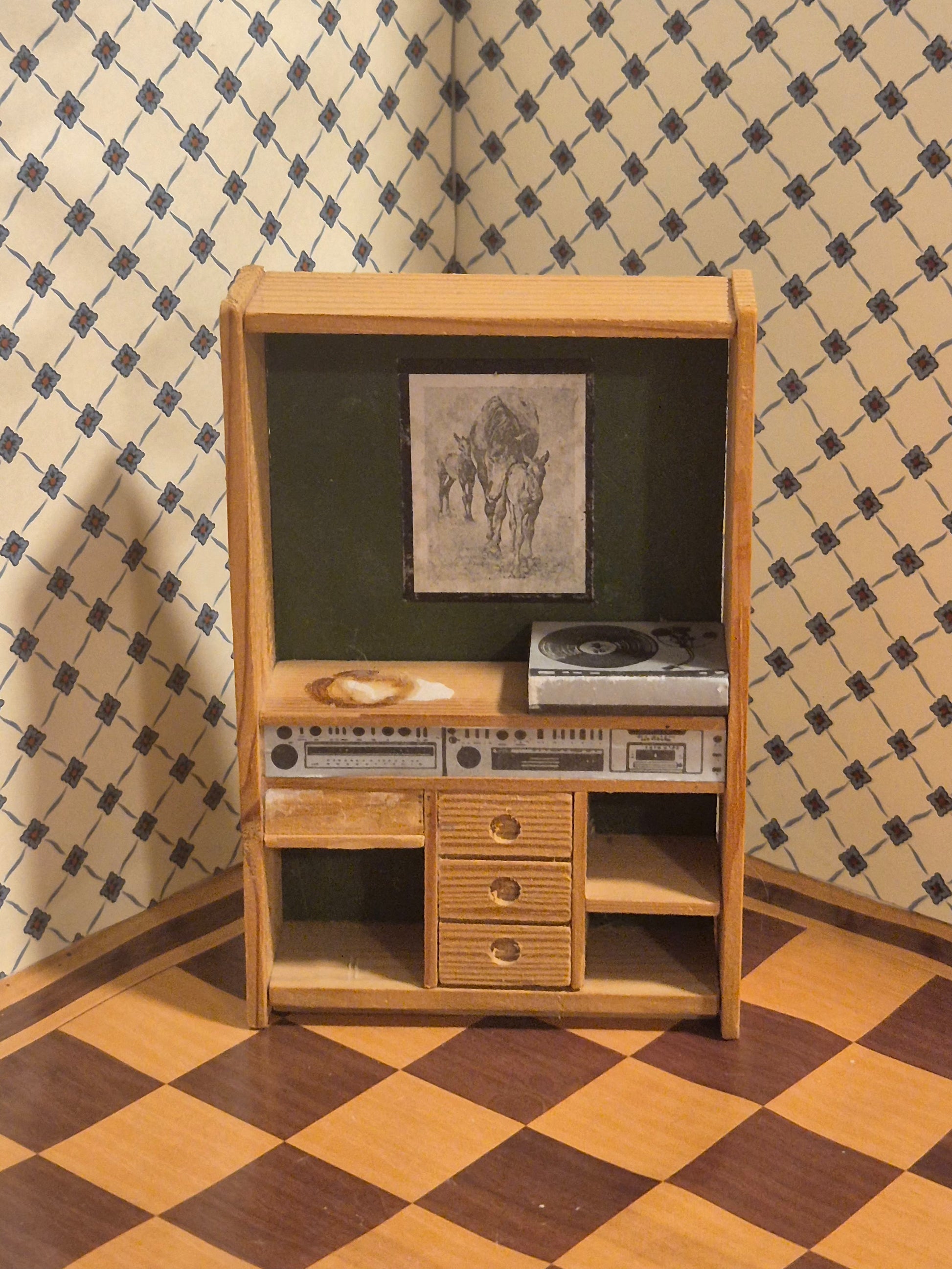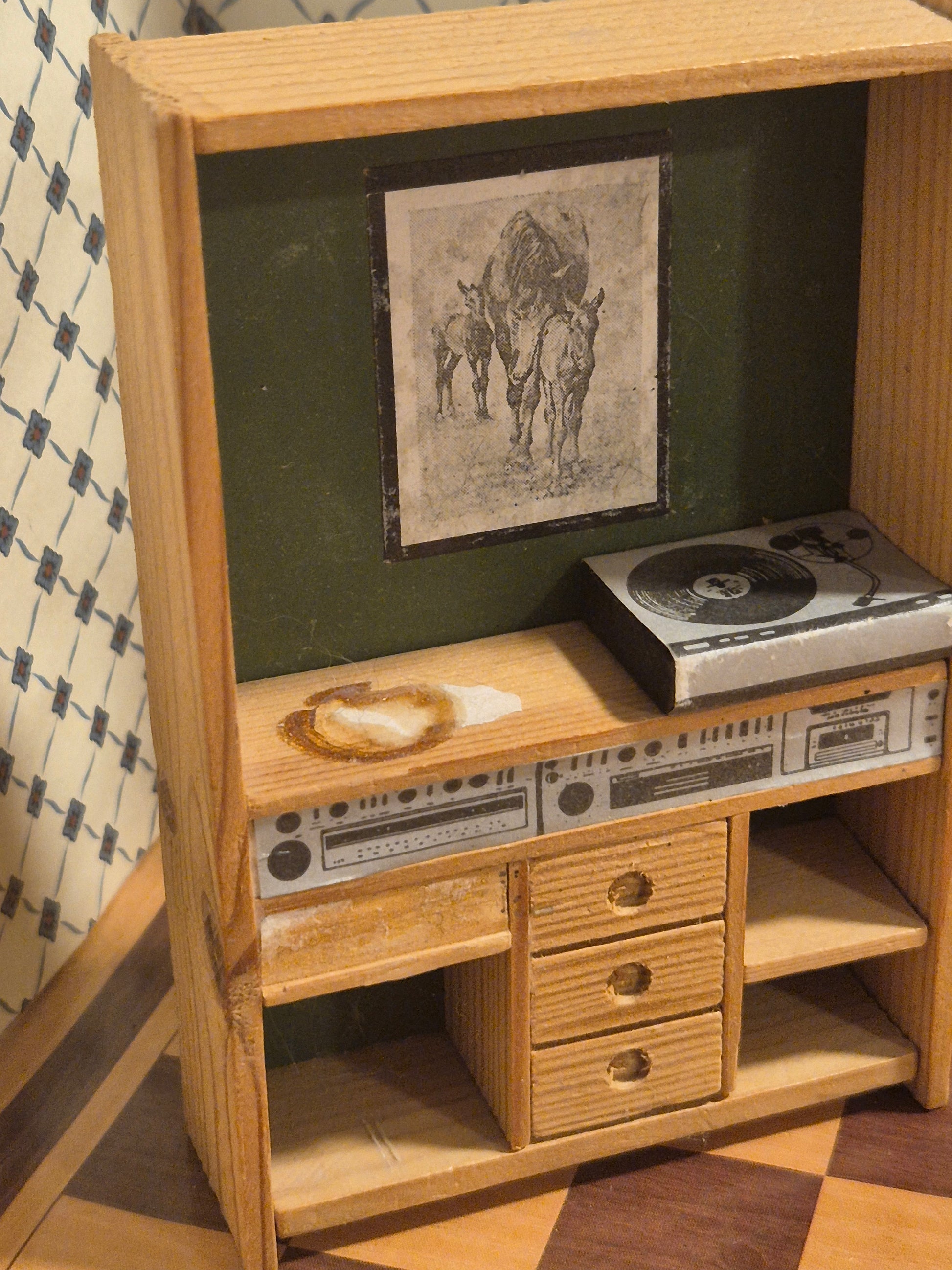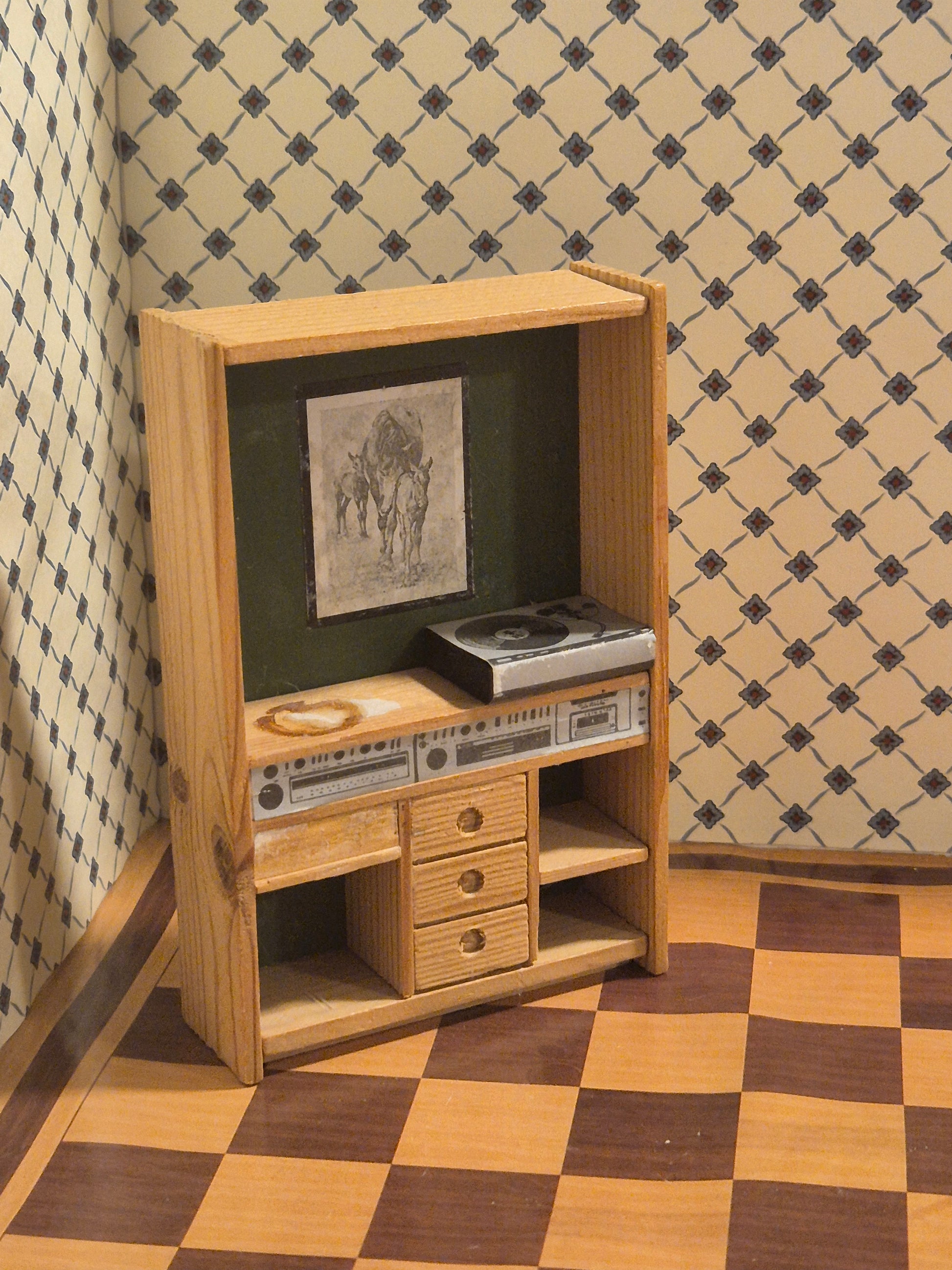 God reol af træ med grøn bagvæg af mærket Lisa af Danmark. Der er afspiller og radio, musikanlæg, dog mangler klistermærke og LP'en.
