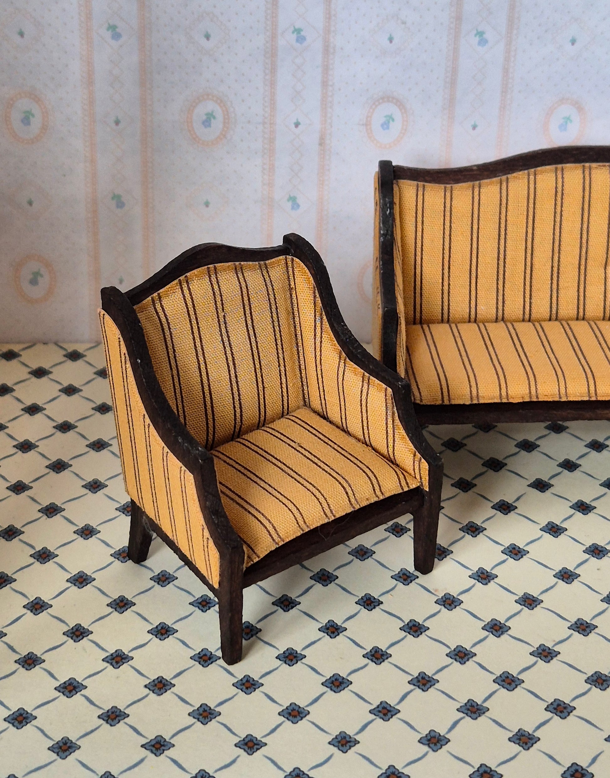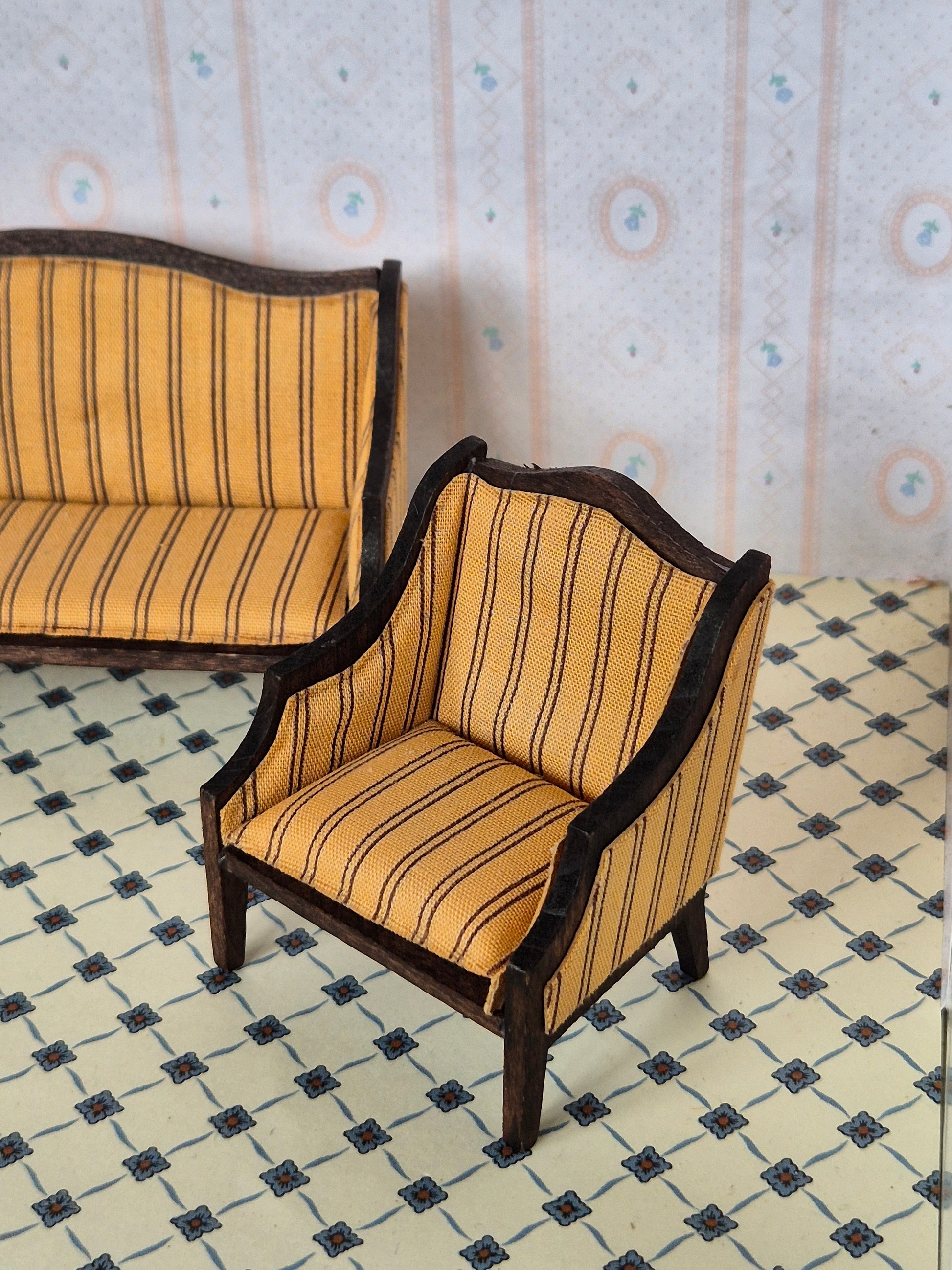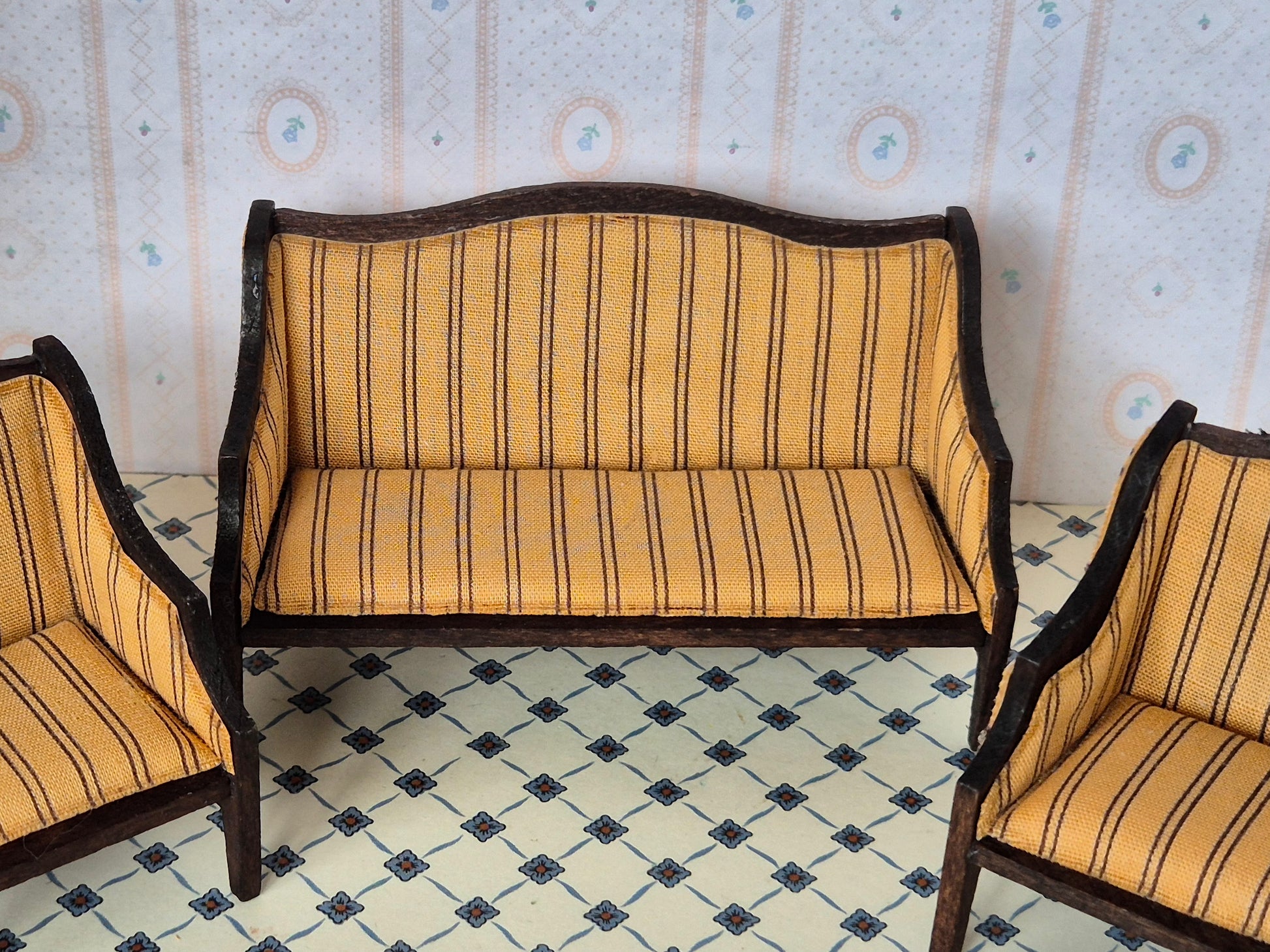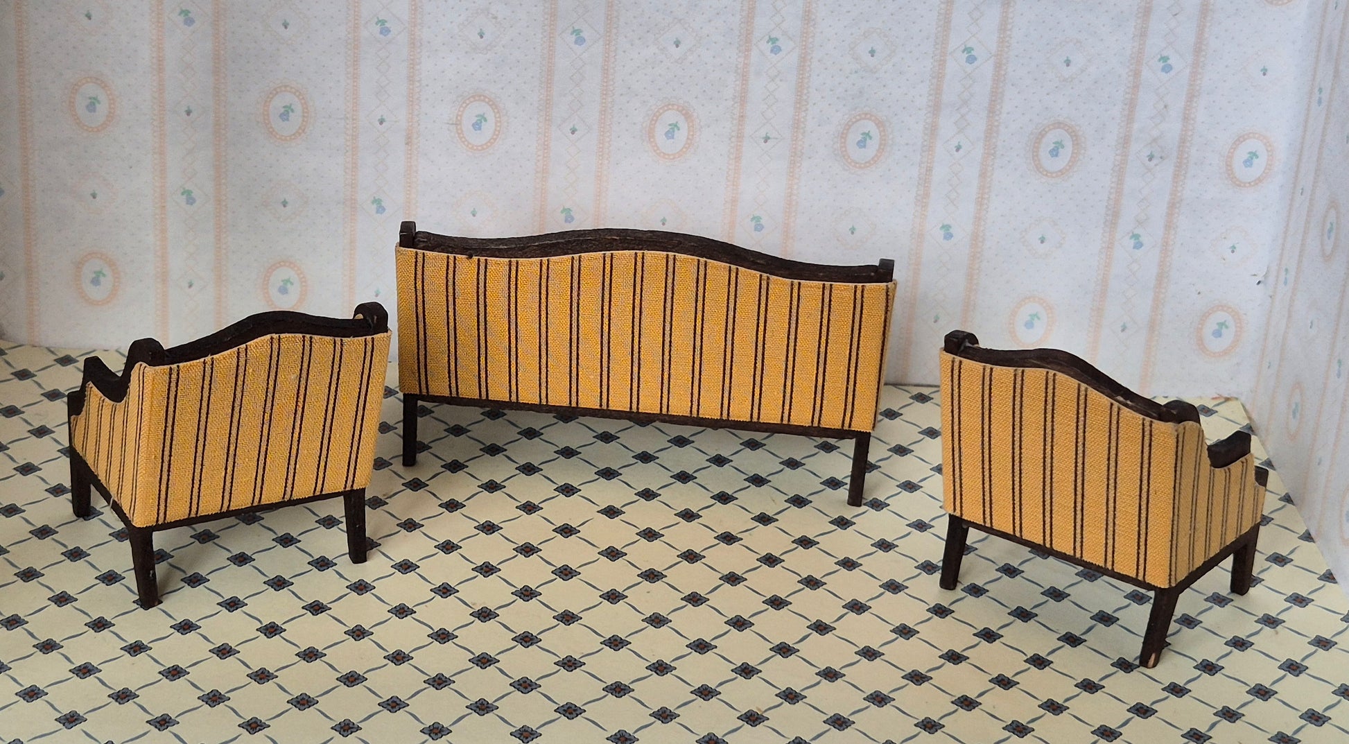 Flot og fint sæt af Royal dukkehusmøbler, sofa og to lænestole af mærket Lisa af Danmark. Det er fra 1970erne.