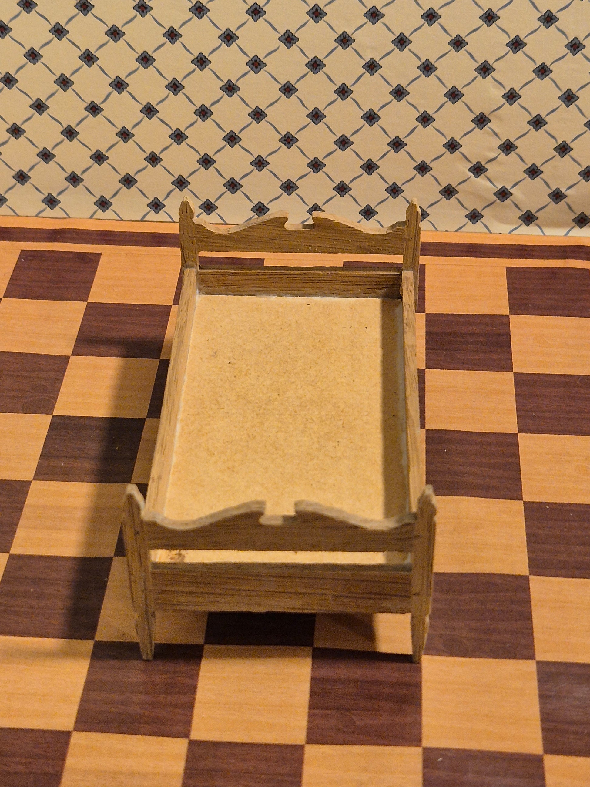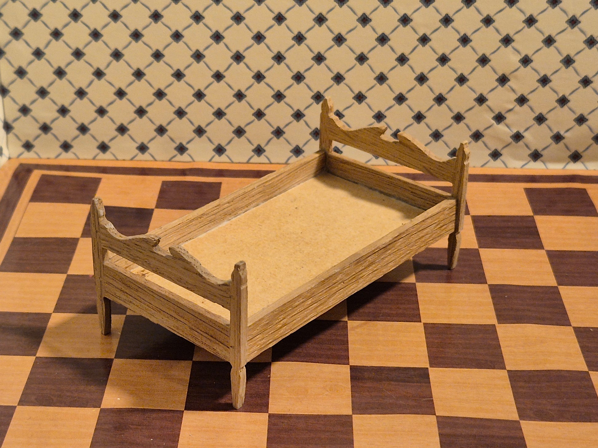 Pæn og god, original og vintage dukkehus enkeltseng i egetræ med fine udskæringer og detaljer af mærket Lisa af Danmark.