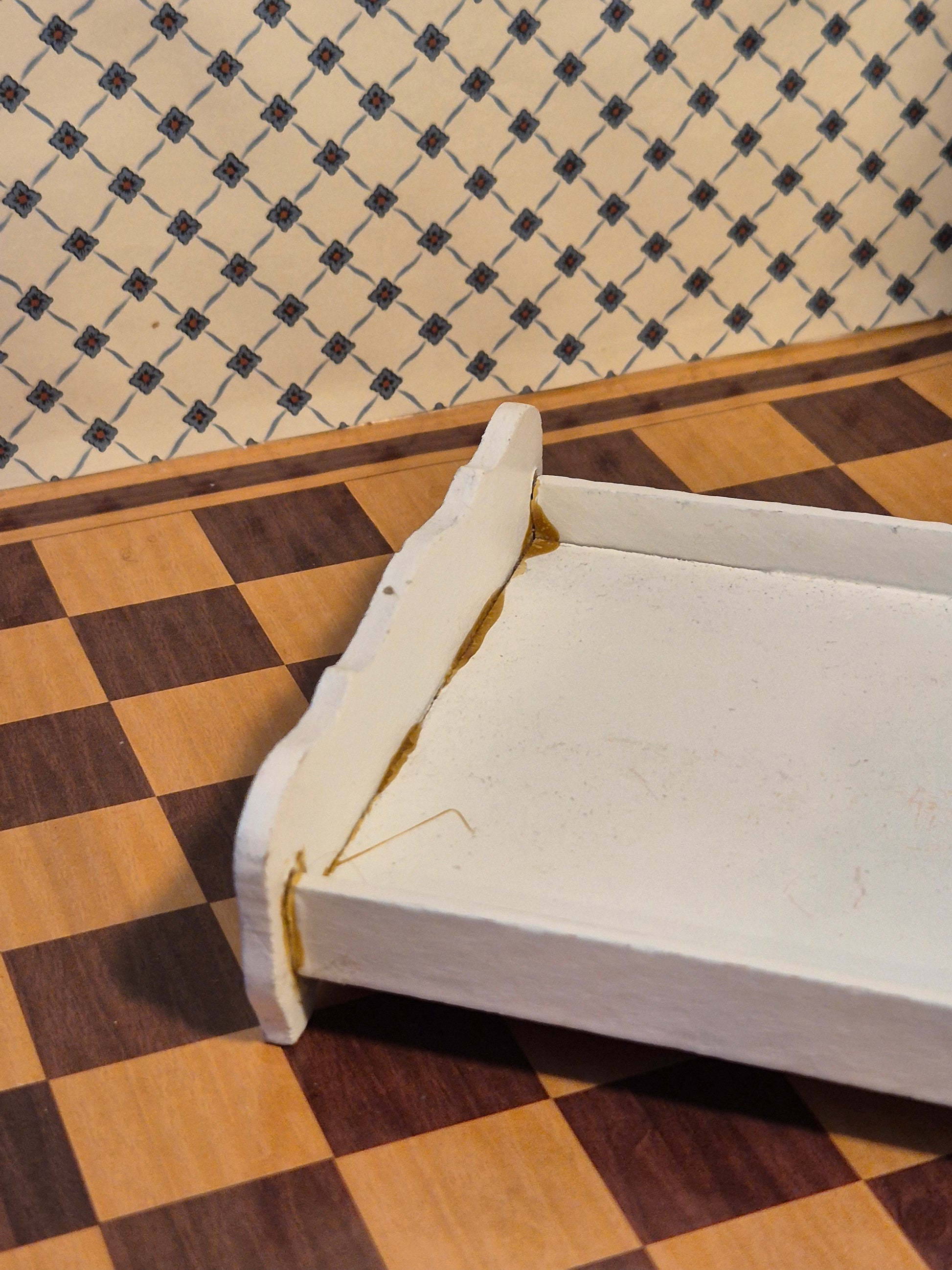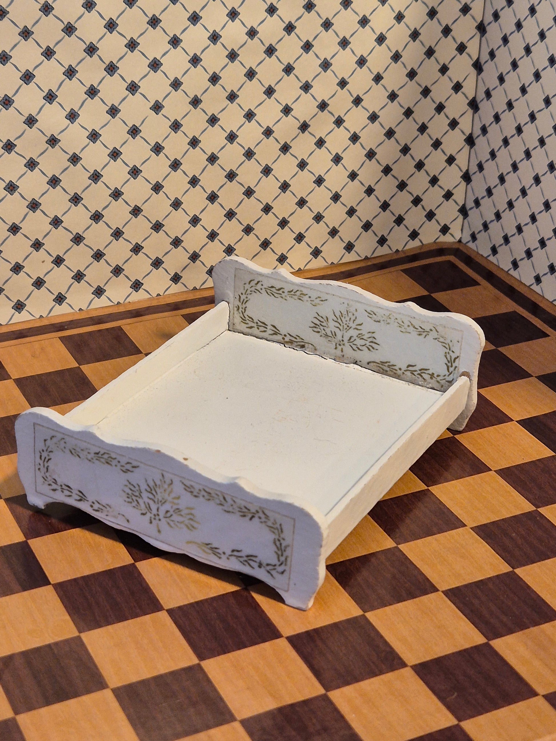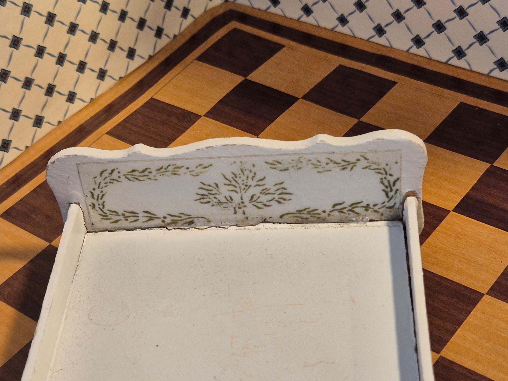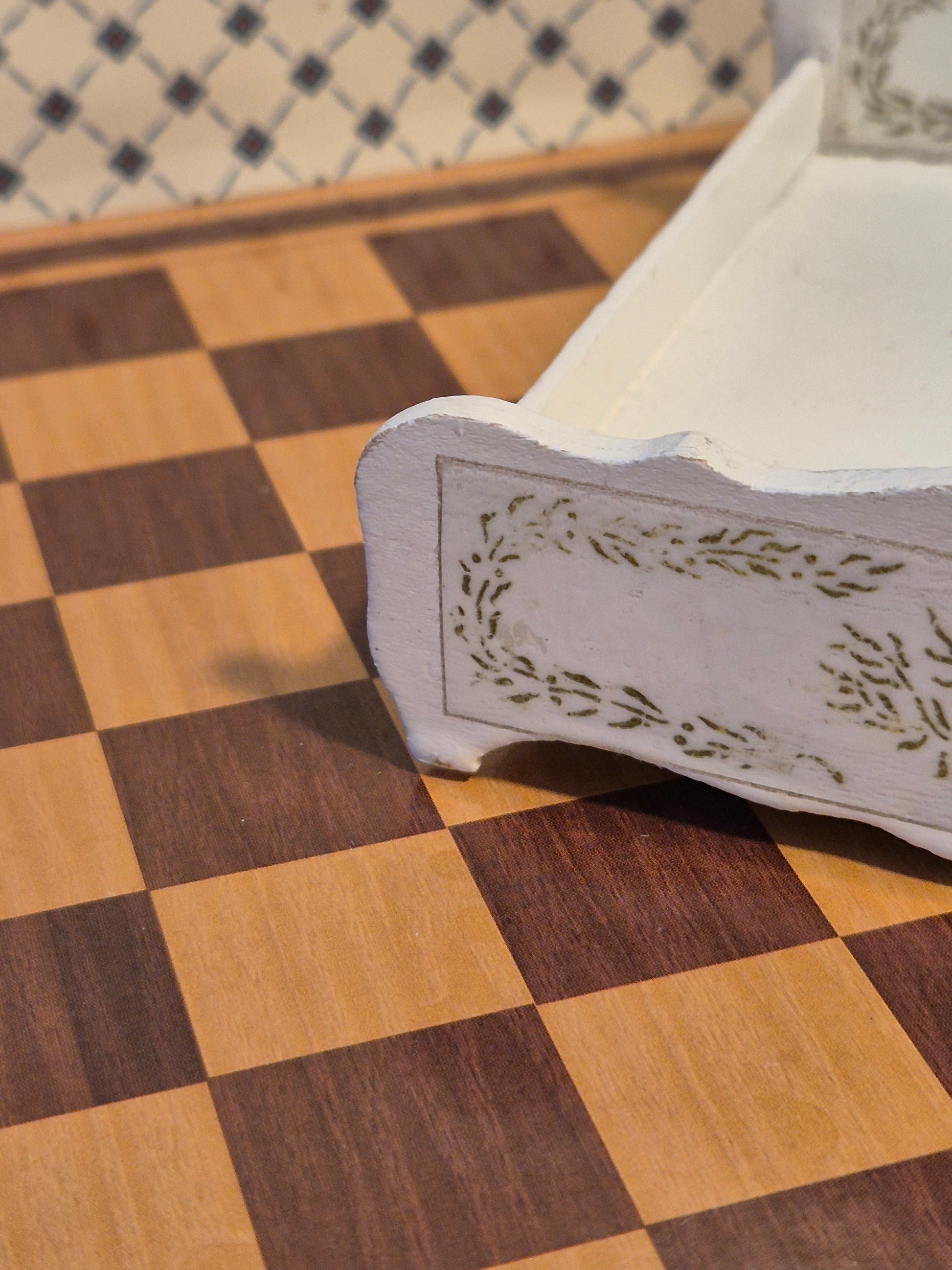 Vintage hvid rokoko seng med limrester og brugsspor af mærket Lisa af Danmark. Den vipper en anelse.
