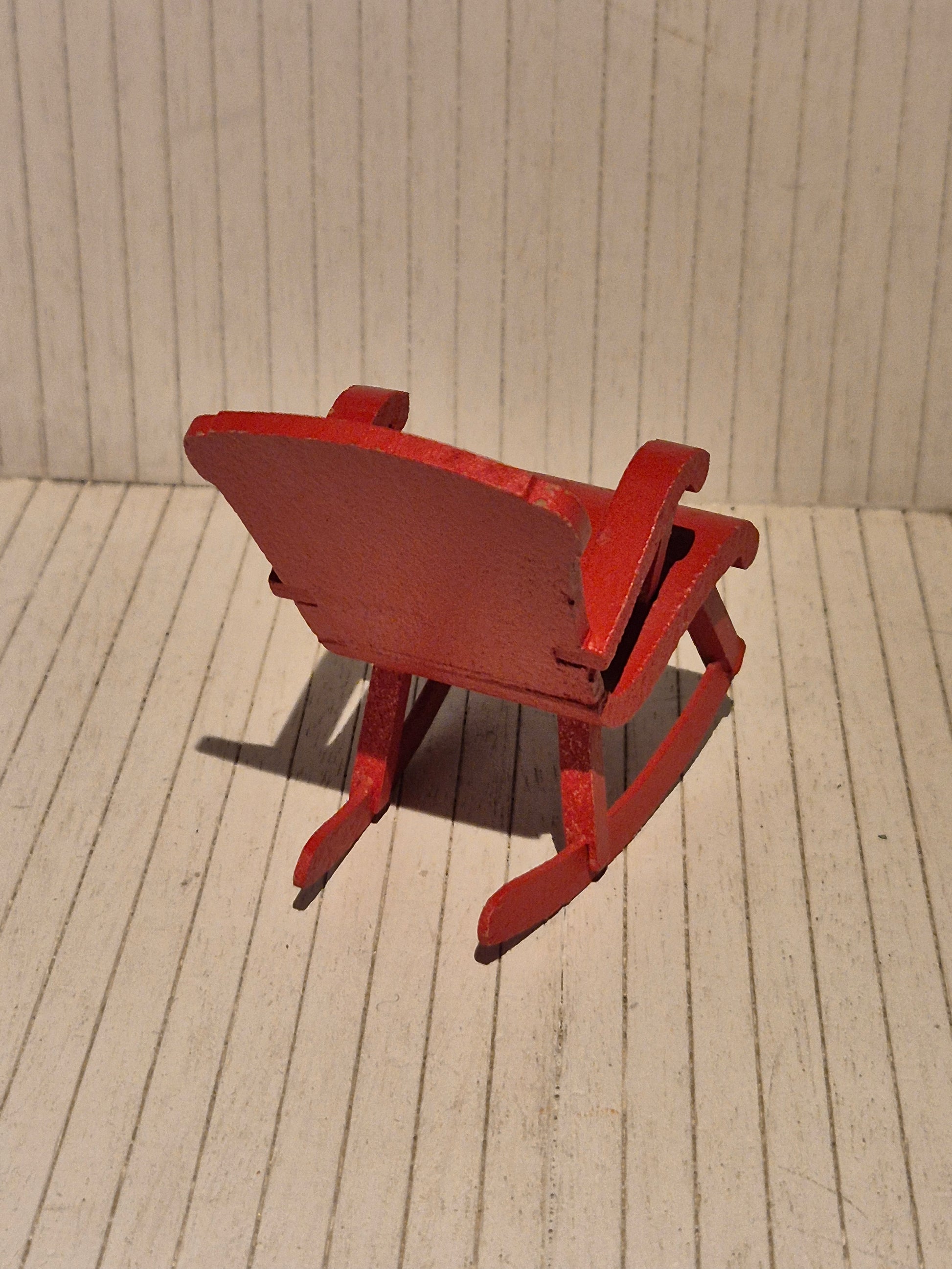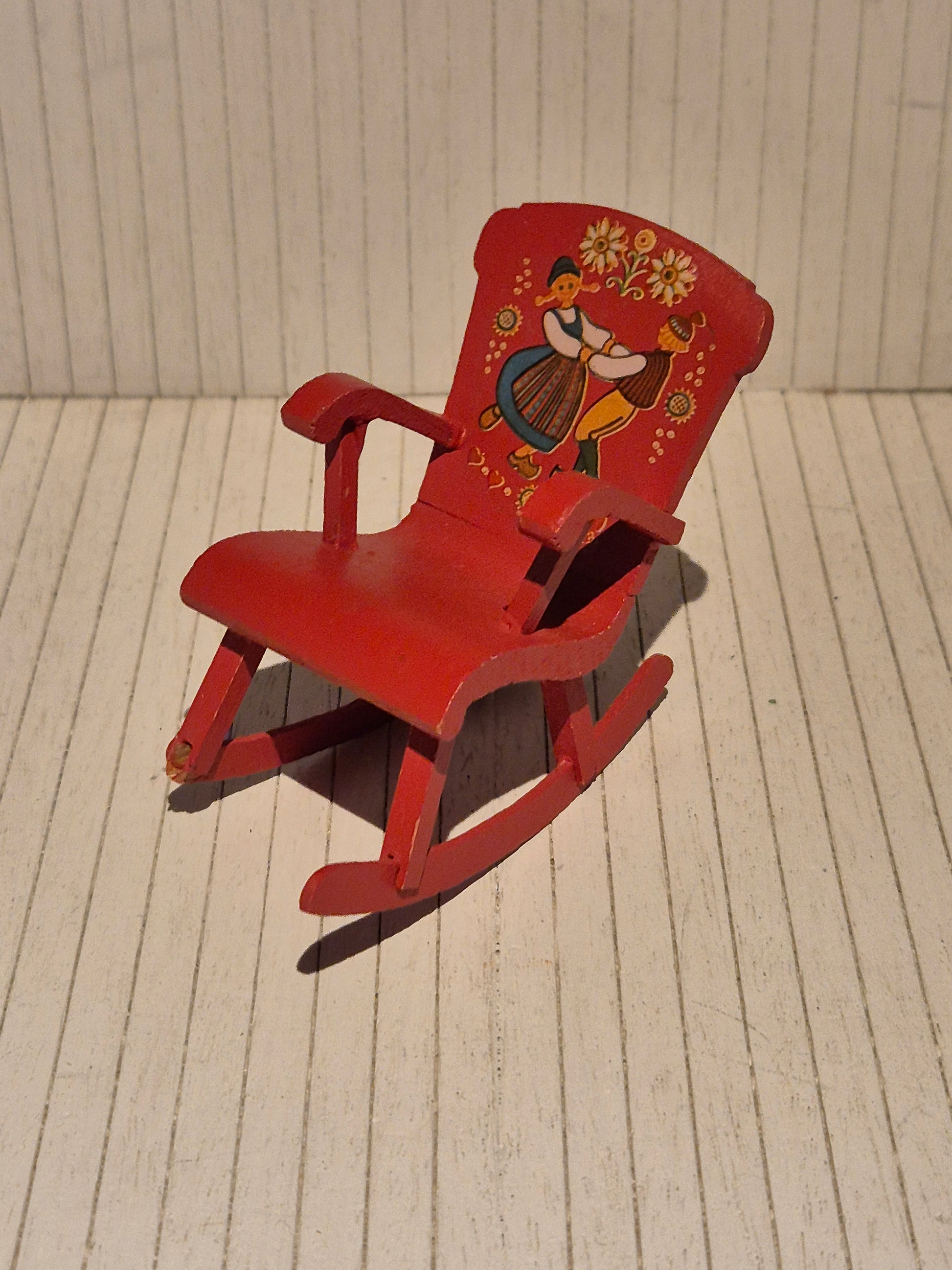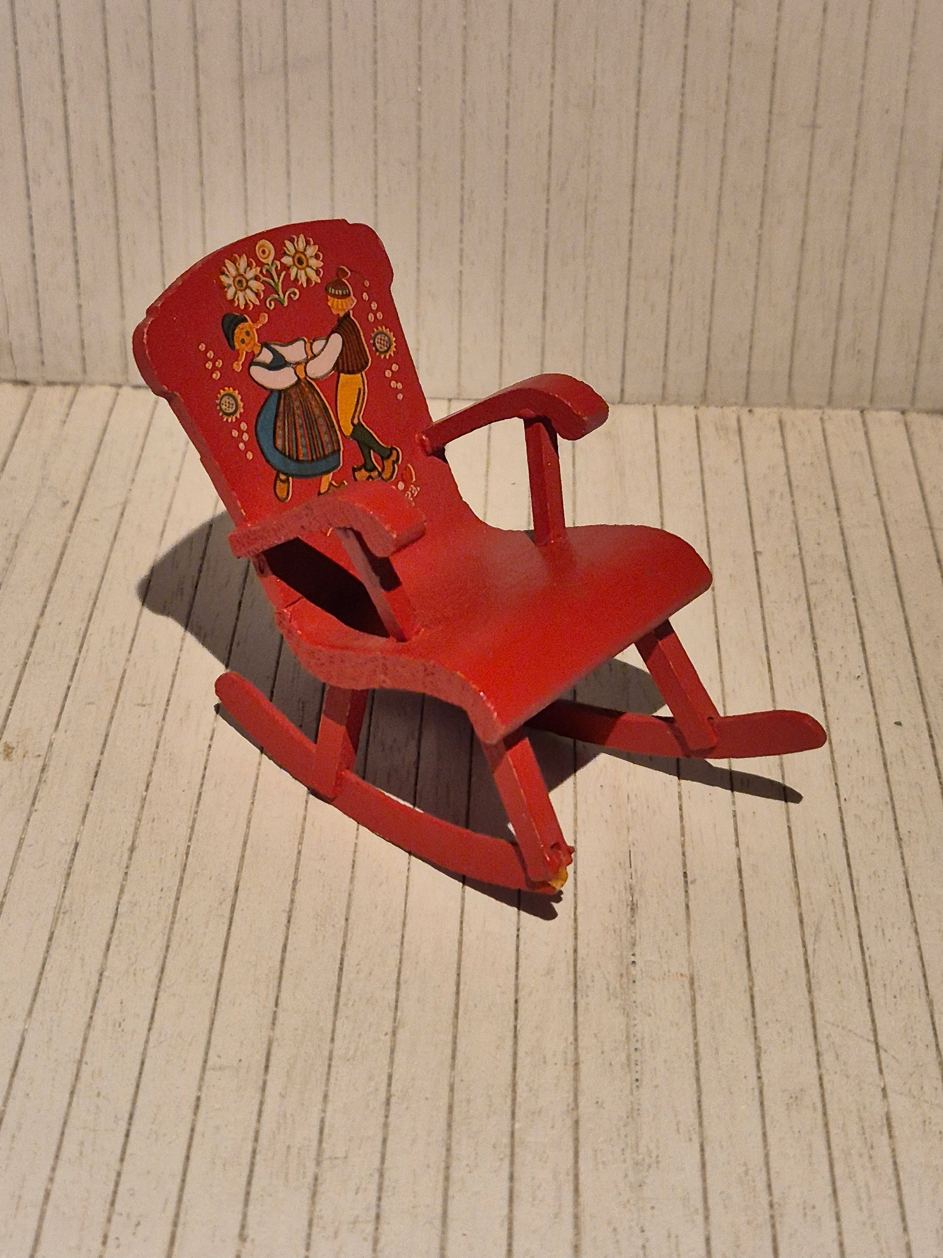 Lundby almue gyngestol i klar rød nuance med almue-motiv. Den er pæn og brugt. Der er knækket et stykke af yderste del af den ene mede.