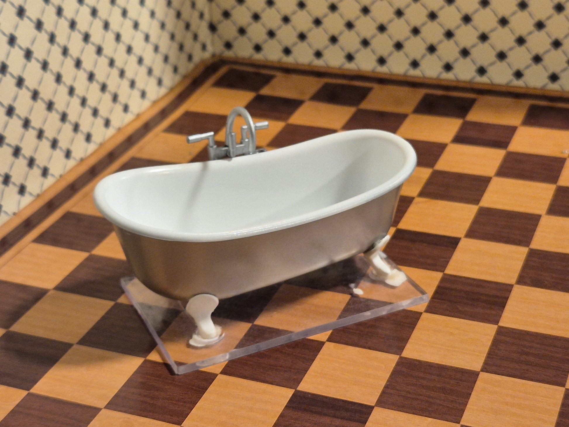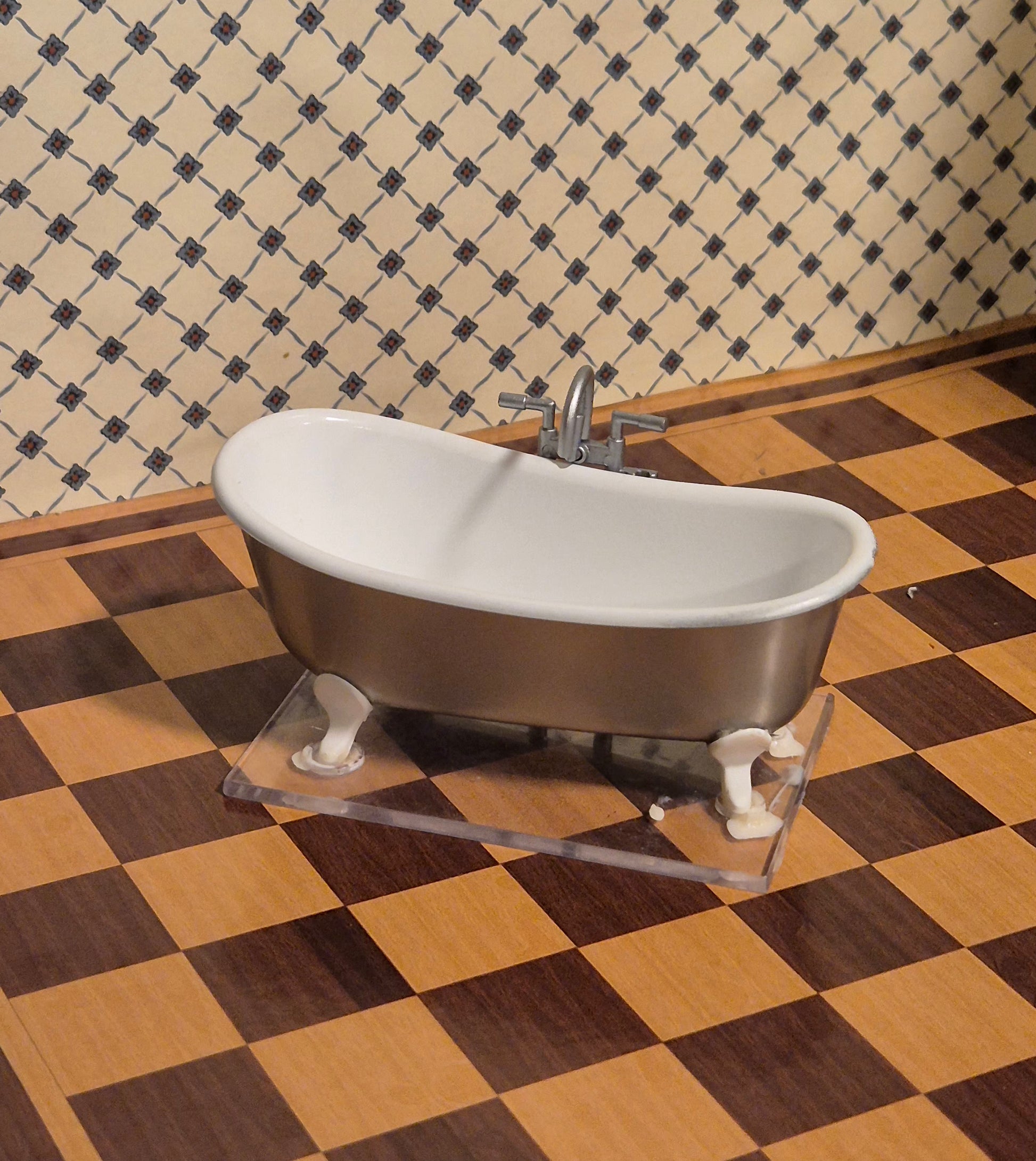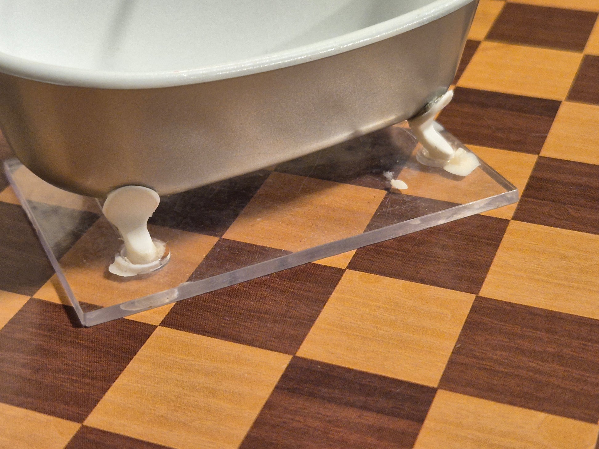 Nyere Lundby badekar af plastik, der er blevet limet på bundpladen. Der er tydelige spor af limen.