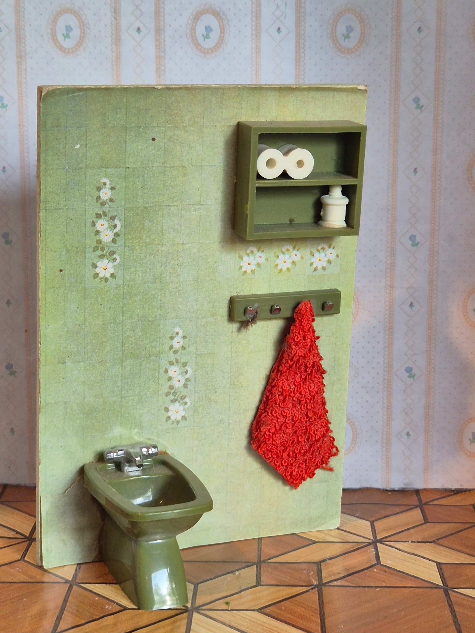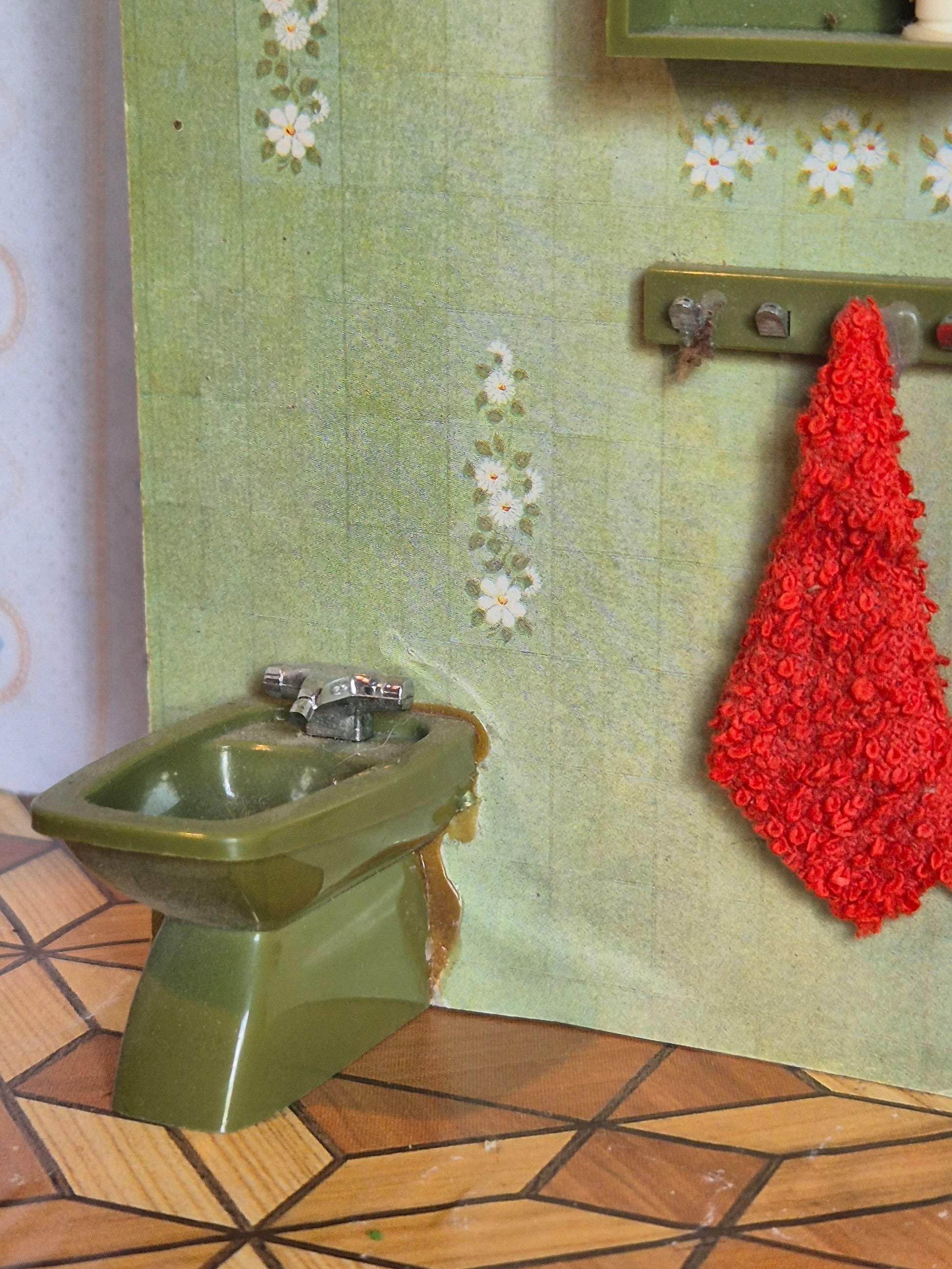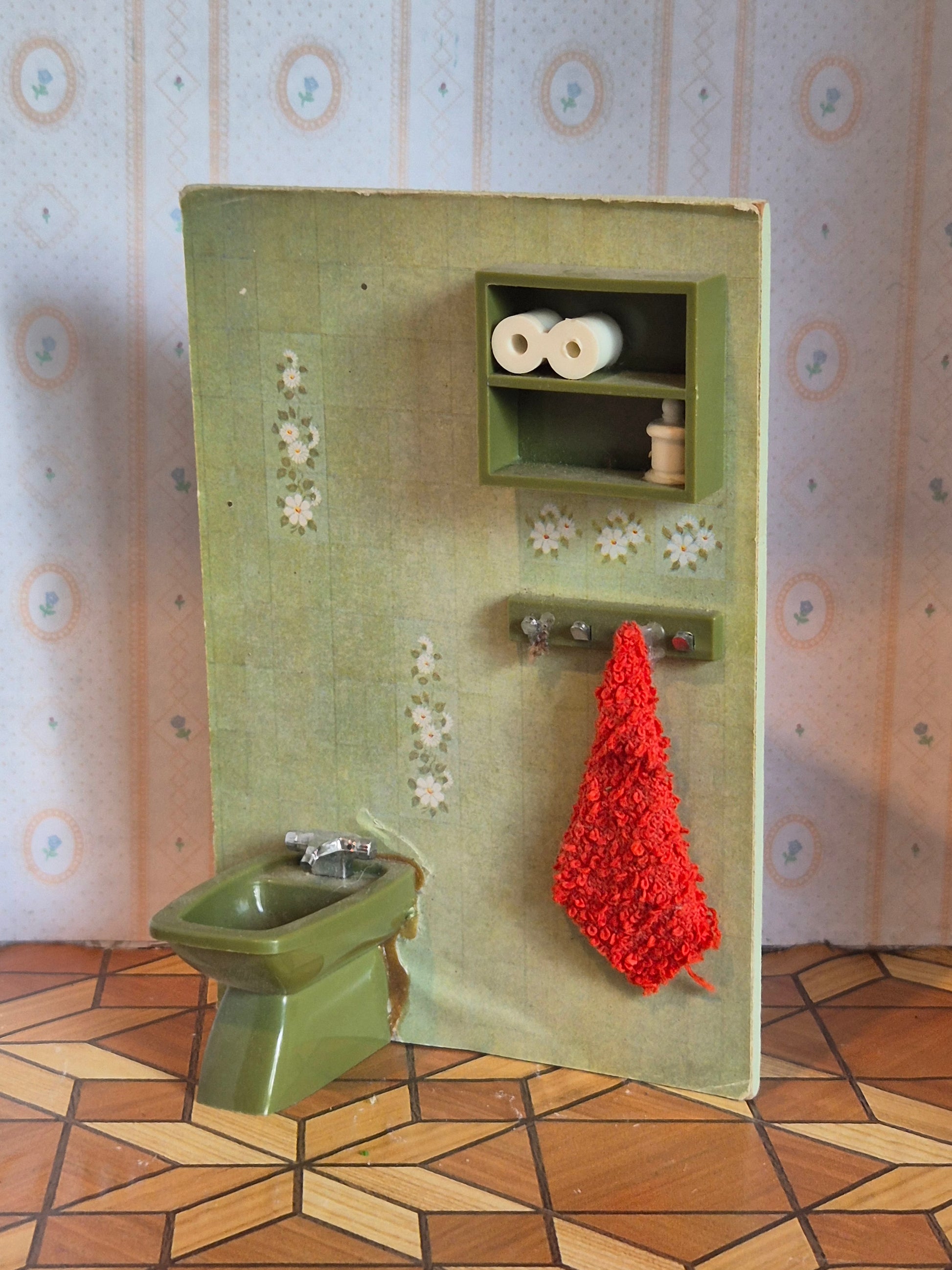 Lundby grønt badeværelses del med bidet og håndklæde. Der mangler et håndklæde og der er limrester ved toilettet, ellers er den ret pæn.