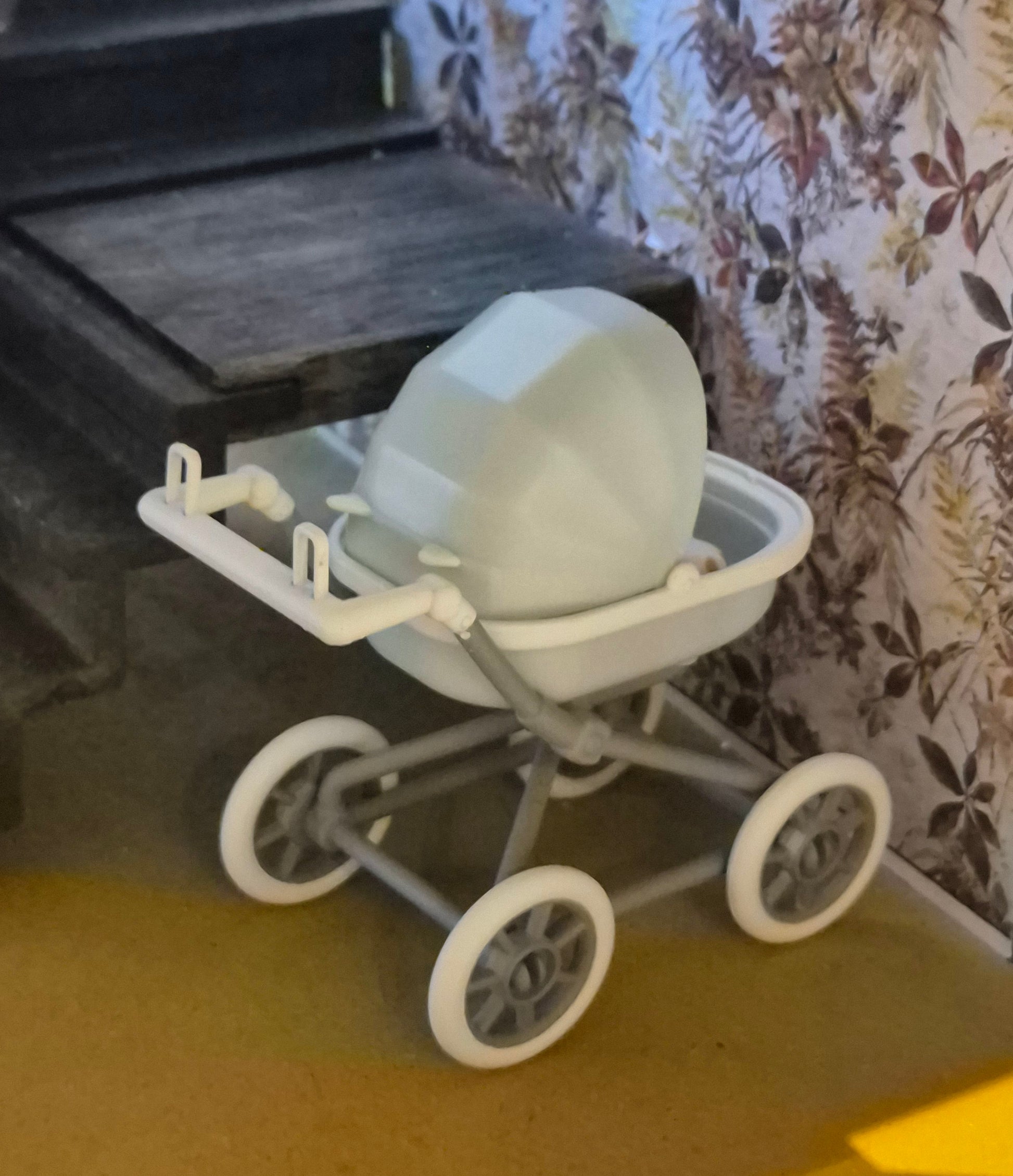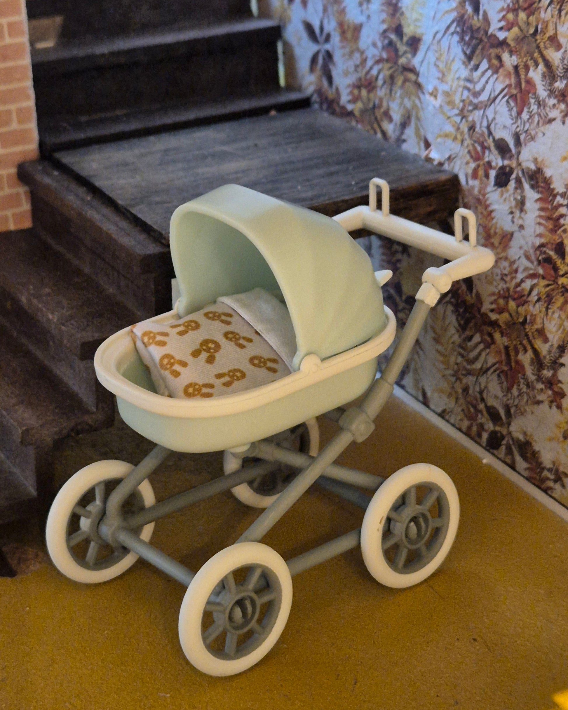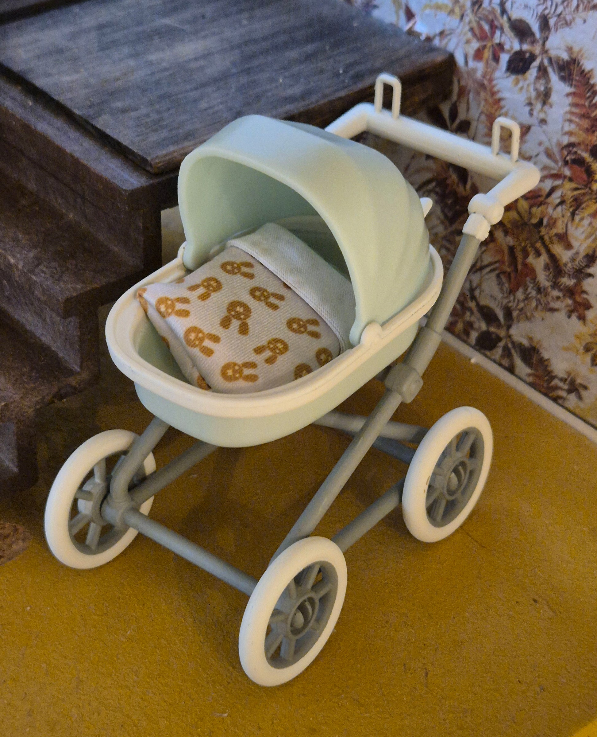 Den er så god som ny. Lavet af plast. Der medfølger en lille sovepose af stof til lundby baby-dukke. Vil stå fint på terrassen, i dukkehus haven eller udenfor.