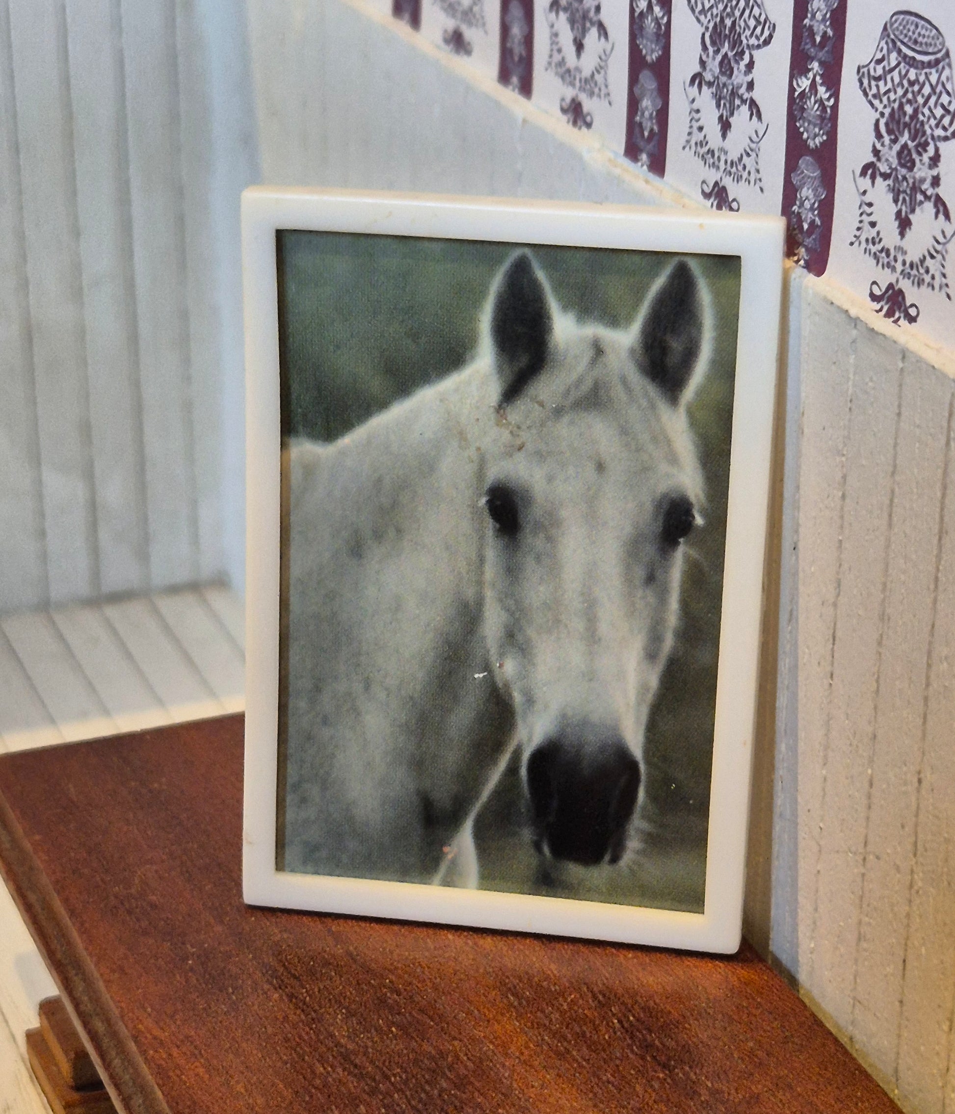 Smukt billede af en hest i hvid ramme. Det er af dukkehusmærket Lundby. Virkelig pænt og i god stand.