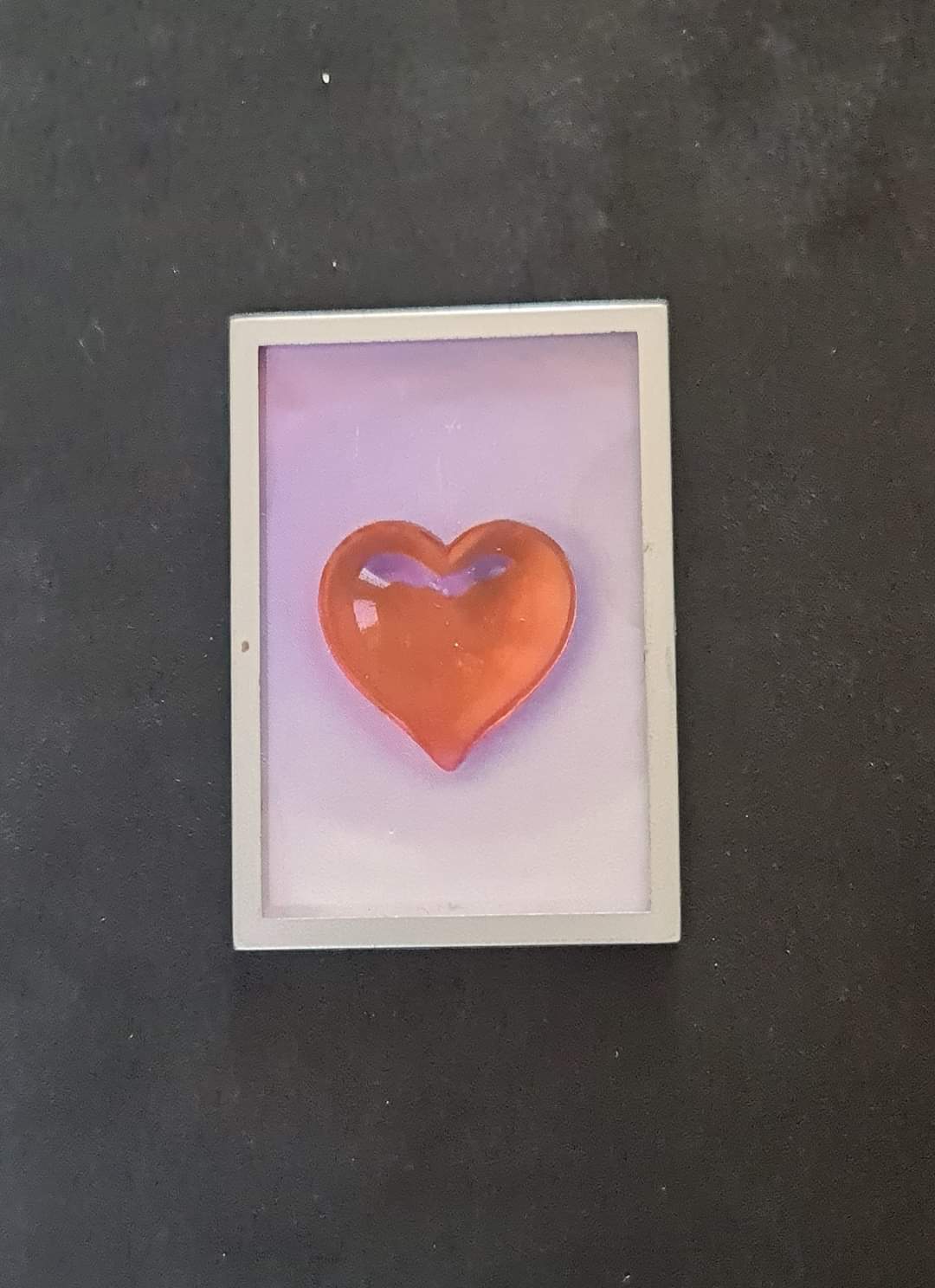 Fint billede af rødt hjerte med lilla baggrund i grå ramme. Det er af dukkehusmærket Lundby. Virkelig pænt og i god stand.