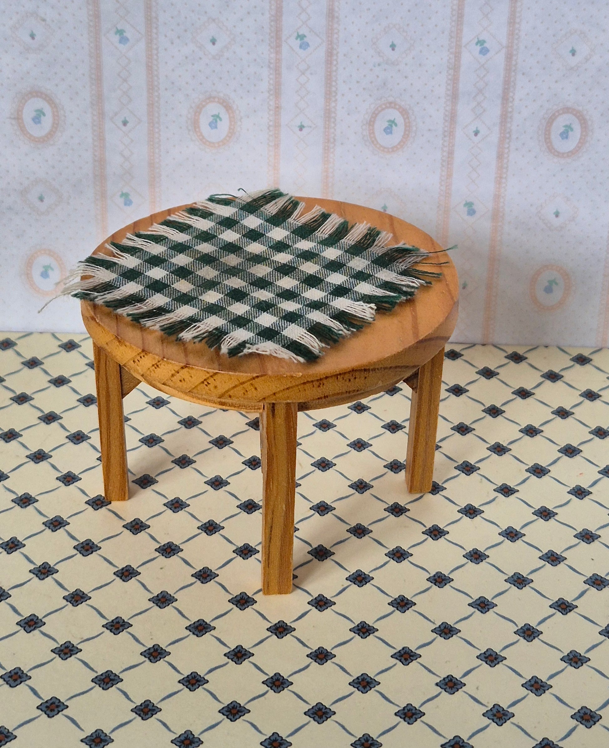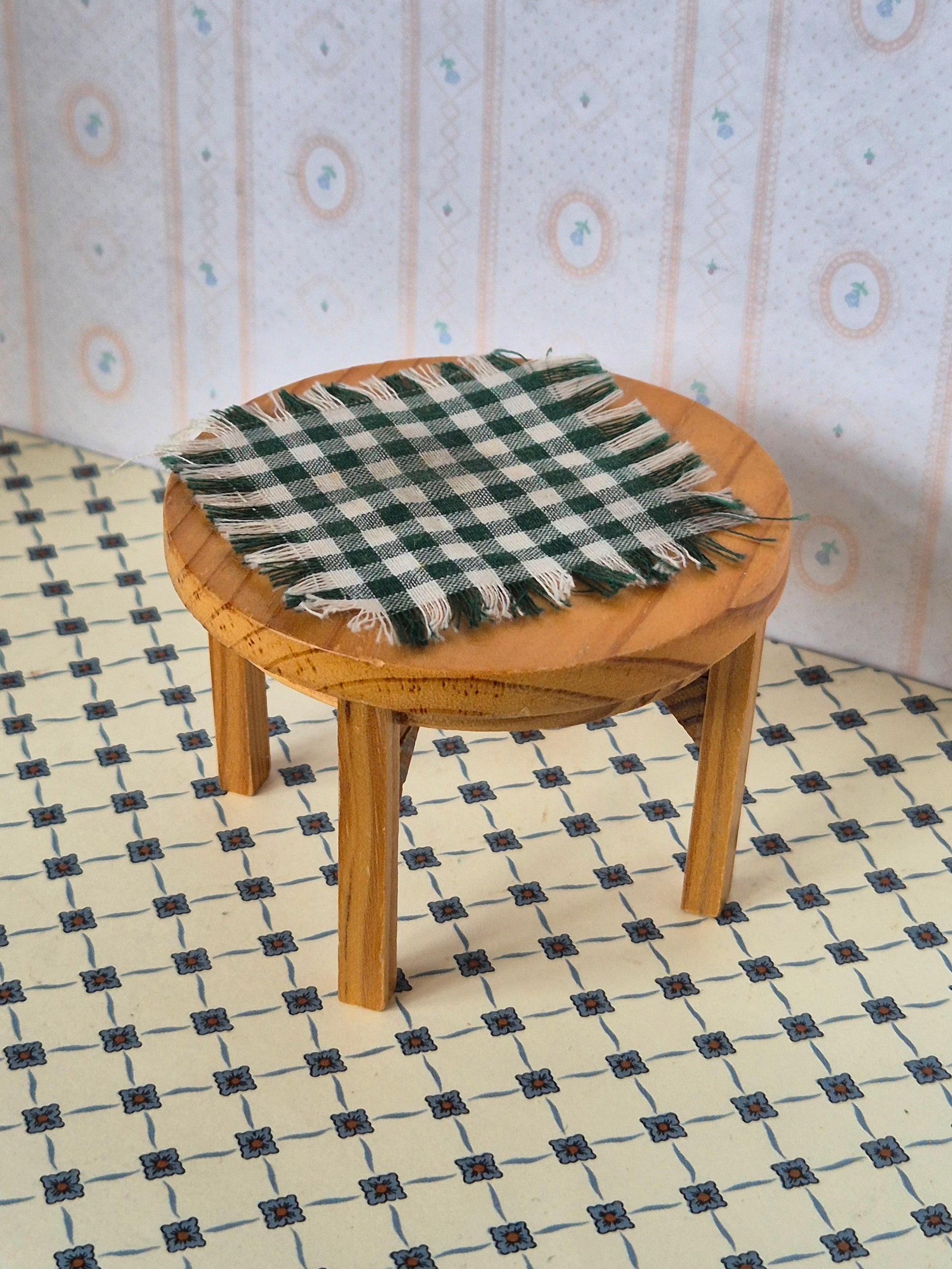 Fint rundt Lundby bord med grøn og hvid ternet dug. Udmærket stand