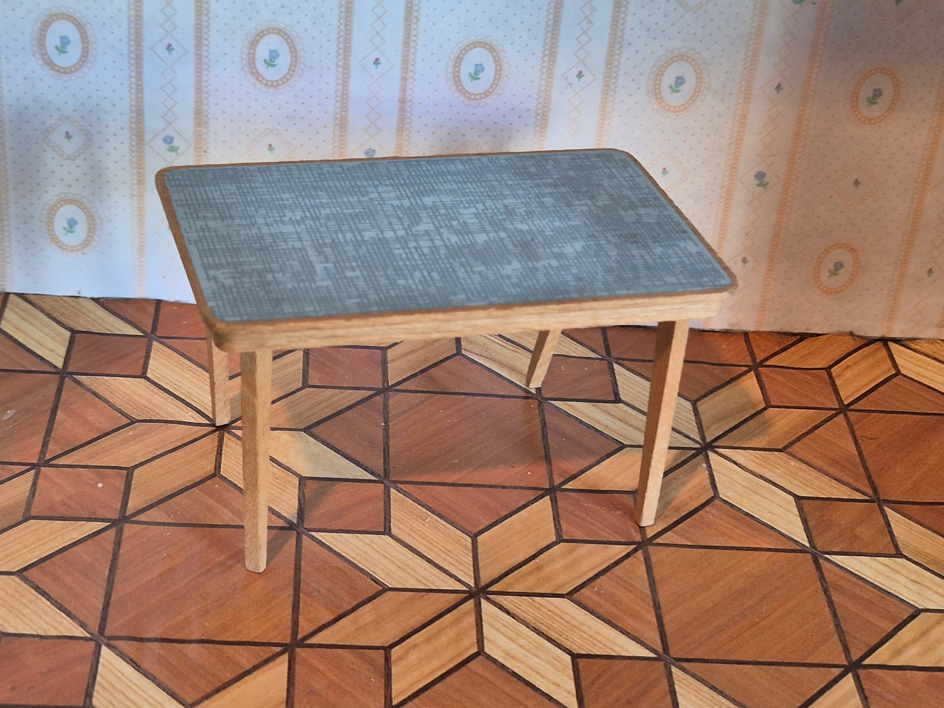 Lundby spisebord, bord af træ med blå bordplade. Det er af træ. Benene er limet på, sidder enkelte løse. Bordet vipper.