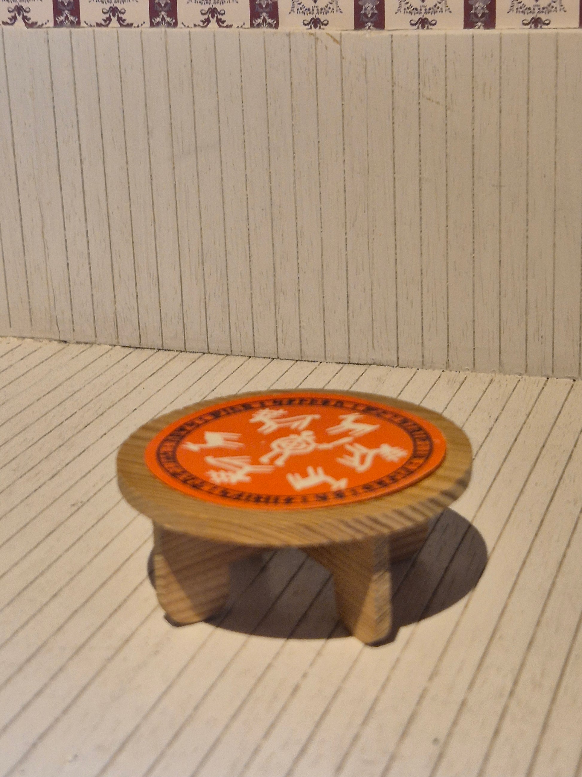 Fint rundt bord til børneværelset, det er lavt og pænt. Ubehandlet træ med stor papir-dug, der er orange med hvide motiver.
