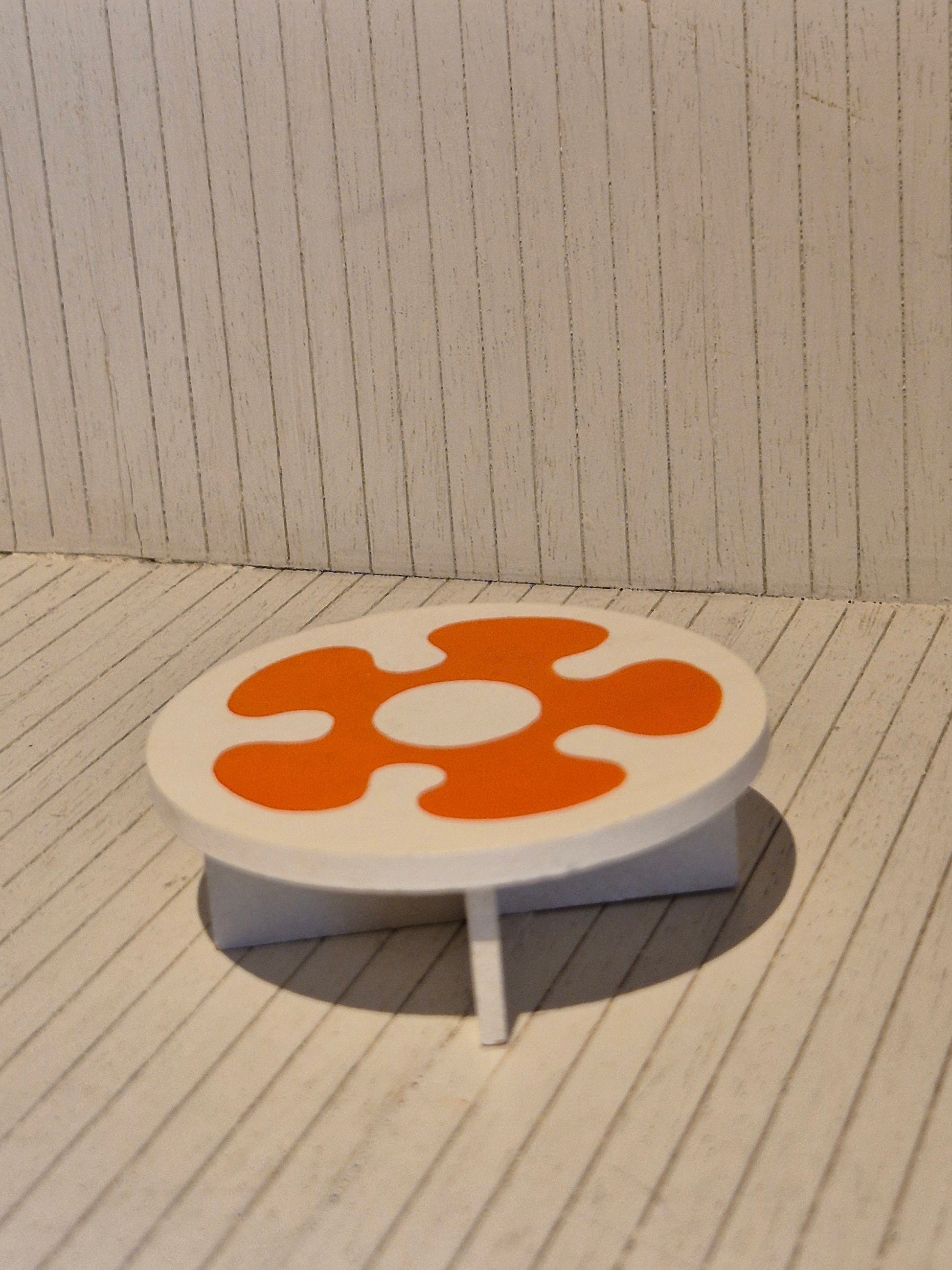 Fint rundt bord til børneværelset, det er lavt og pænt. Hvidt træ med stor orange blomster-motiv i midten.