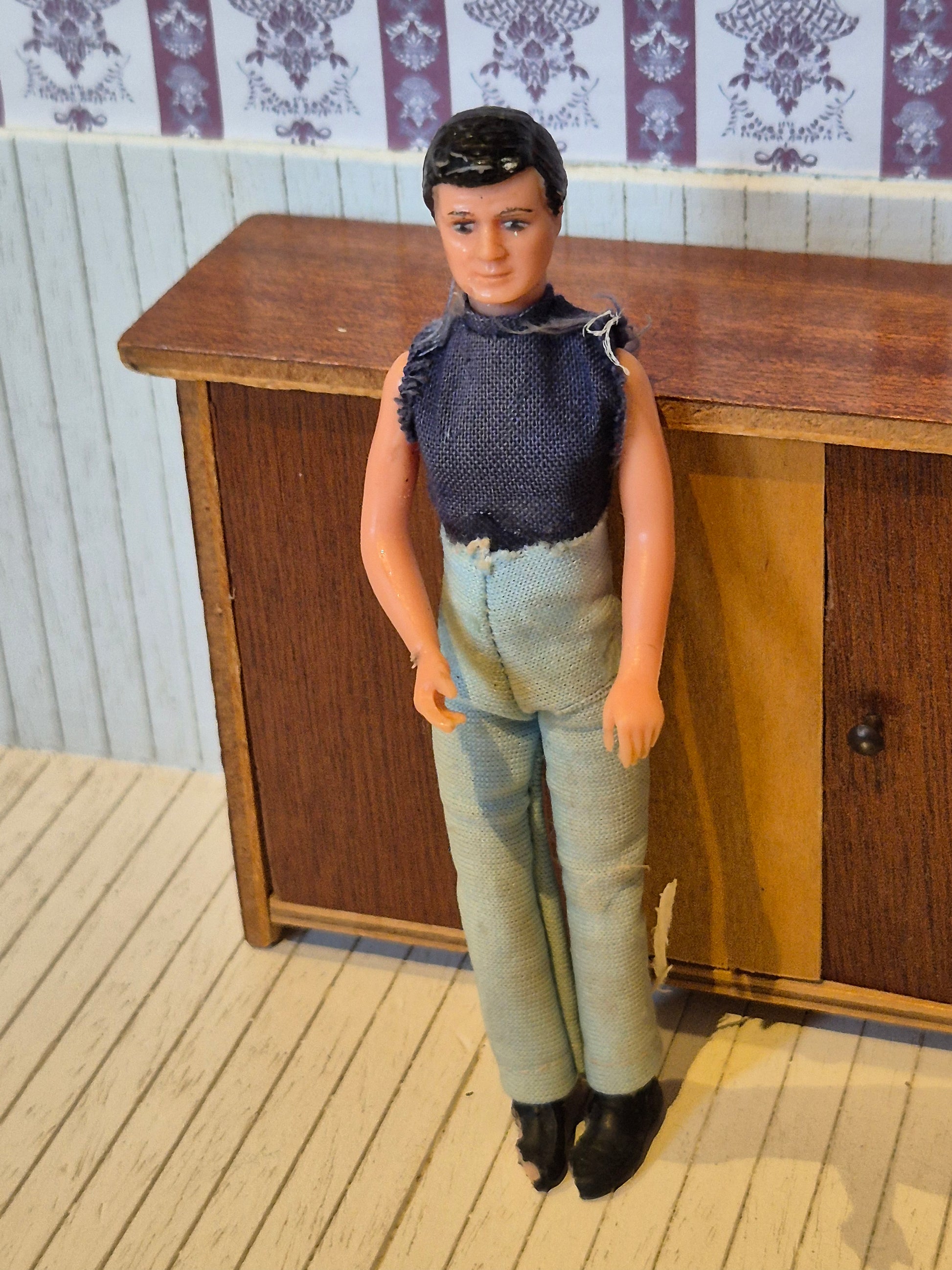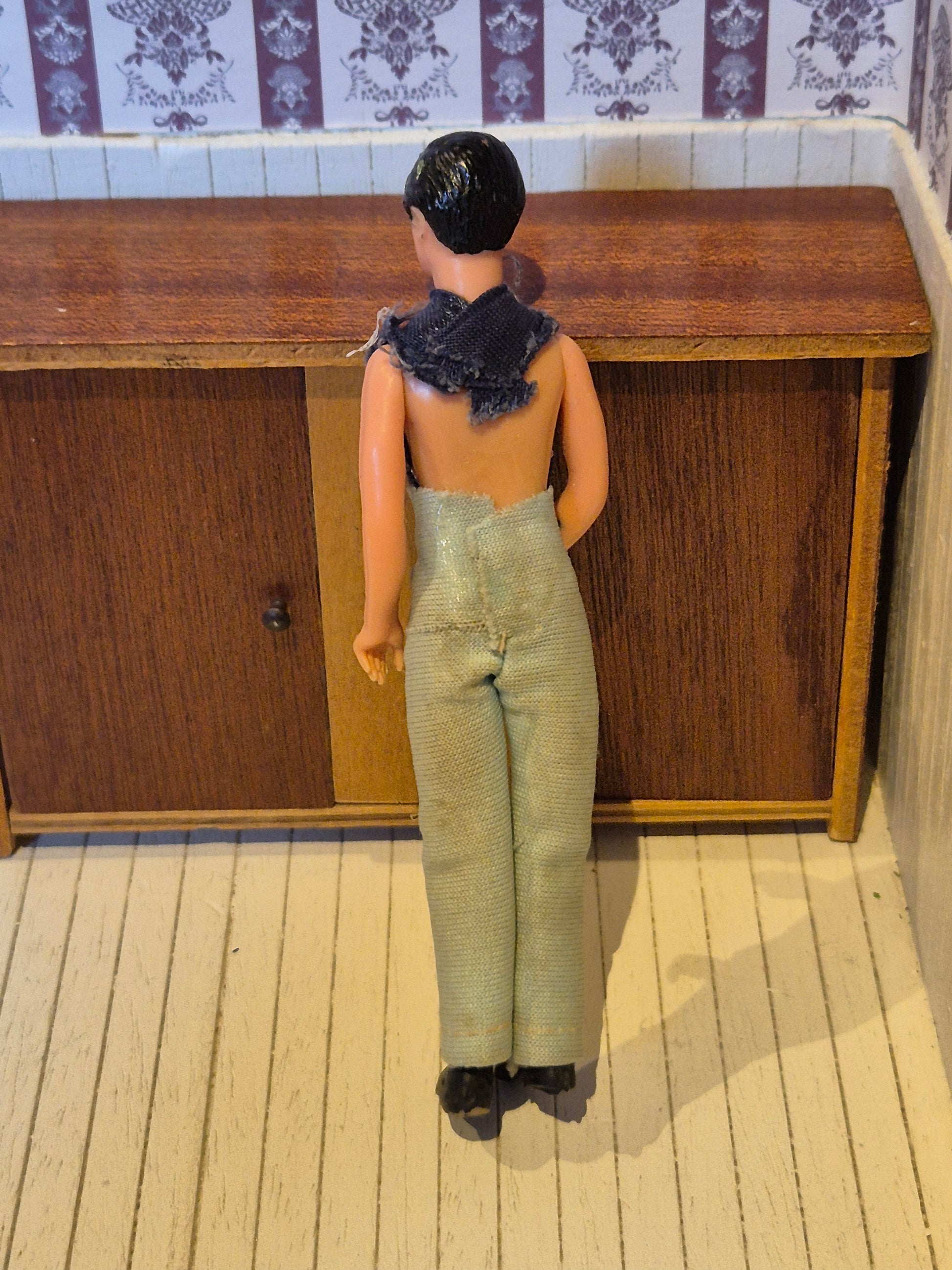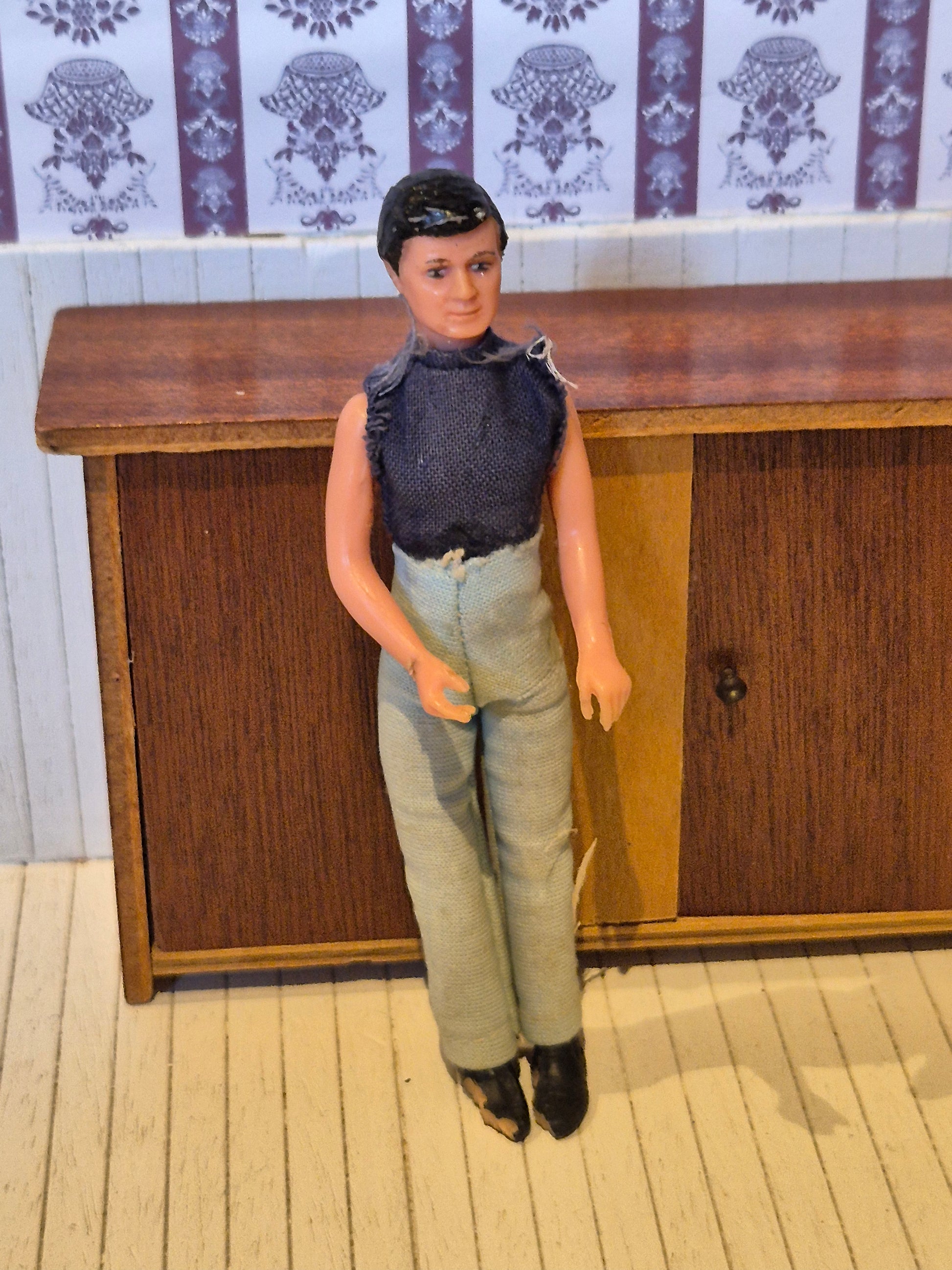 Dukkehus dukke af mærket Lundby. Den er egentlig pæn, dog brugt og det kan ses. Der er patina og der mangler tøj dele. Han er af gummi med ståltråds-stel.