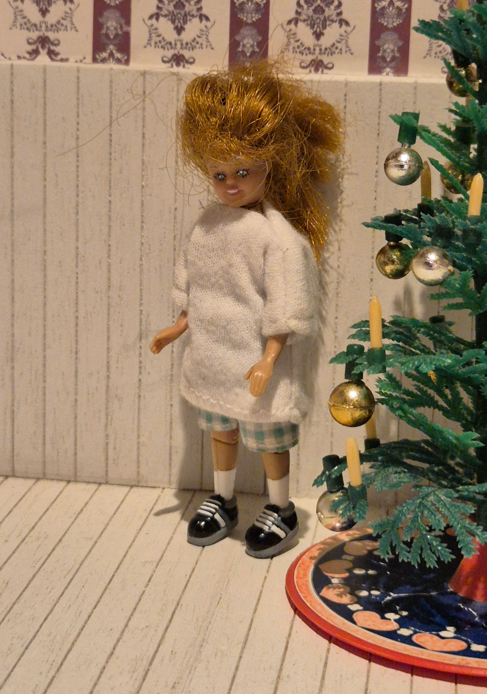 Sød pige dukke med lysebrunt hår. Tøjet er originalt, men muligvis ikke hendes oprindelige.