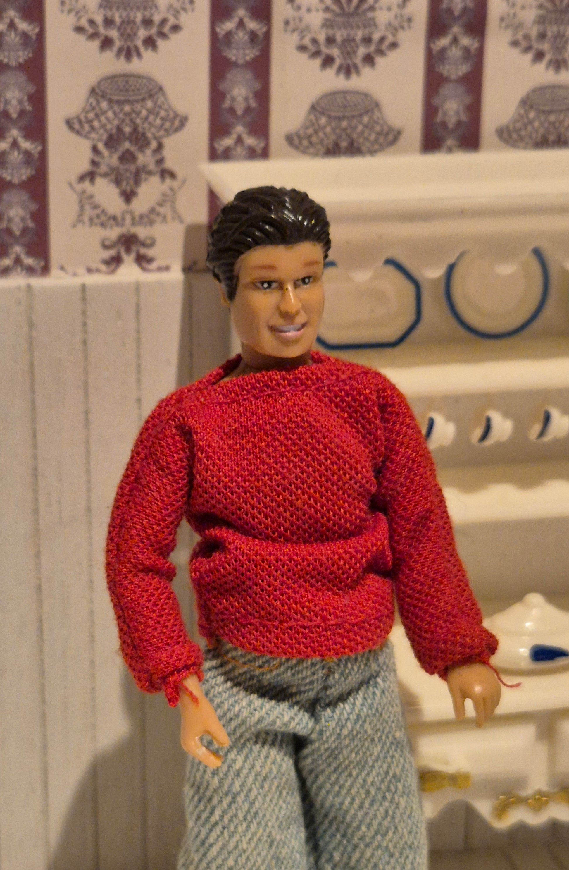 Fin far dukke med mørkt hår, rød bluse og denim jeans. Tøjet er originalt.